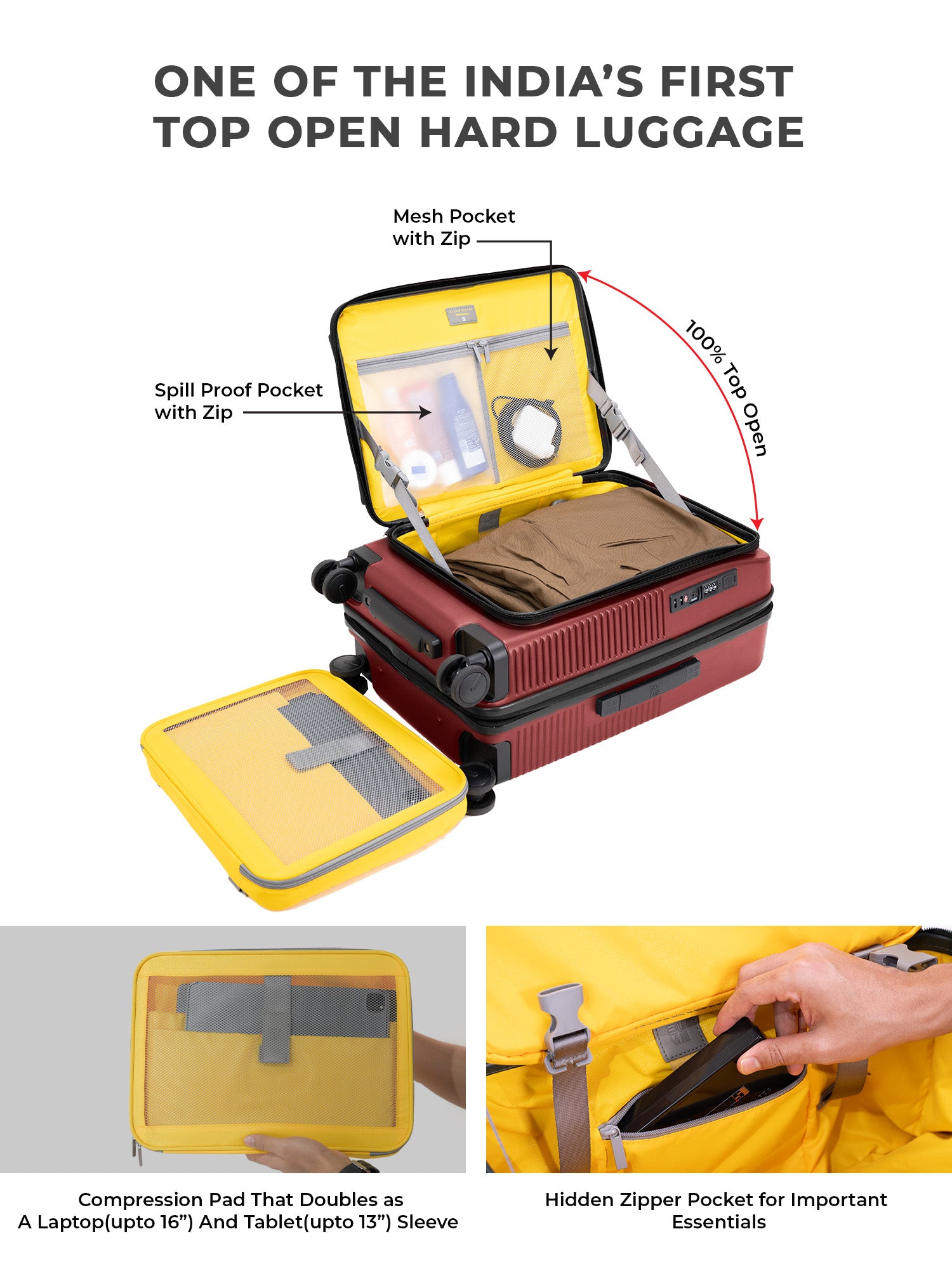 - The EUME Aero Top-Open Hard Shell Luggage Set is built for modern travellers who value smart packing, durability, and everyday ease. Available in 20 inch cabin, Aero features an innovative 100 percent top-opening design that allows full access to your belongings even in compact hotel rooms and small living spaces. This makes it one of India’s leading top-open hard shell luggage solutions.