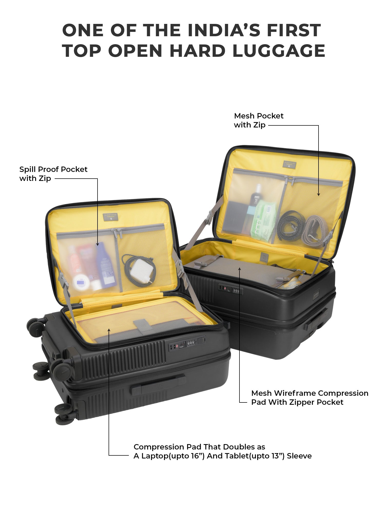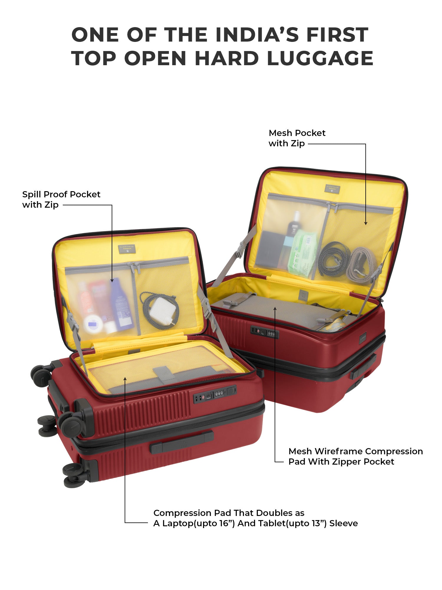 - The EUME Aero Top-Open Hard Shell Luggage Set is built for modern travellers who value smart packing, durability, and everyday ease. Available in 20 inch cabin, 24 inch medium, Aero features an innovative 100 percent top-opening design that allows full access to your belongings even in compact hotel rooms and small living spaces. This makes it one of India’s leading top-open hard shell luggage solutions.