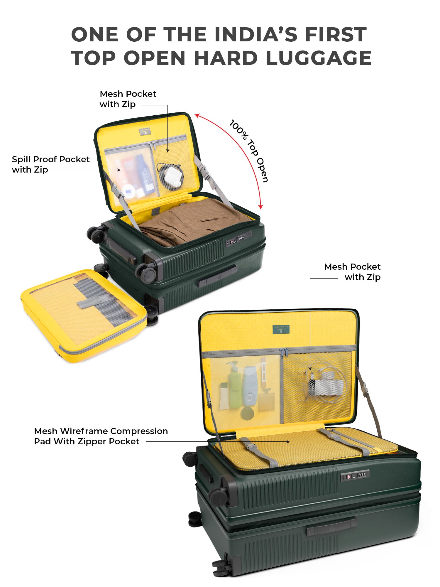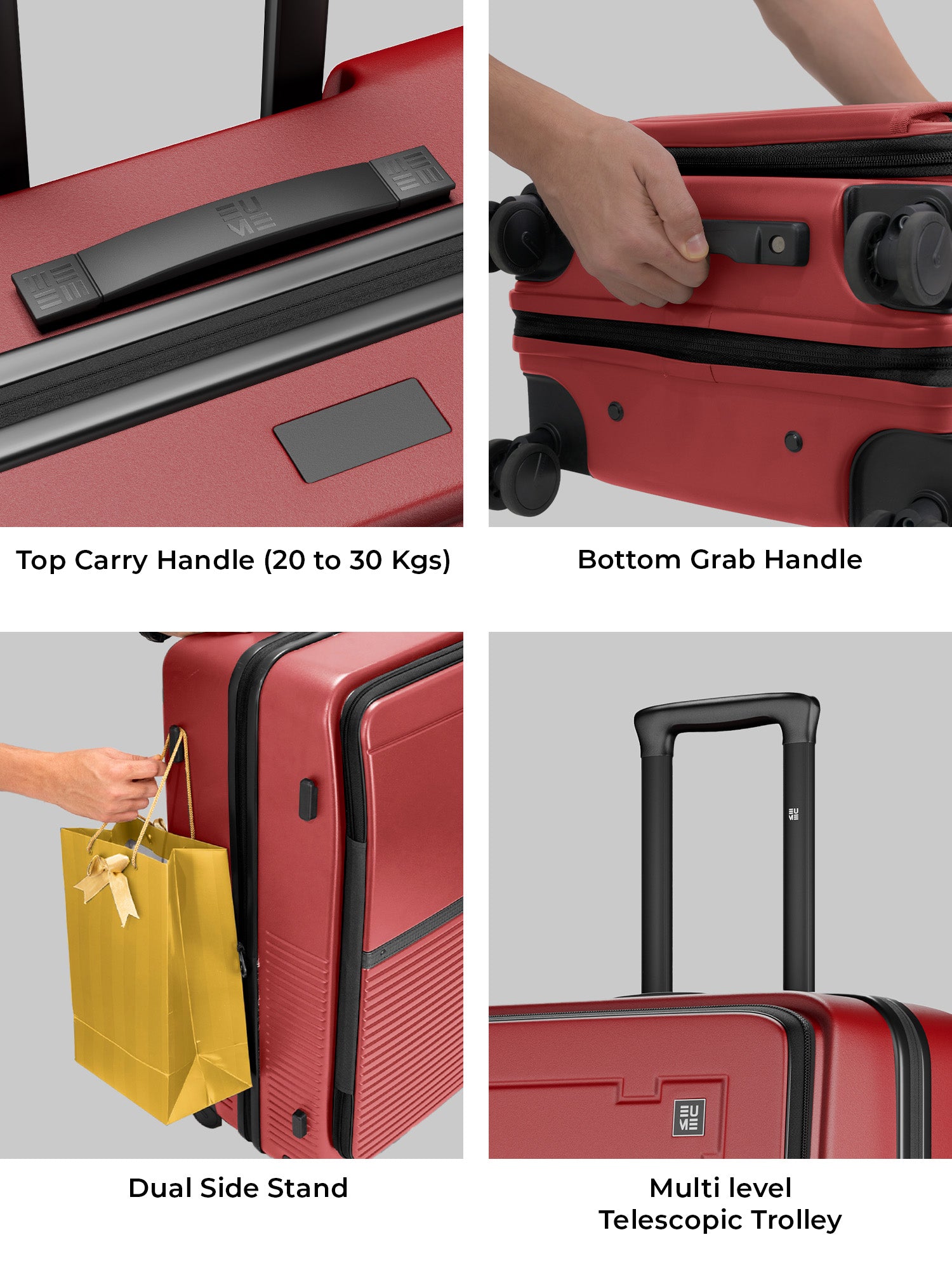 - The EUME Aero Top-Open Hard Shell Luggage Set is built for modern travellers who value smart packing, durability, and everyday ease. Available in 20 inch cabin and 28 inch large, Aero features an innovative 100 percent top-opening design that allows full access to your belongings even in compact hotel rooms and small living spaces. This makes it one of India’s leading top-open hard shell luggage solutions.