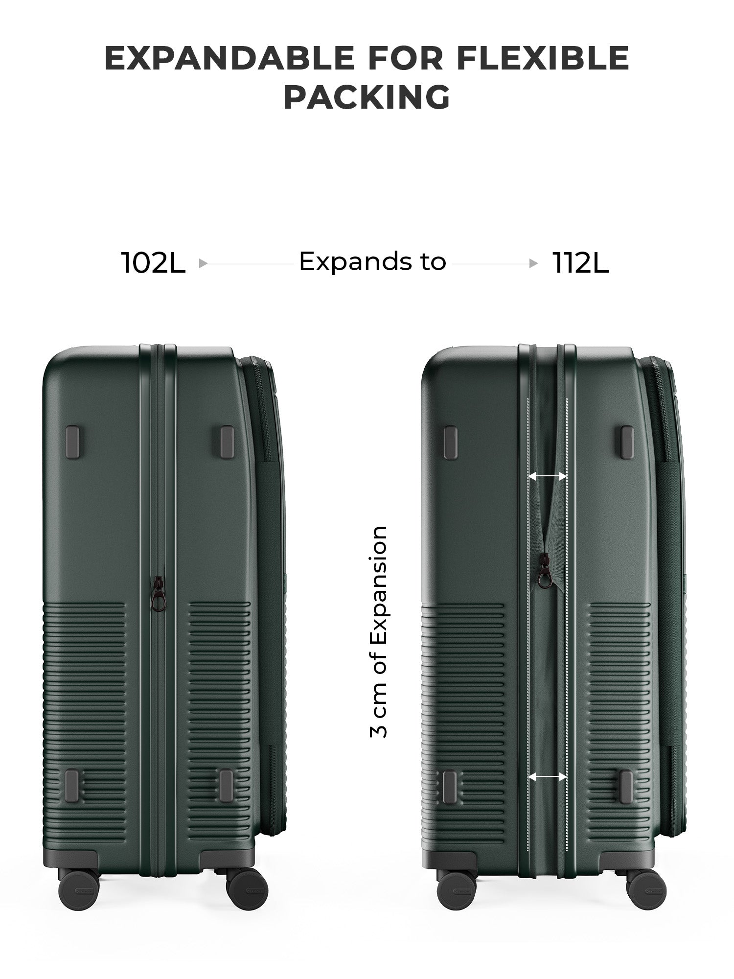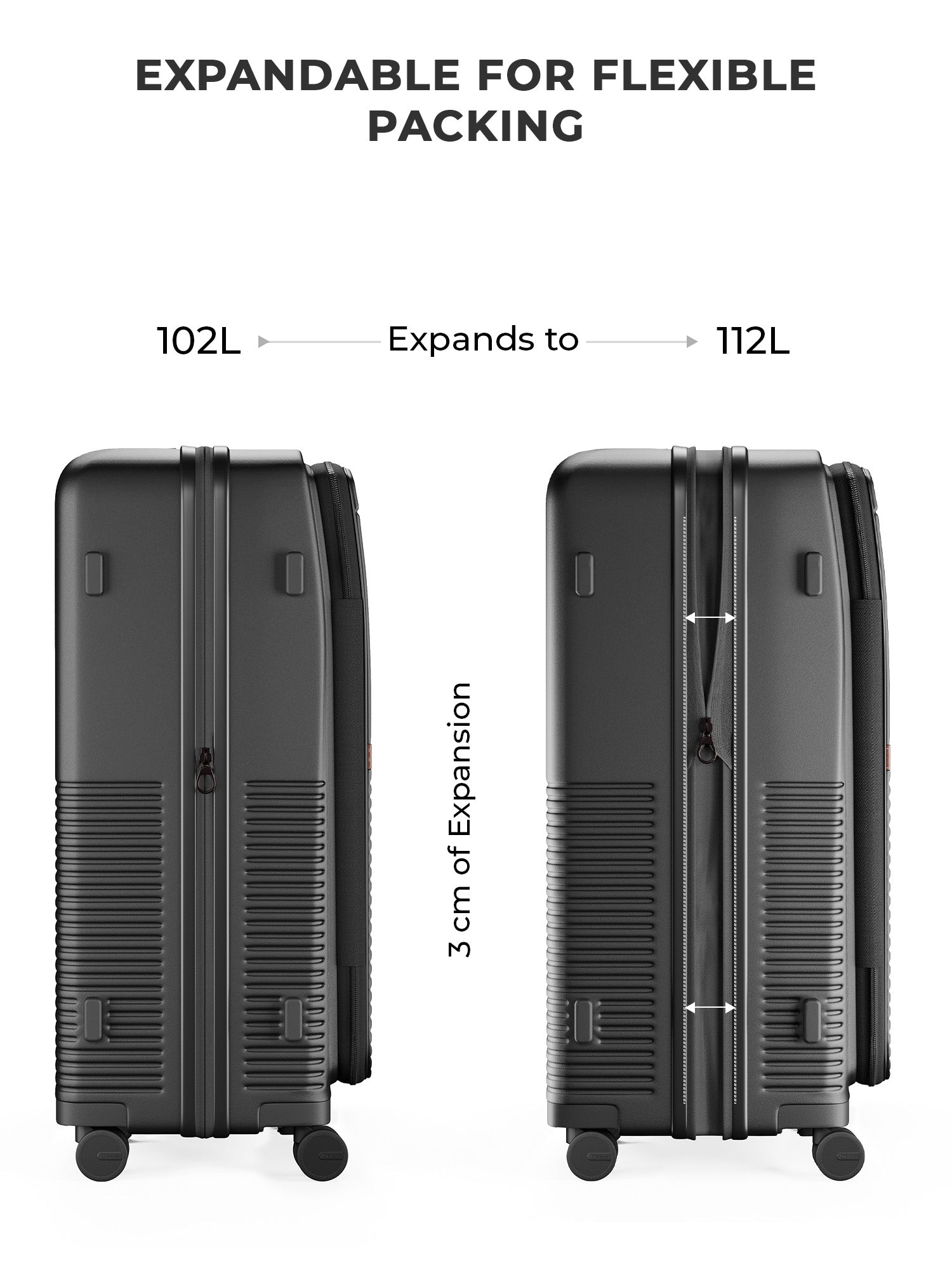 - All sizes include a mid-section expansion for extra storage, along with practical exterior details like side stands for stability and upper stands that double as hanging bag holders. Inside, the luggage is finished with a water-resistant, dust-resistant peach skin lining, featuring a spill-proof pocket for toiletries and essentials.