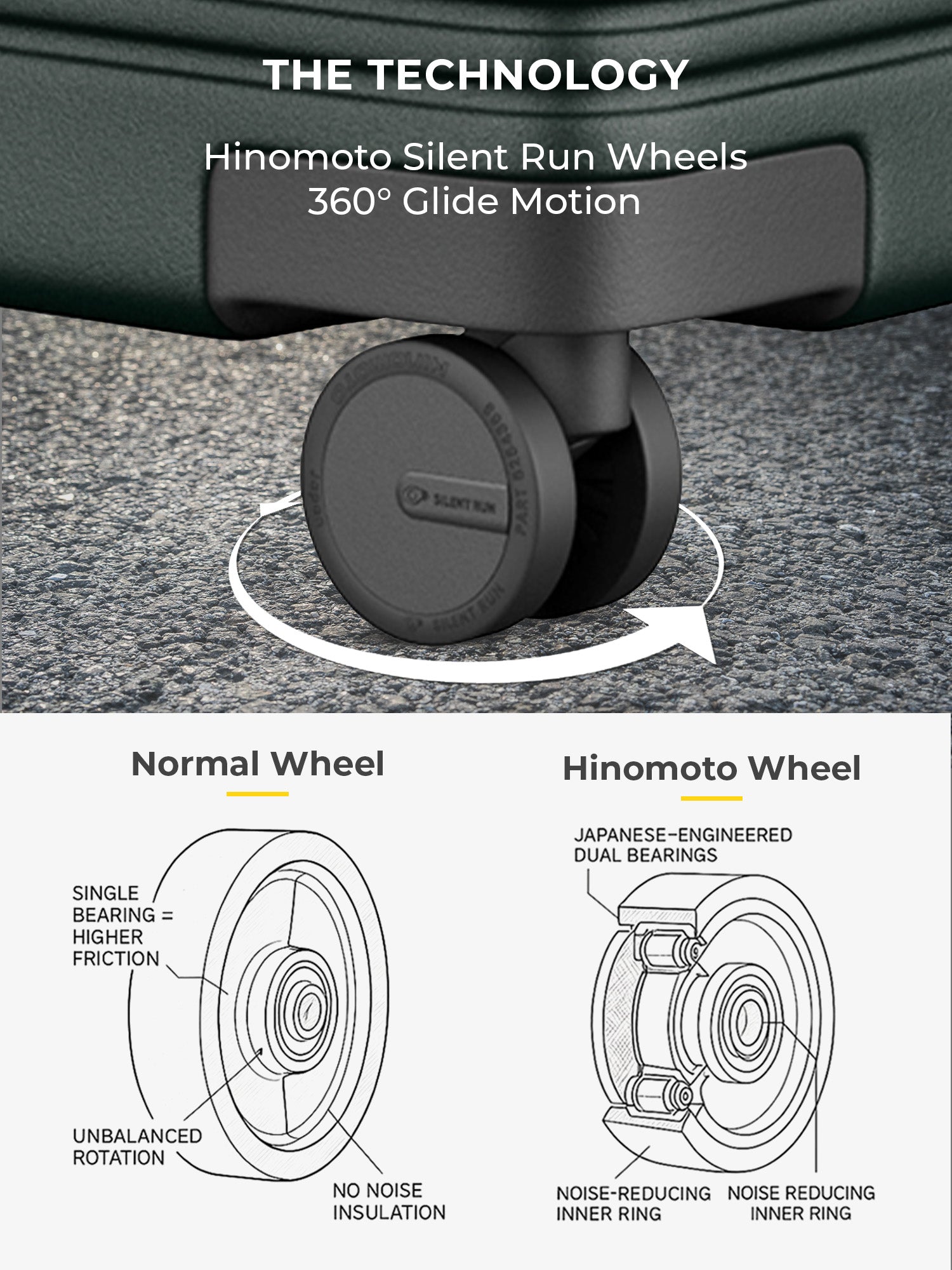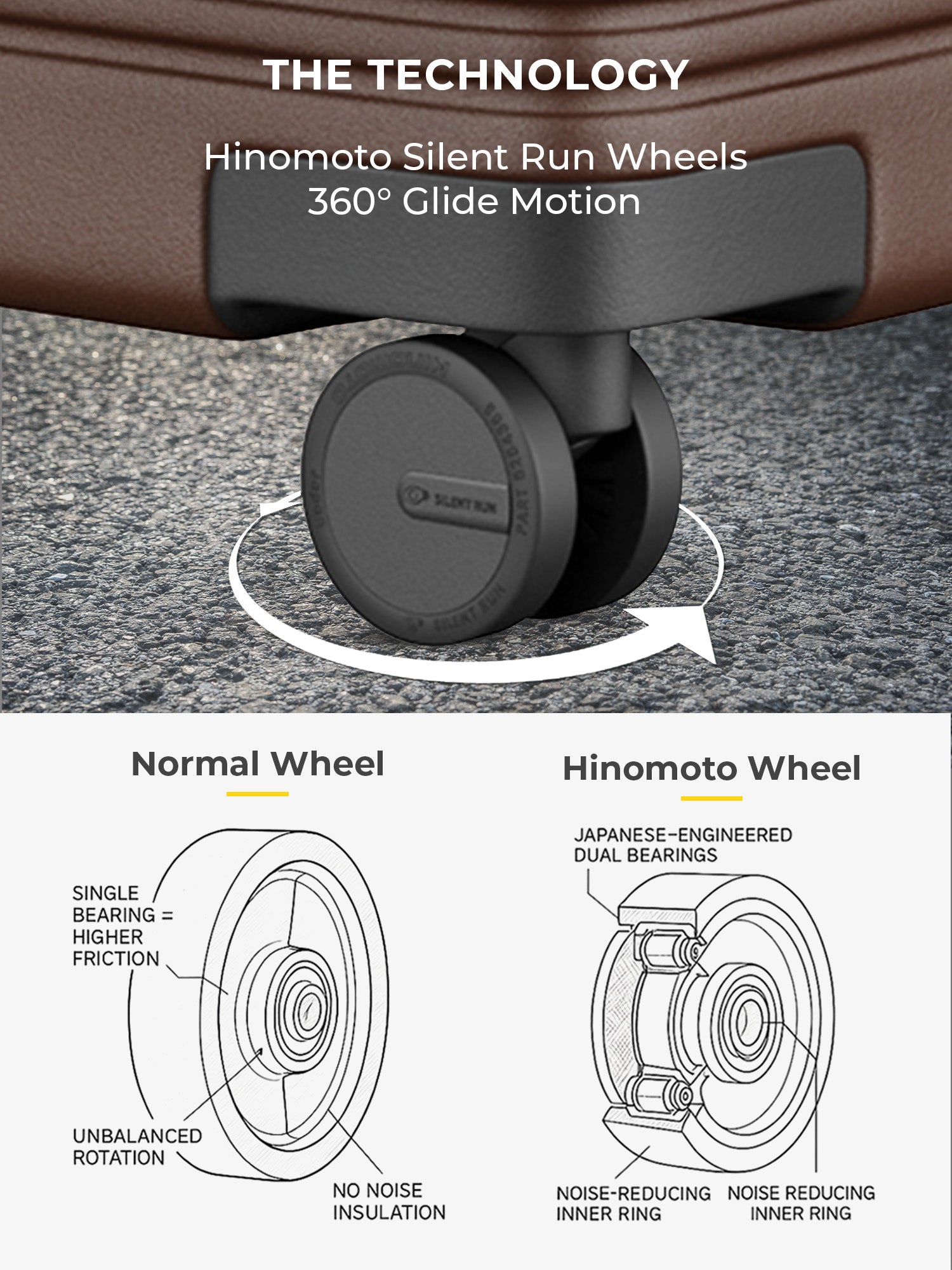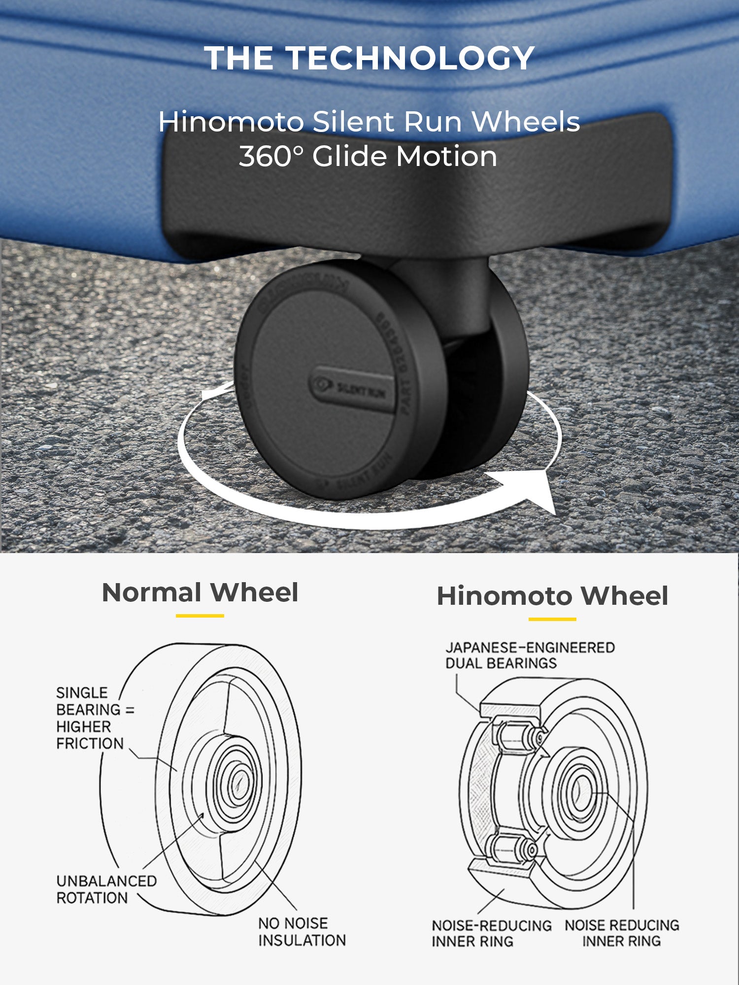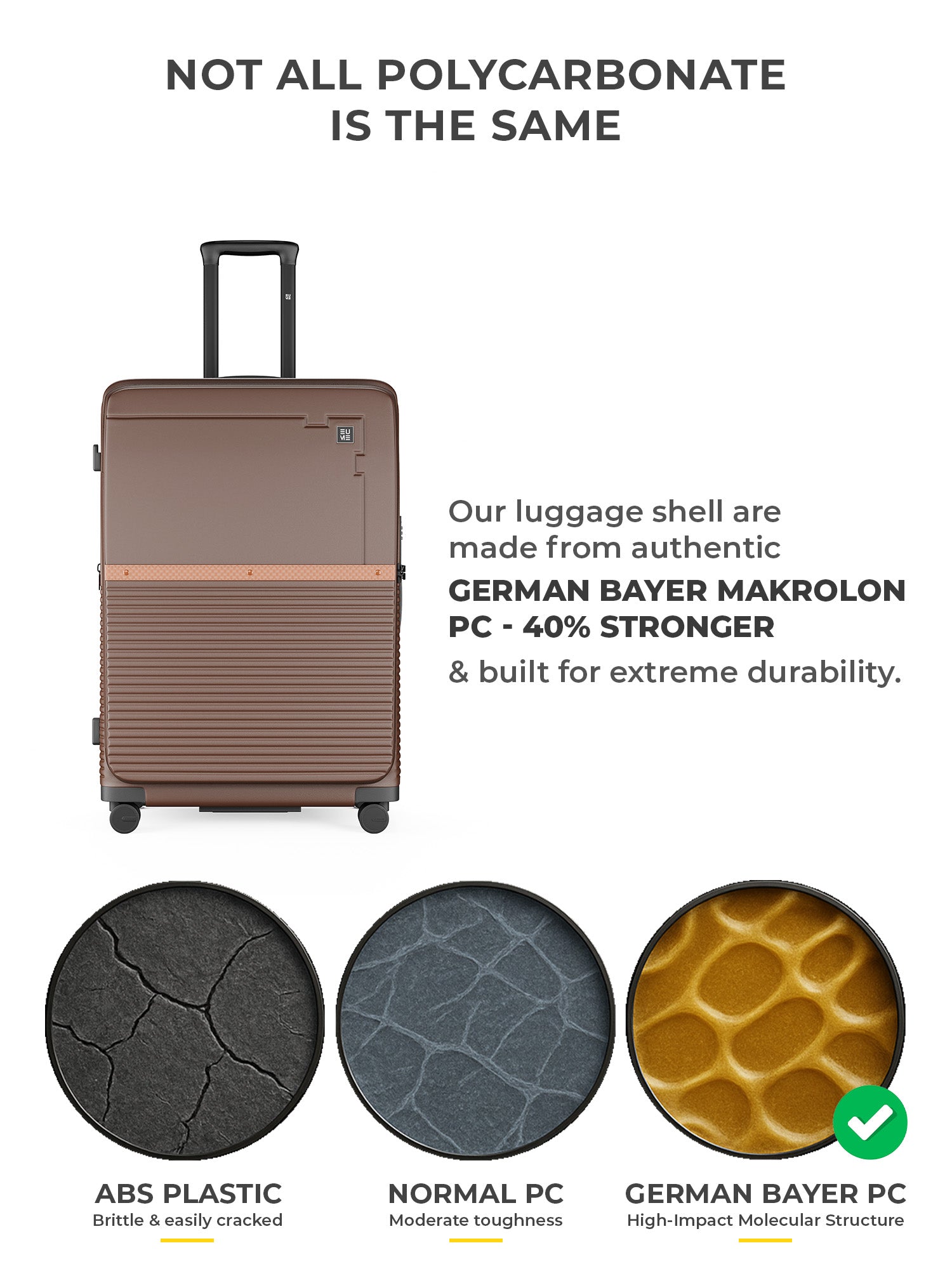 - The large sizes are crafted from premium German Bayer polycarbonate, delivering an ideal balance of strength, flexibility, and lightweight performance. The hard shell construction protects against impact, while original Hinomoto silent-run wheels ensure smooth, quiet 360 degree movement. Anti-theft main zippers provide added security throughout your journey.