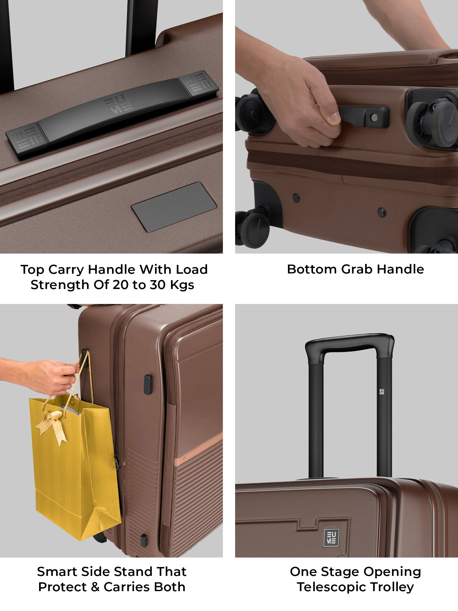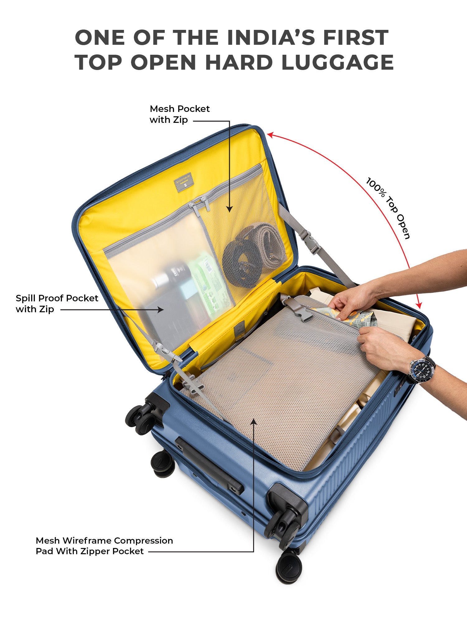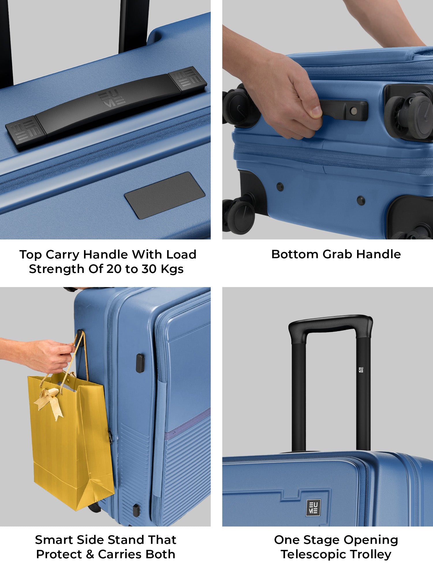 - The EUME Aero Top-Open Hard Shell Luggage Set is built for modern travellers who value smart packing, durability, and everyday ease. Available in 20 inch cabin, 24 inch medium, and 28 inch large, Aero features an innovative 100 percent top-opening design that allows full access to your belongings even in compact hotel rooms and small living spaces. This makes it one of India’s leading top-open hard shell luggage solutions.
