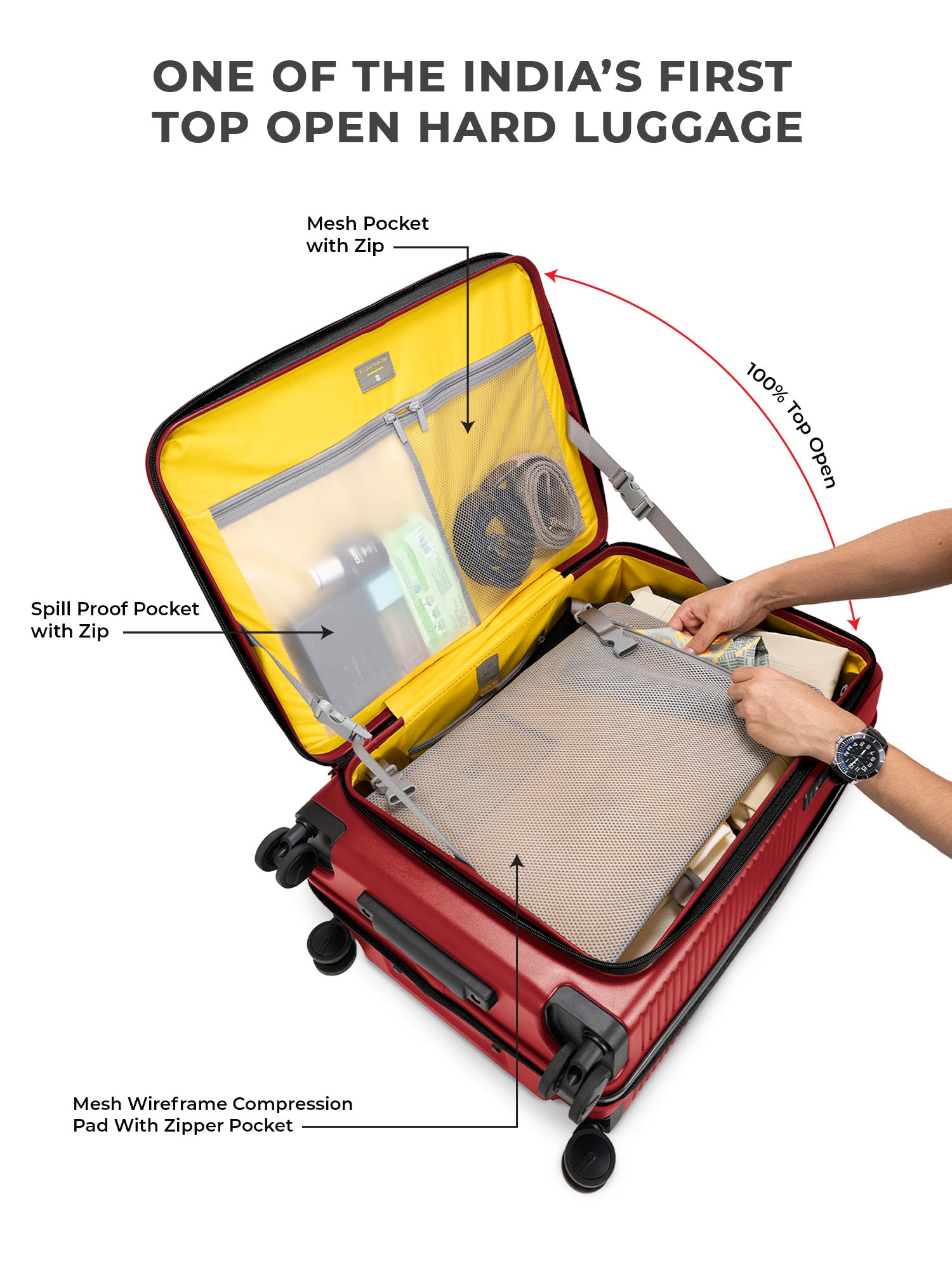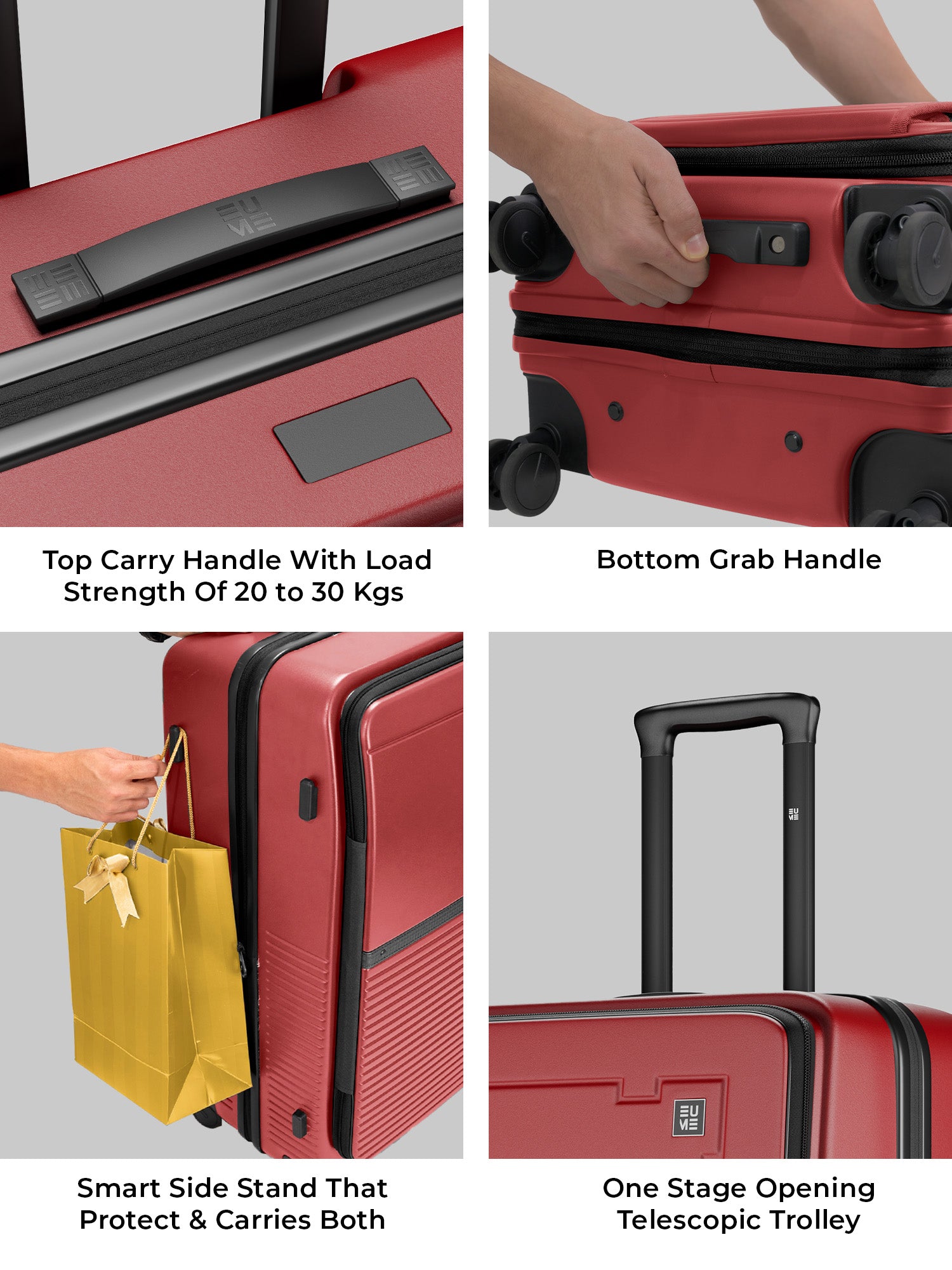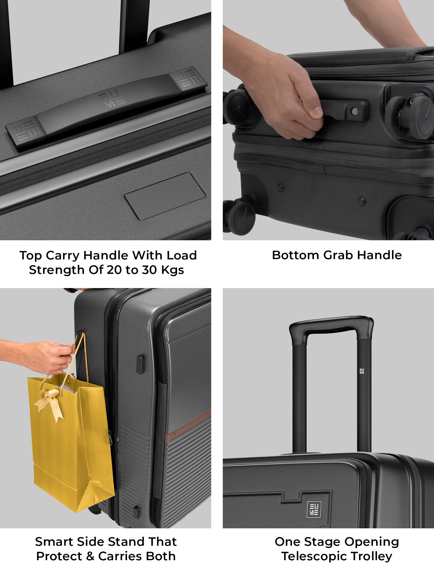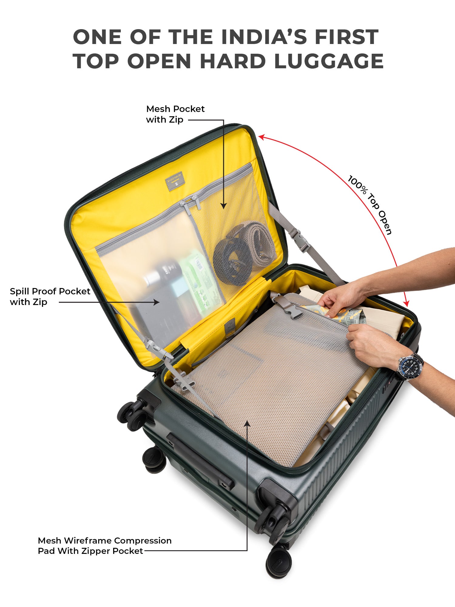 - The EUME Aero Top-Open Hard Shell Luggage Set is built for modern travellers who value smart packing, durability, and everyday ease. Available in 20 inch cabin, 24 inch medium, and 28 inch large, Aero features an innovative 100 percent top-opening design that allows full access to your belongings even in compact hotel rooms and small living spaces. This makes it one of India’s leading top-open hard shell luggage solutions.