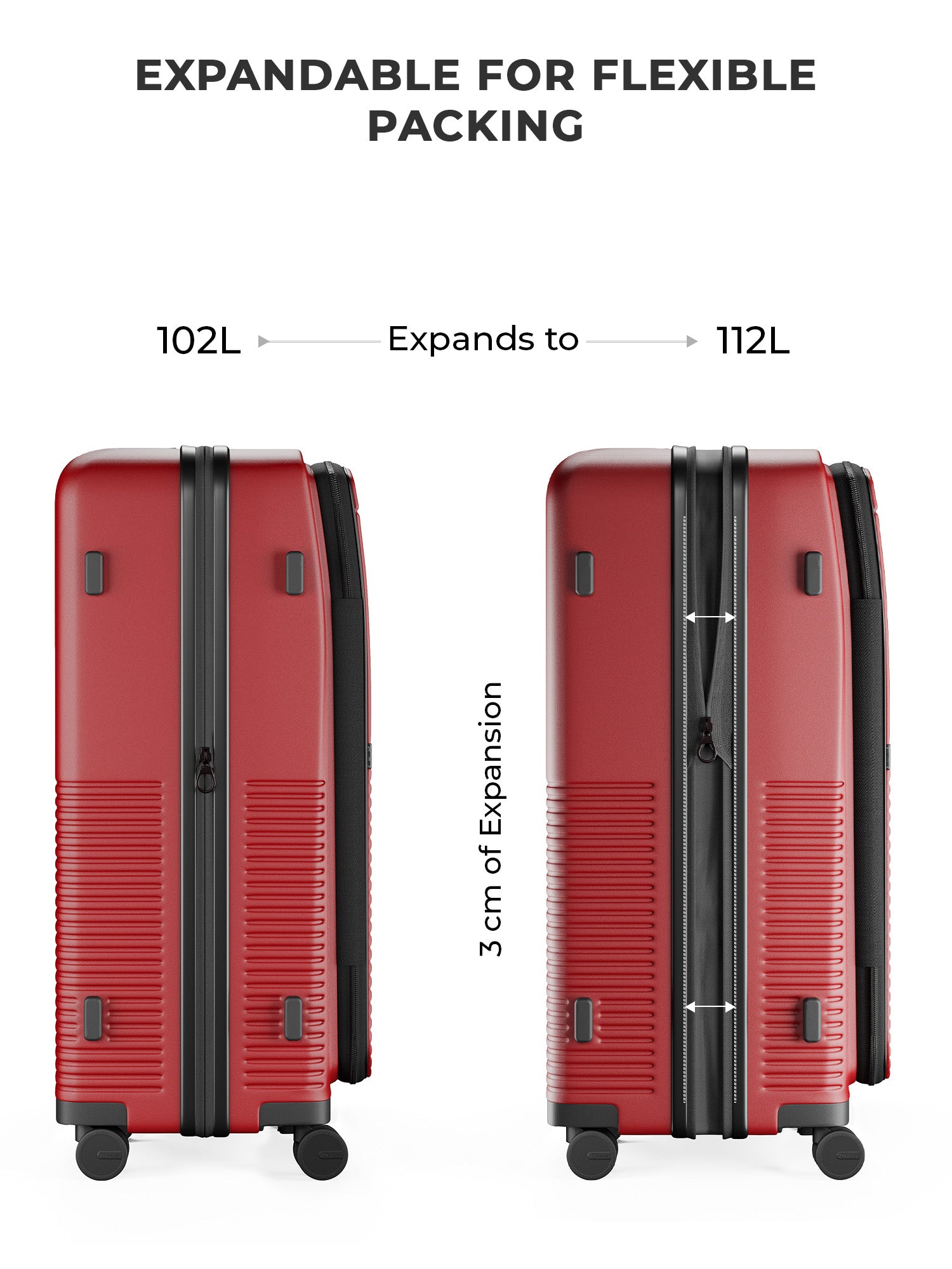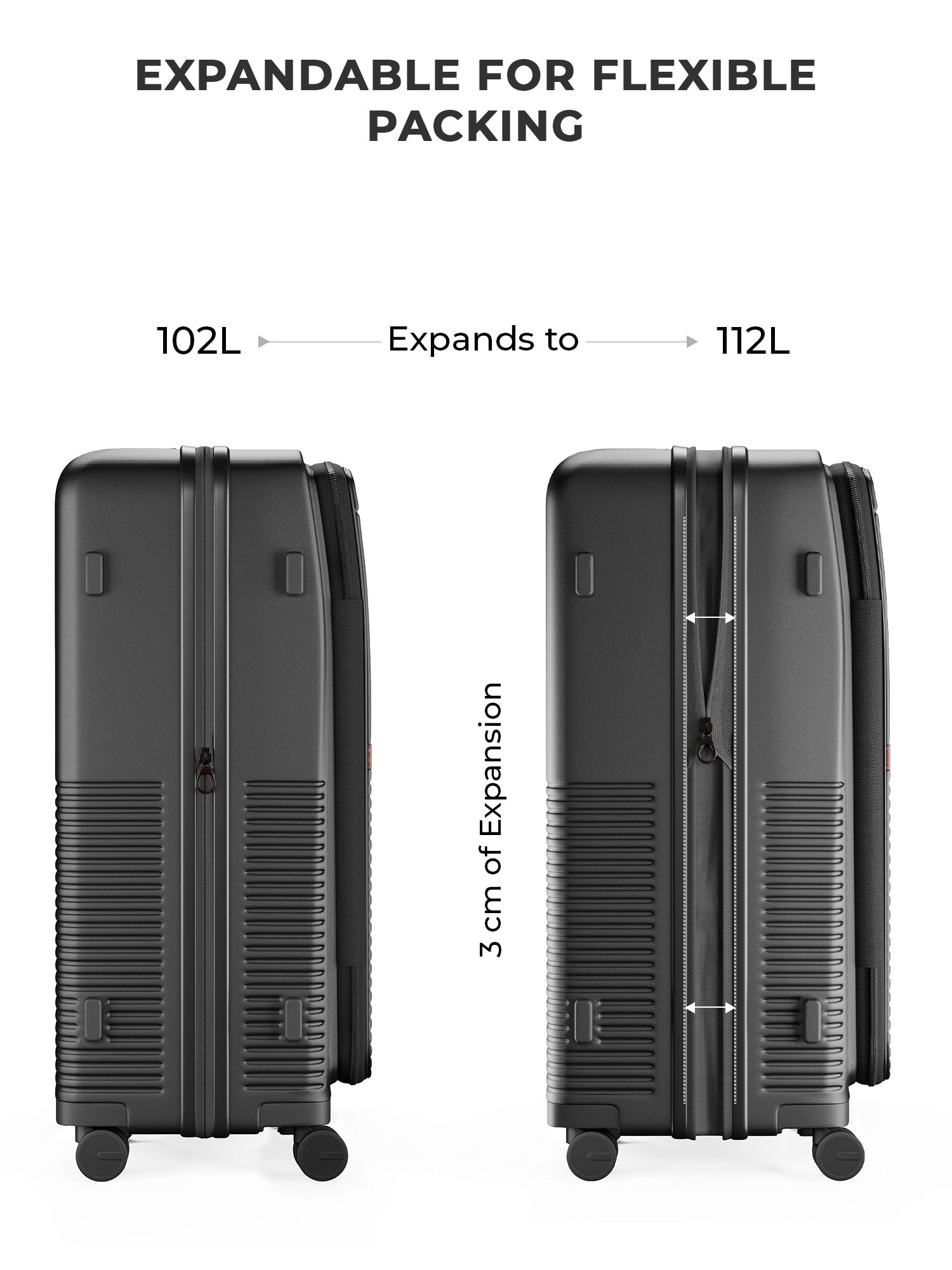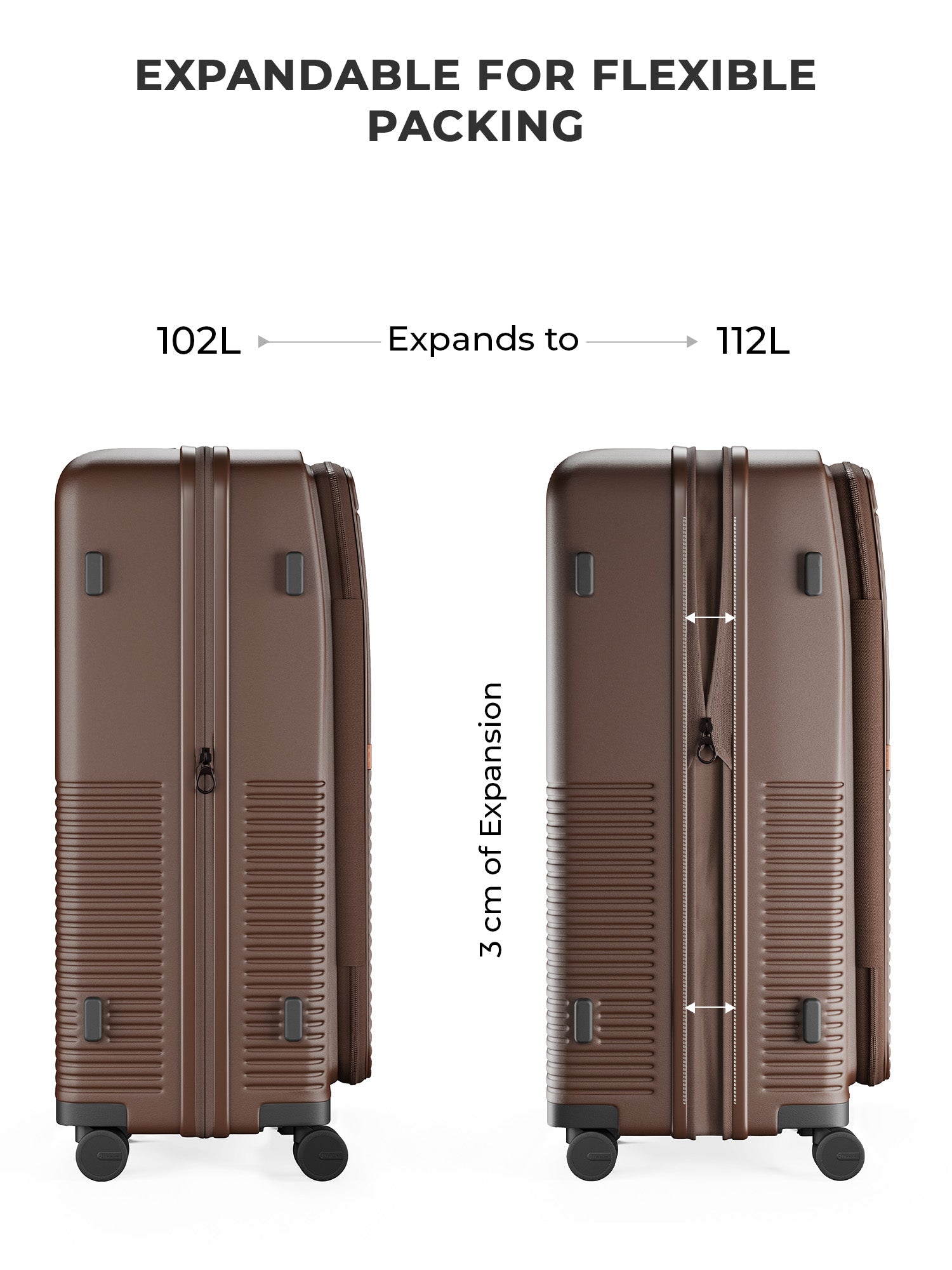 - The large include a mid-section expansion for extra storage, along with practical exterior details like side stands for stability and upper stands that double as hanging bag holders. Inside, the luggage is finished with a water-resistant, dust-resistant peach skin lining, featuring a spill-proof pocket for toiletries and essentials.