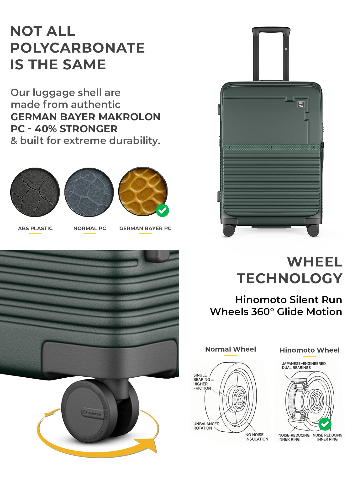- All three sizes are crafted from premium German Bayer polycarbonate, delivering an ideal balance of strength, flexibility, and lightweight performance. The hard shell construction protects against impact, while original Hinomoto silent-run wheels ensure smooth, quiet 360 degree movement. Anti-theft main zippers provide added security throughout your journey.