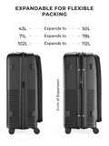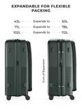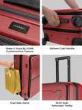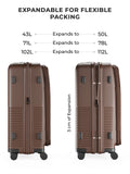 - All sizes include a mid-section expansion for extra storage, along with practical exterior details like side stands for stability and upper stands that double as hanging bag holders. Inside, the luggage is finished with a water-resistant, dust-resistant peach skin lining, featuring a spill-proof pocket for toiletries and essentials.
