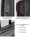 - The 20 inch cabin luggage is designed for frequent flyers and business travellers, featuring a compression pad with dedicated laptop storage up to 16 inches and tablet storage up to 13 inches. Two front easy-access pockets keep essentials within reach, complemented by a one-press bottle holder on the back. A TSA-approved number lock with Type-A and Type-C charging ports supports modern, connected travel.