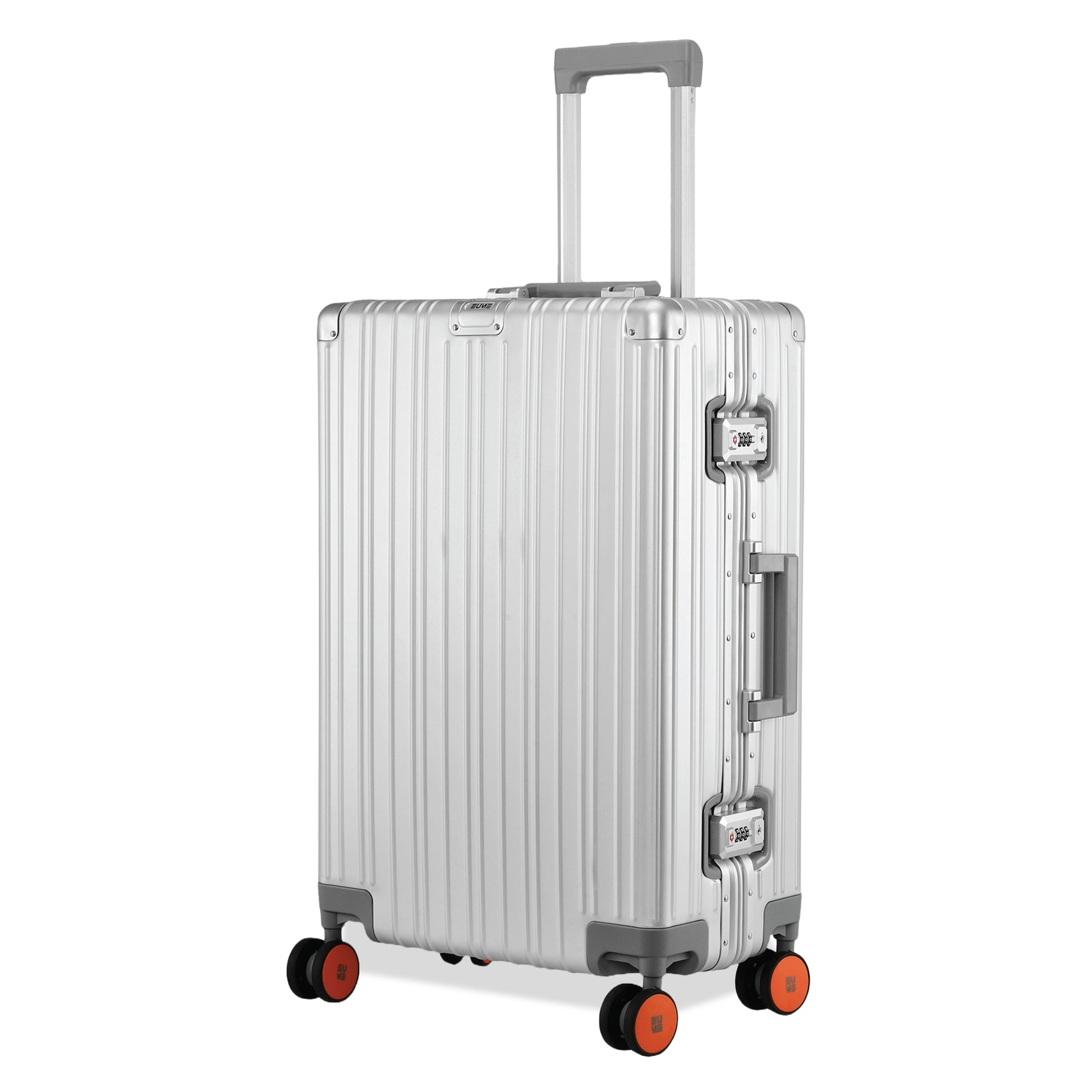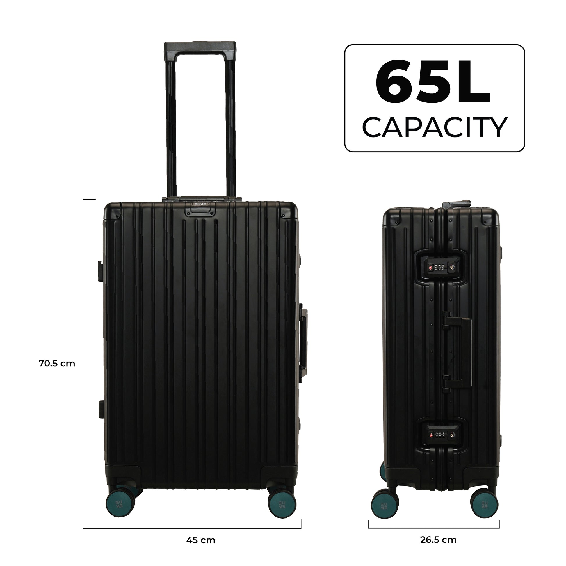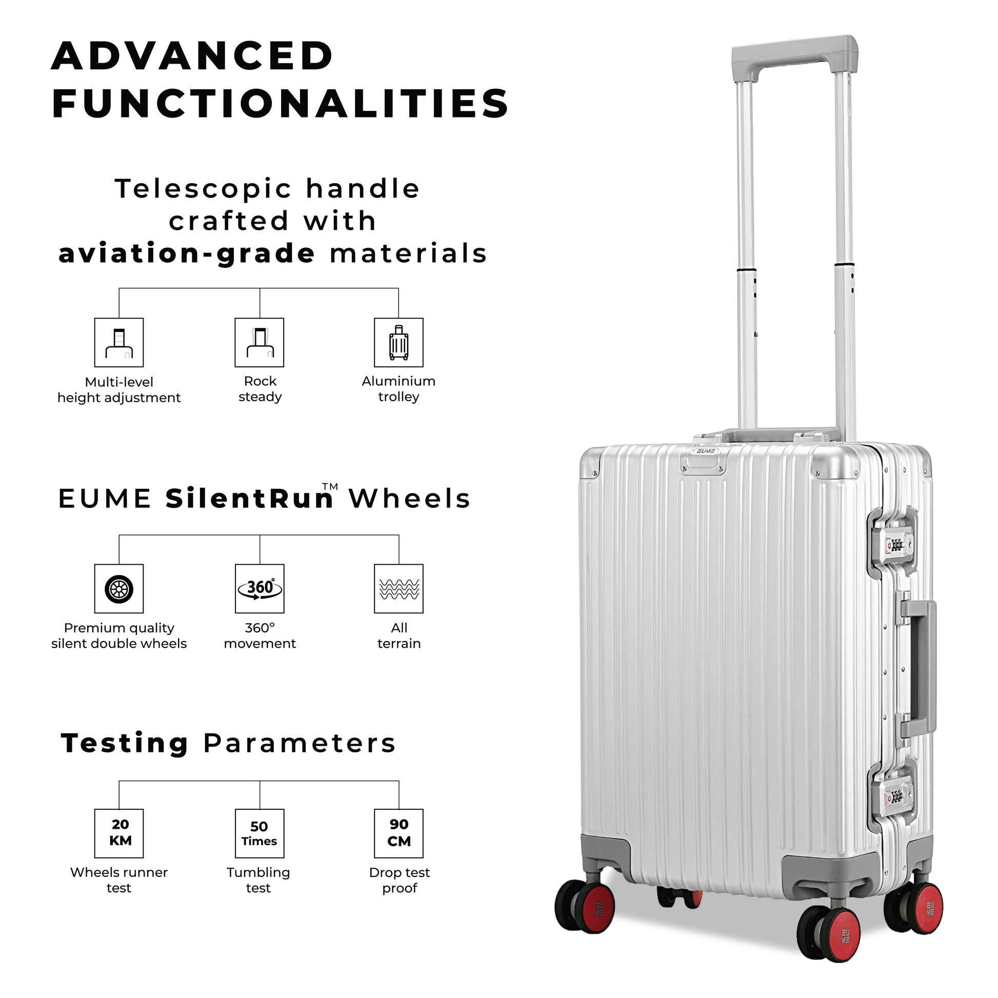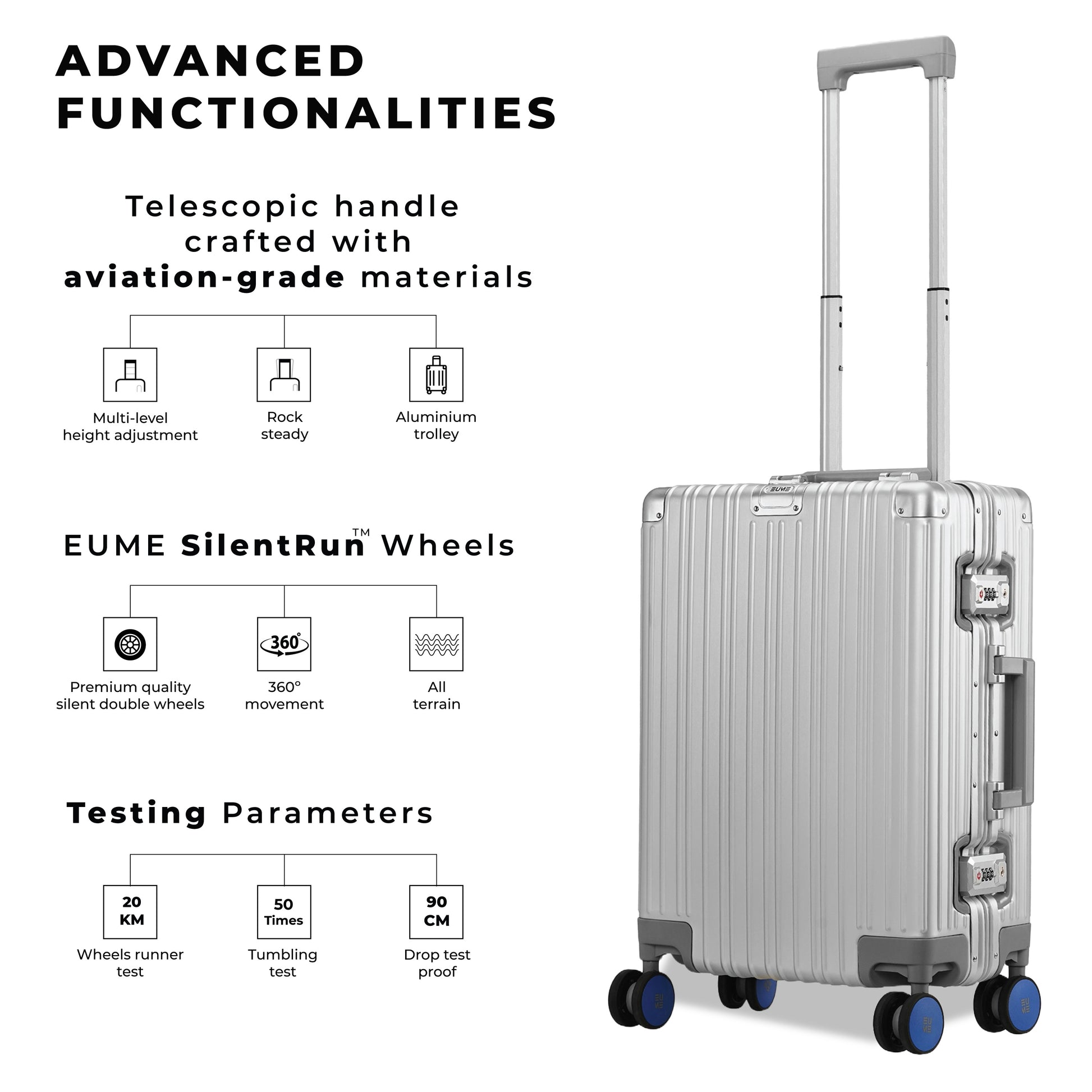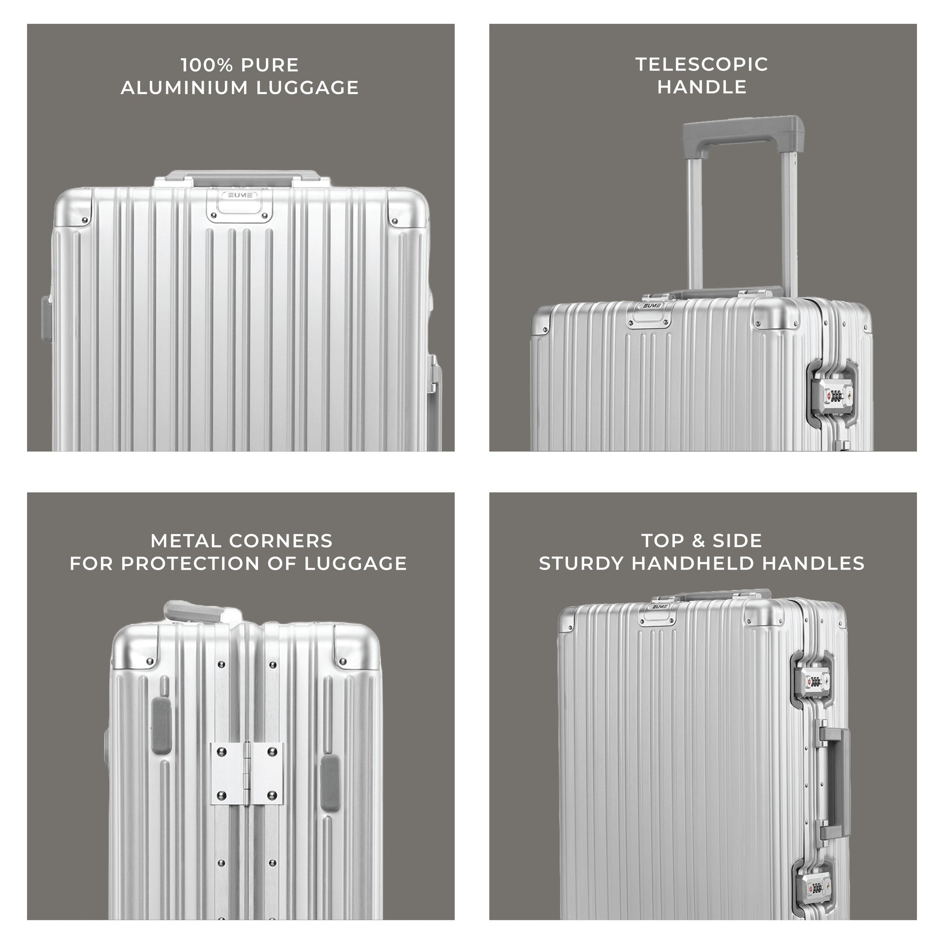 - The EUME Aluminium 20-inch cabin and 24- Inch check-in medium trolley bags for travel are meticulously crafted from 100% high-end anodized aluminium for durability and a stylish look. Equipped with 8 SilentRun 360-degree double wheels and a high-end steering system, our cabin trolley bags ensure sturdy and effortless movement. Discover the timeless elegance of Our Luggage Trolley, designed for longevity and perfect for short trips, fitting comfortably in most airline overhead compartments.