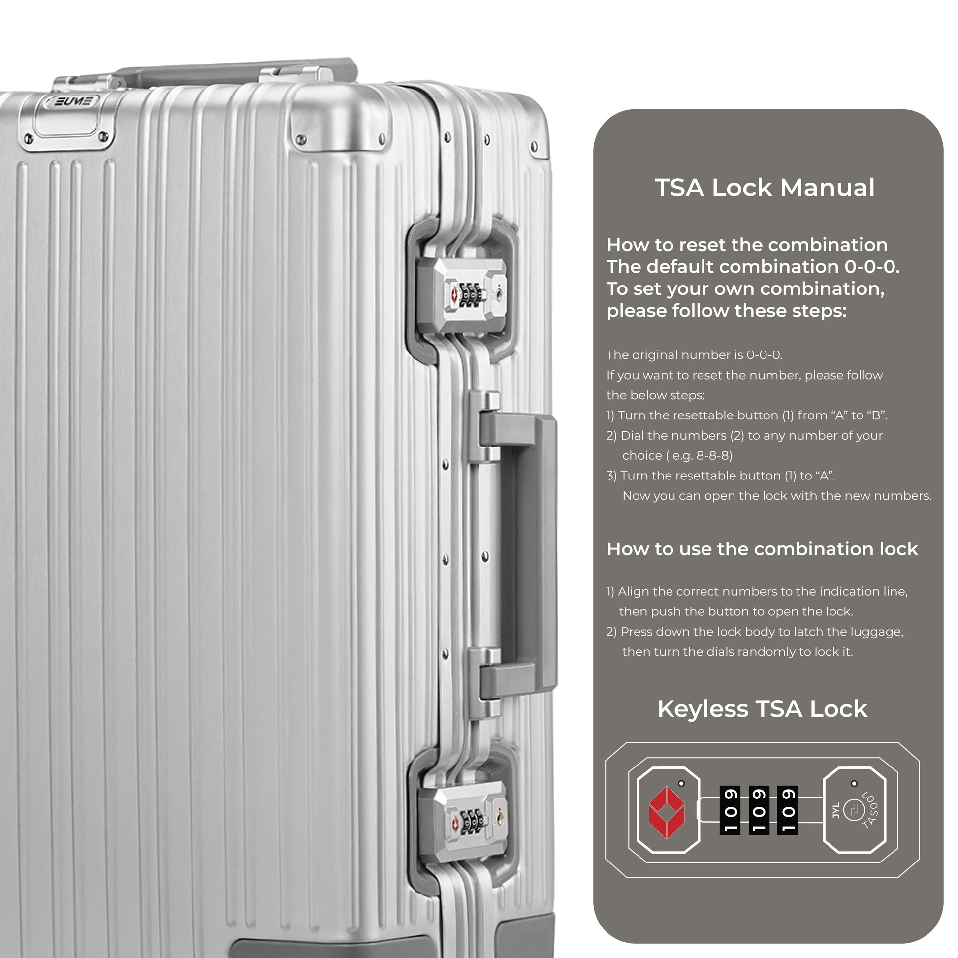 - The Eume Aluminium Cabin Luggage is backed by a 5-Year Warranty by EUME against all manufacturing defects. This warranty is broken into a complimentary 2-year warranty by EUME. To enjoy an extended 3 years of warranty for free, please register your product within 1 month of purchase.