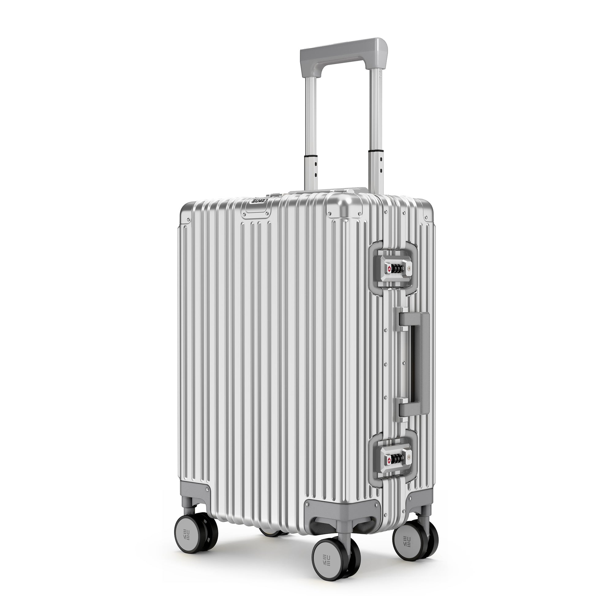 - The EUME Aluminium 20-inch cabin and 24- Inch check-in medium trolley bags for travel are meticulously crafted from 100% high-end anodized aluminium for durability and a stylish look. Equipped with 8 SilentRun 360-degree double wheels and a high-end steering system, our cabin trolley bags ensure sturdy and effortless movement. Discover the timeless elegance of Our Luggage Trolley, designed for longevity and perfect for short trips, fitting comfortably in most airline overhead compartments.