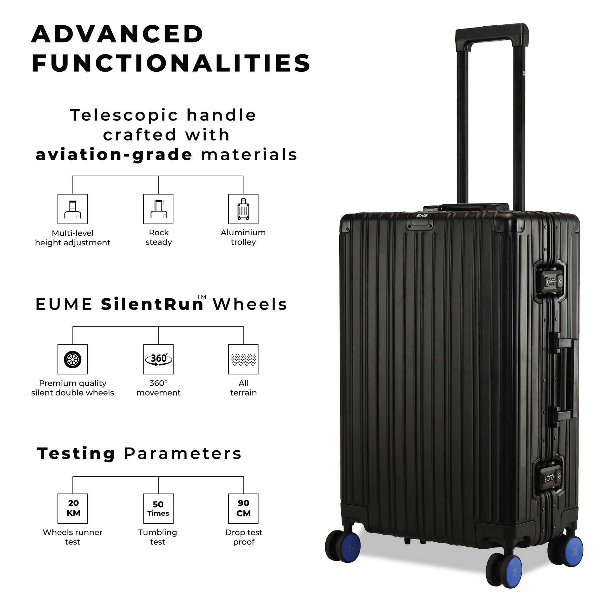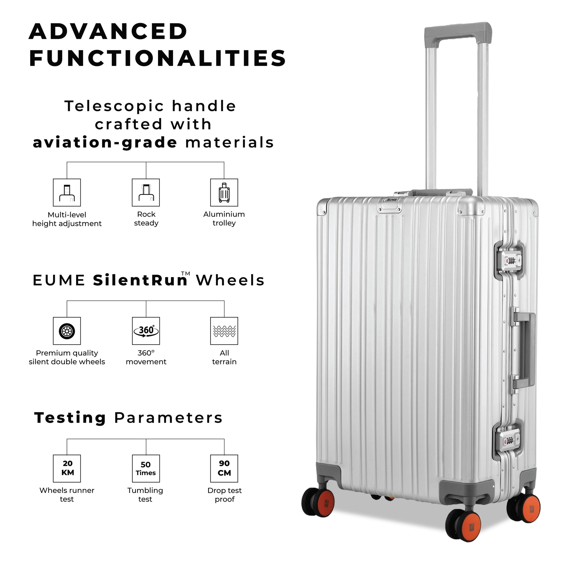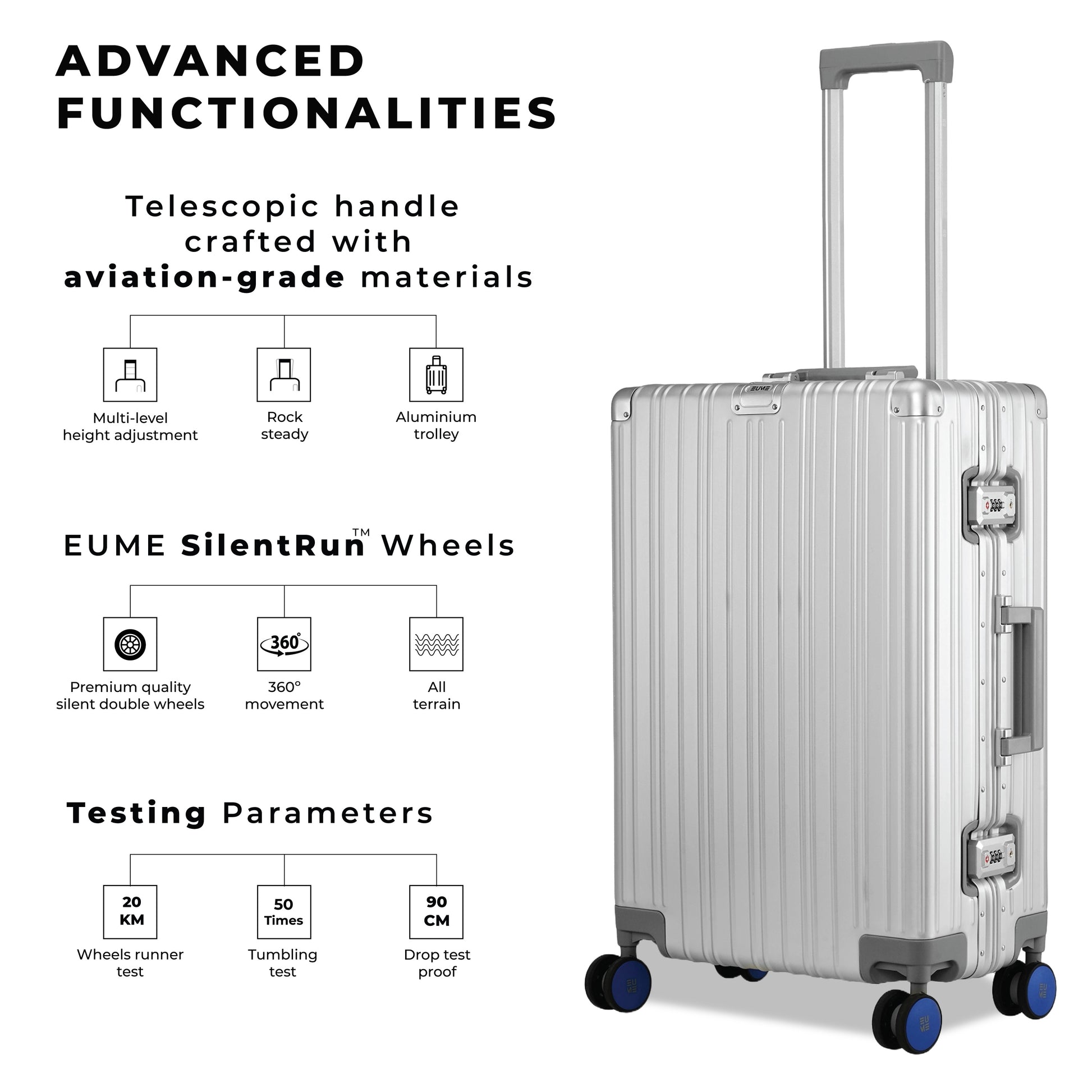 - The EUME Aluminium 20-inch cabin and 24- Inch check-in medium trolley bags for travel are meticulously crafted from 100% high-end anodized aluminium for durability and a stylish look. Equipped with 8 SilentRun 360-degree double wheels and a high-end steering system, our cabin trolley bags ensure sturdy and effortless movement. Discover the timeless elegance of Our Luggage Trolley, designed for longevity and perfect for short trips, fitting comfortably in most airline overhead compartments.