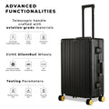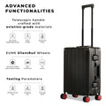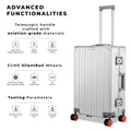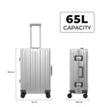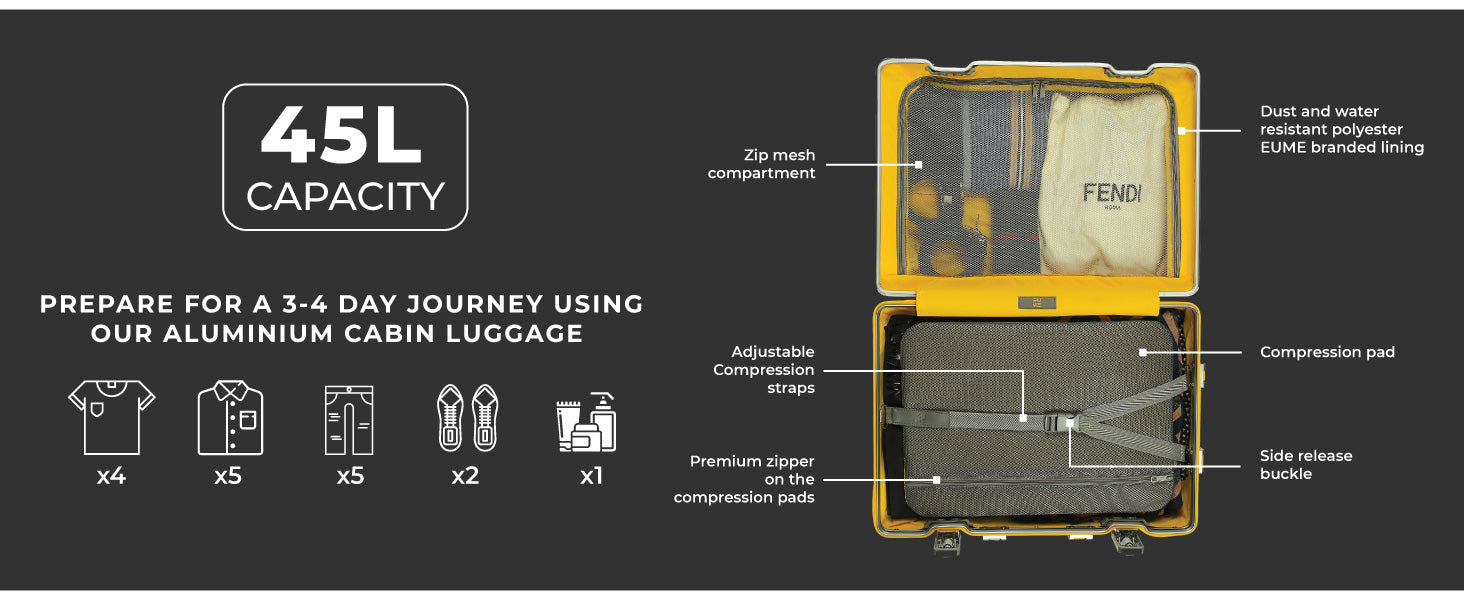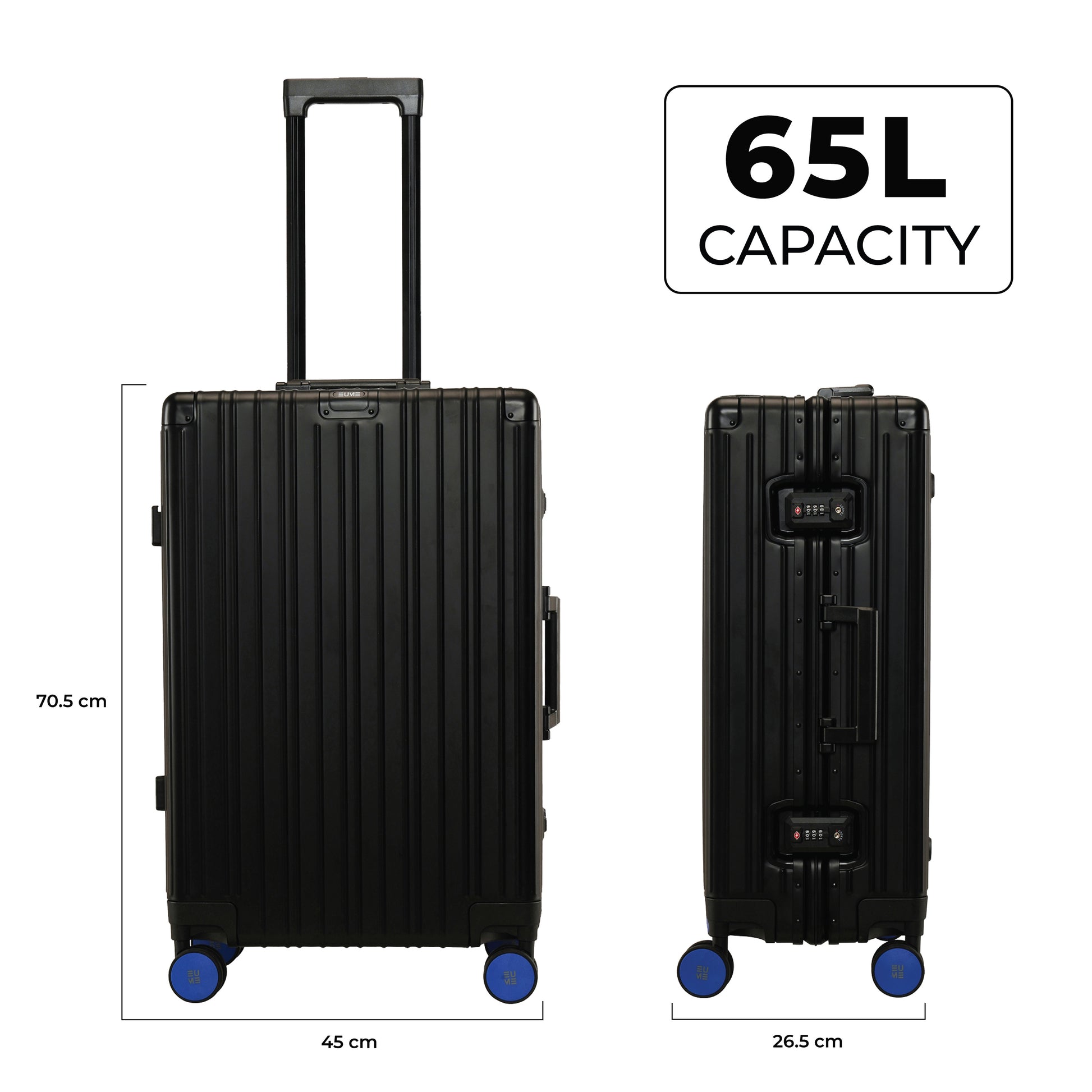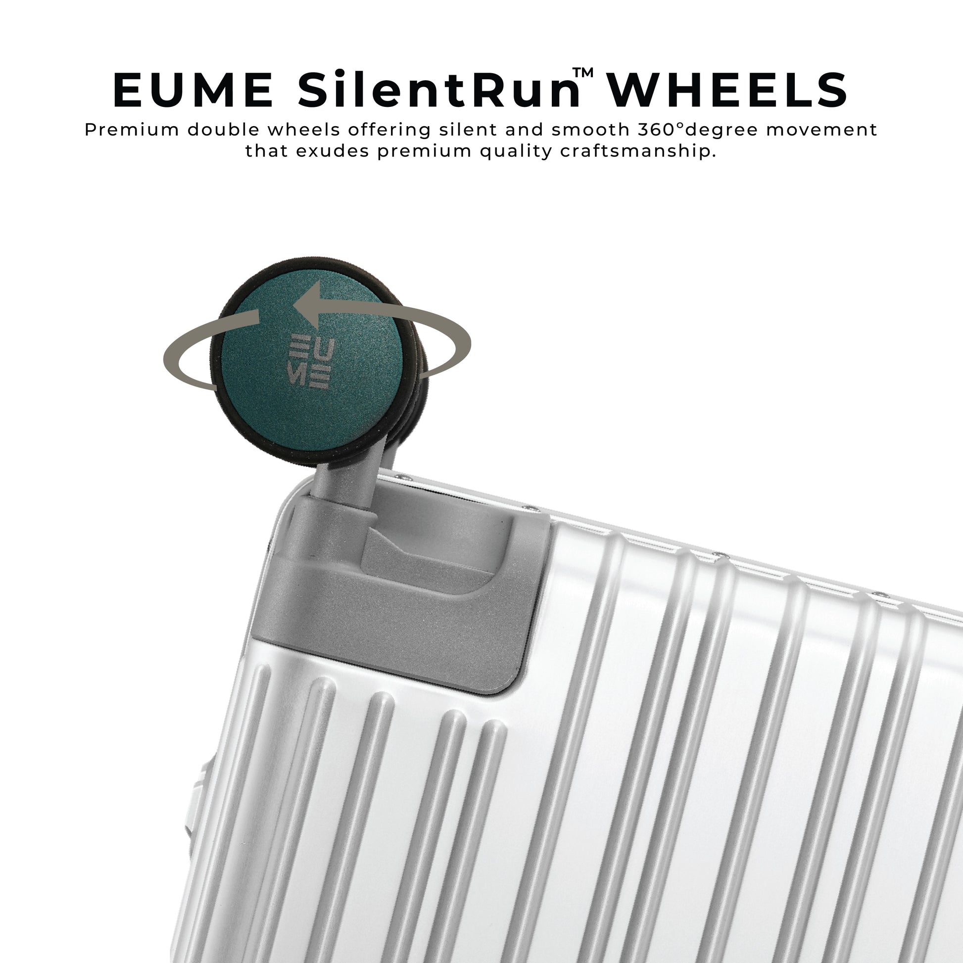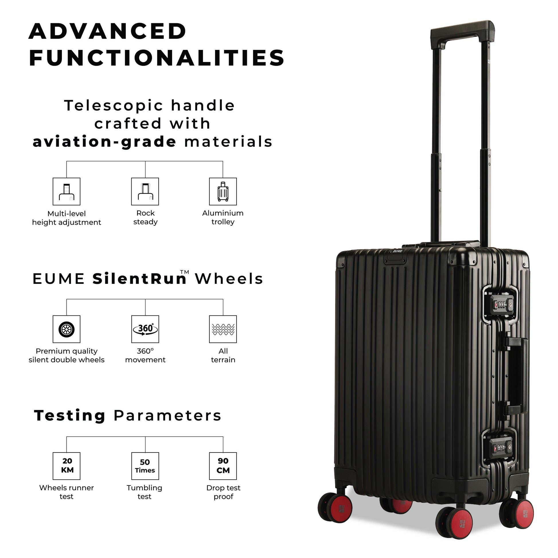 - The EUME Aluminium 20-inch cabin and 24- Inch check-in medium trolley bags for travel are meticulously crafted from 100% high-end anodized aluminium for durability and a stylish look. Equipped with 8 SilentRun 360-degree double wheels and a high-end steering system, our cabin trolley bags ensure sturdy and effortless movement. Discover the timeless elegance of Our Luggage Trolley, designed for longevity and perfect for short trips, fitting comfortably in most airline overhead compartments.