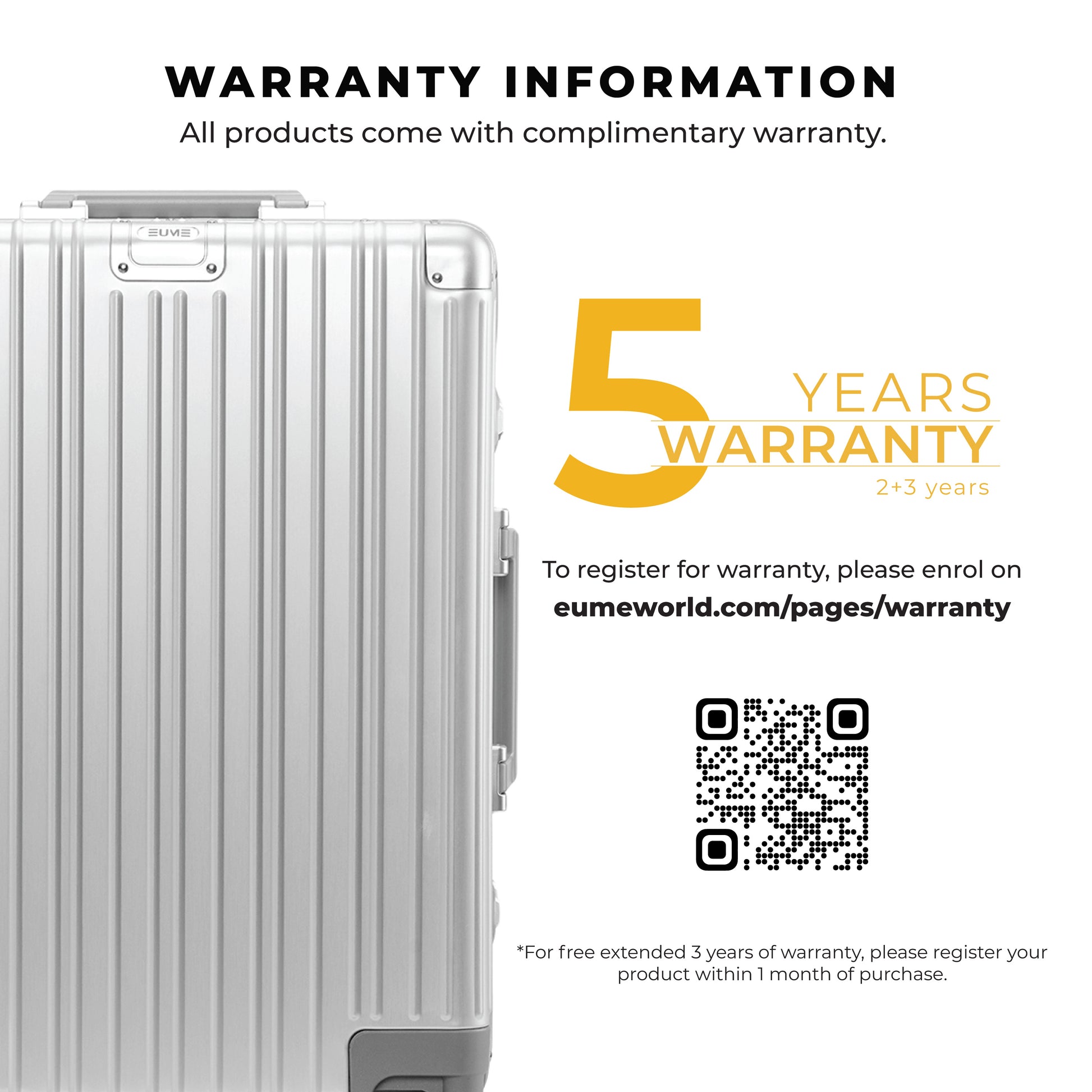 - The Eume Aluminium Cabin Luggage is backed by a 5-Year Warranty by EUME against all manufacturing defects. This warranty is broken into a complimentary 2-year warranty by EUME. To enjoy an extended 3 years of warranty for free, please register your product within 1 month of purchase.