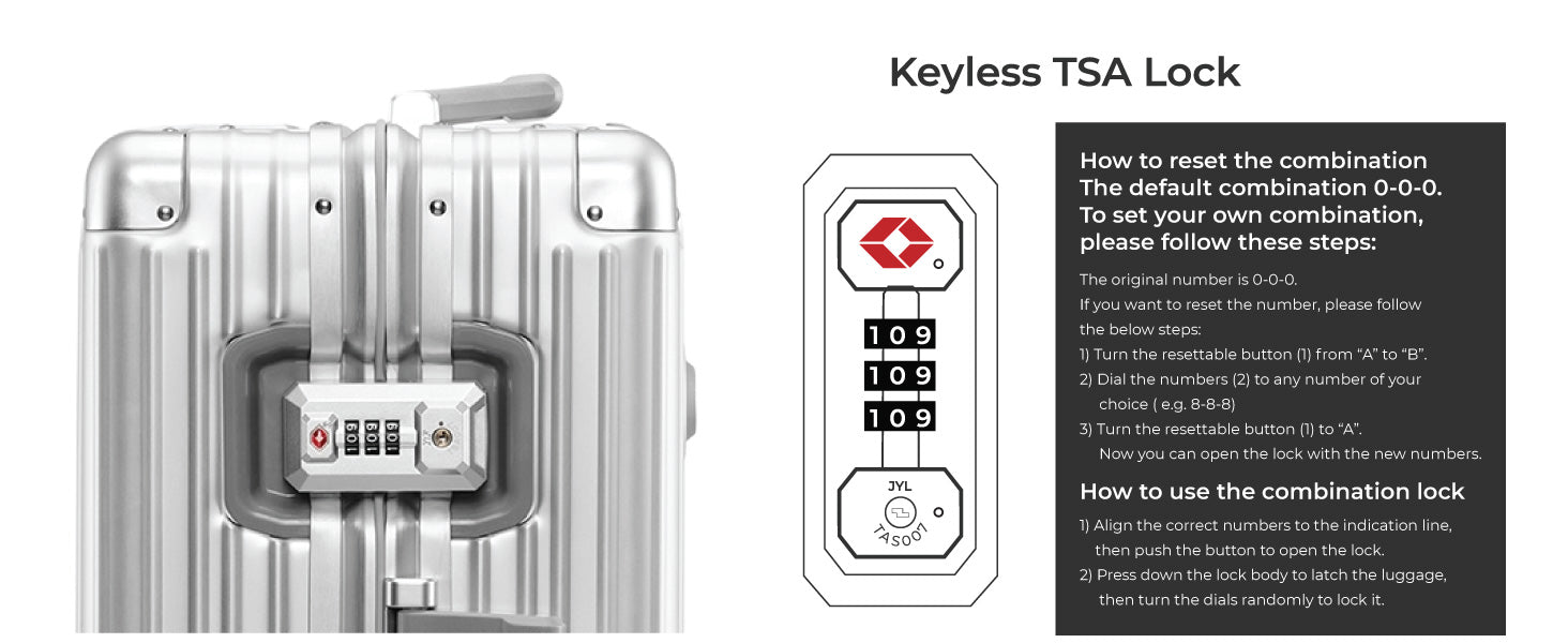 - Experience hassle-free security checks with our Aluminium TSA Lock cabin luggage. Featuring two TSA-approved press-button combination locks, your belongings stay safe during airline inspections. The Travel Bag trolley design includes two durable handles capable of lifting weights up to 10kg each for Cabin and 15kg for check-in medium, ensuring reliable handling.