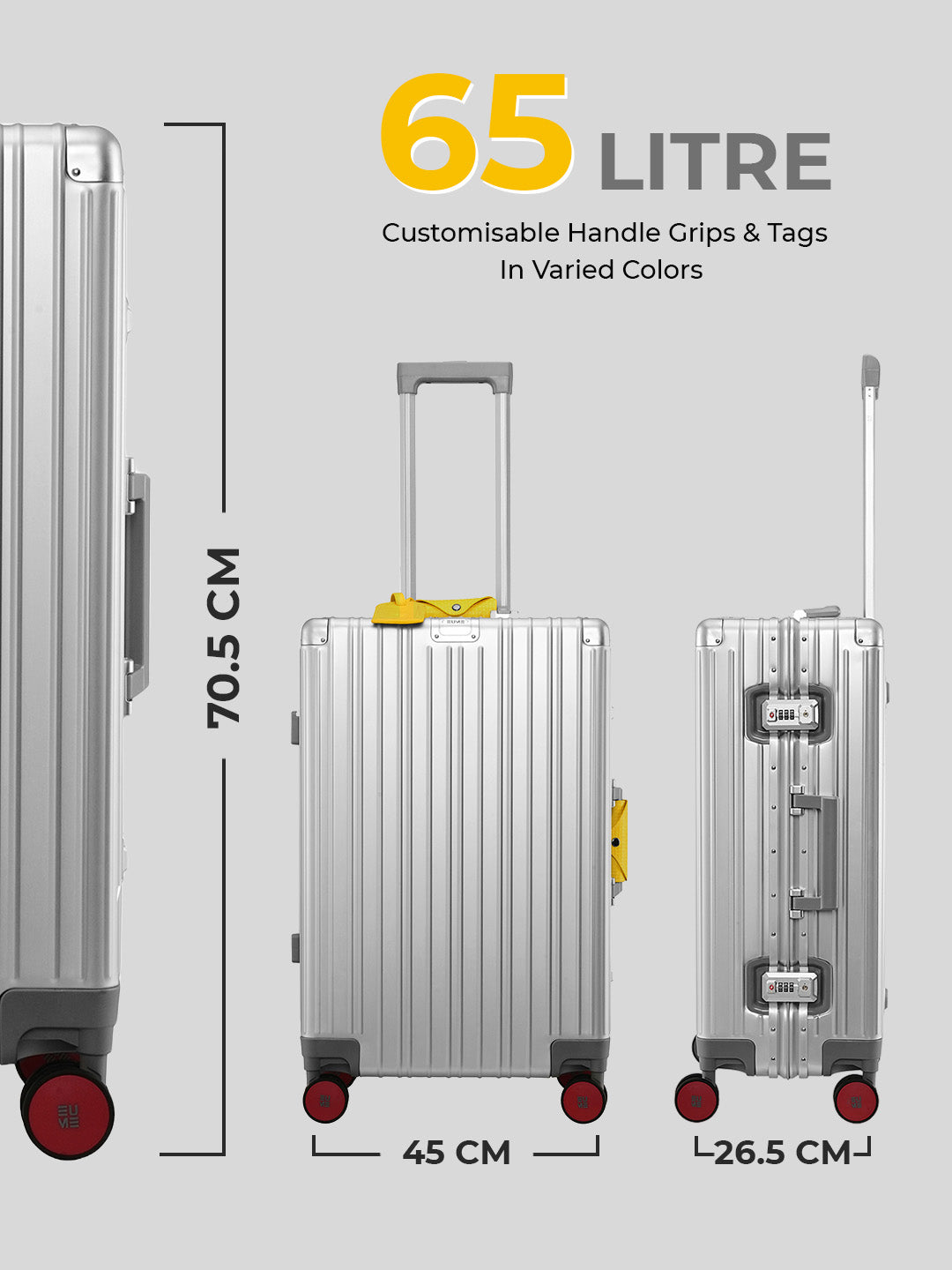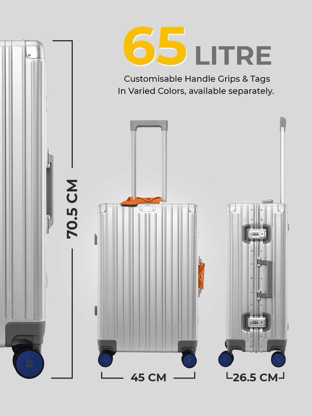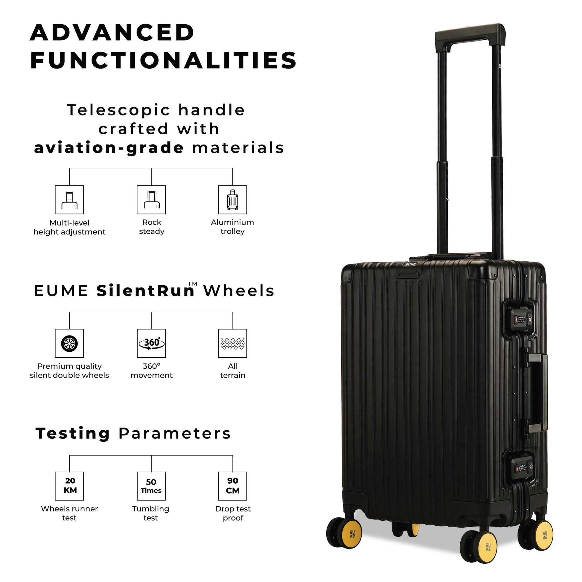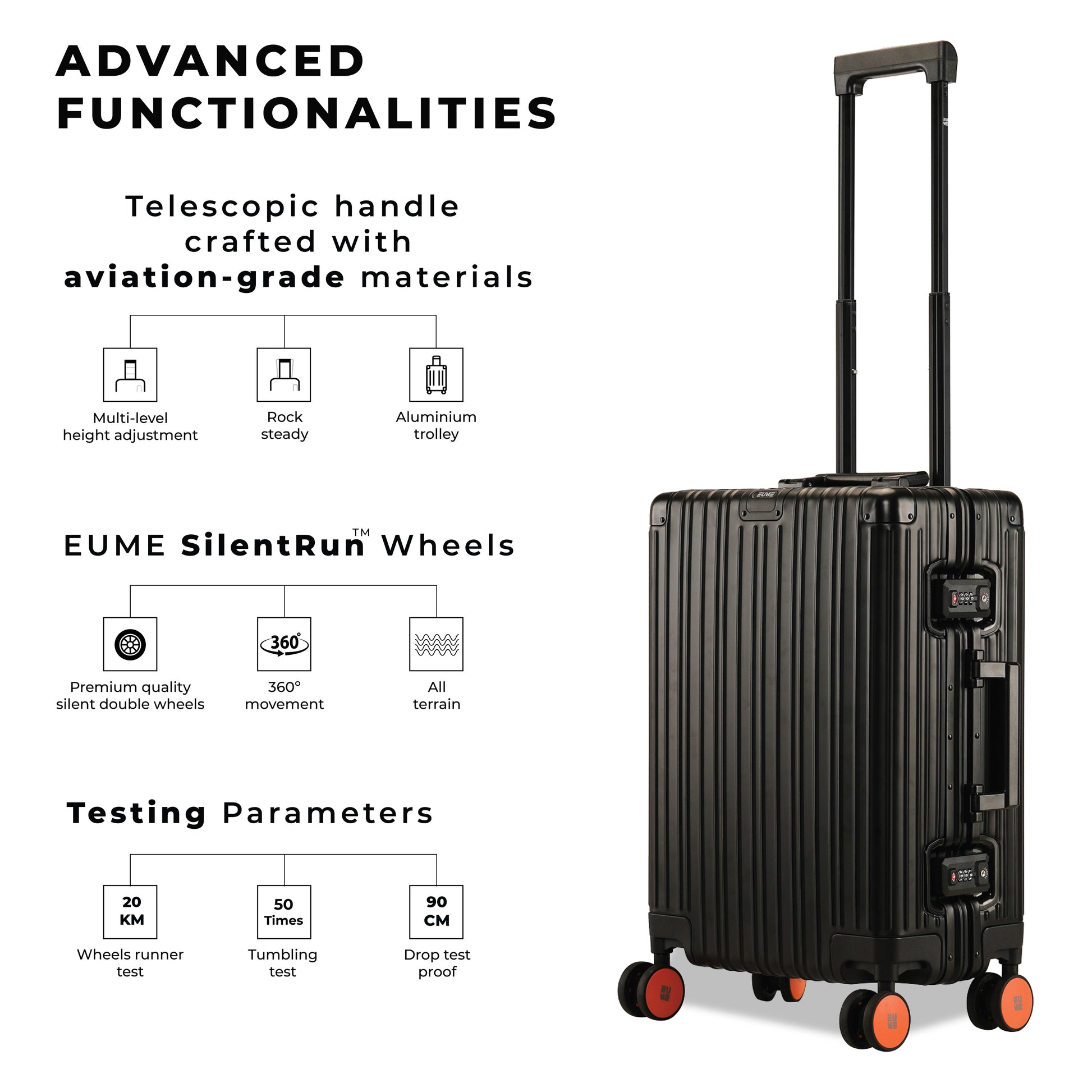 - The EUME Aluminium 20-inch cabin and 24- Inch check-in medium trolley bags for travel are meticulously crafted from 100% high-end anodized aluminium for durability and a stylish look. Equipped with 8 SilentRun 360-degree double wheels and a high-end steering system, our cabin trolley bags ensure sturdy and effortless movement. Discover the timeless elegance of Our Luggage Trolley, designed for longevity and perfect for short trips, fitting comfortably in most airline overhead compartments.