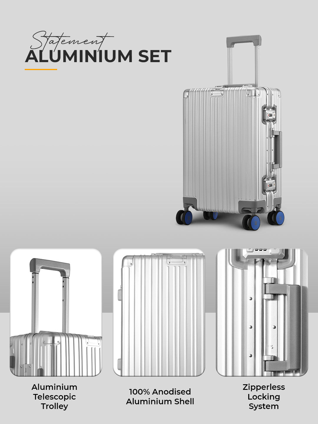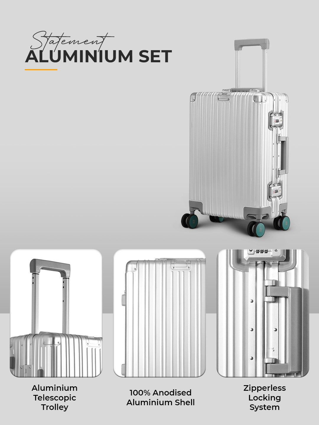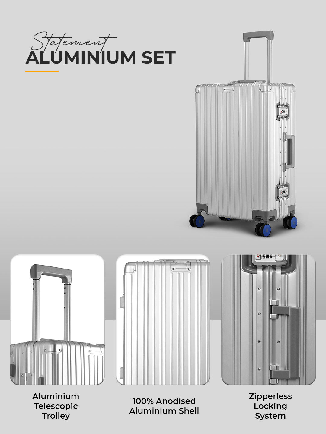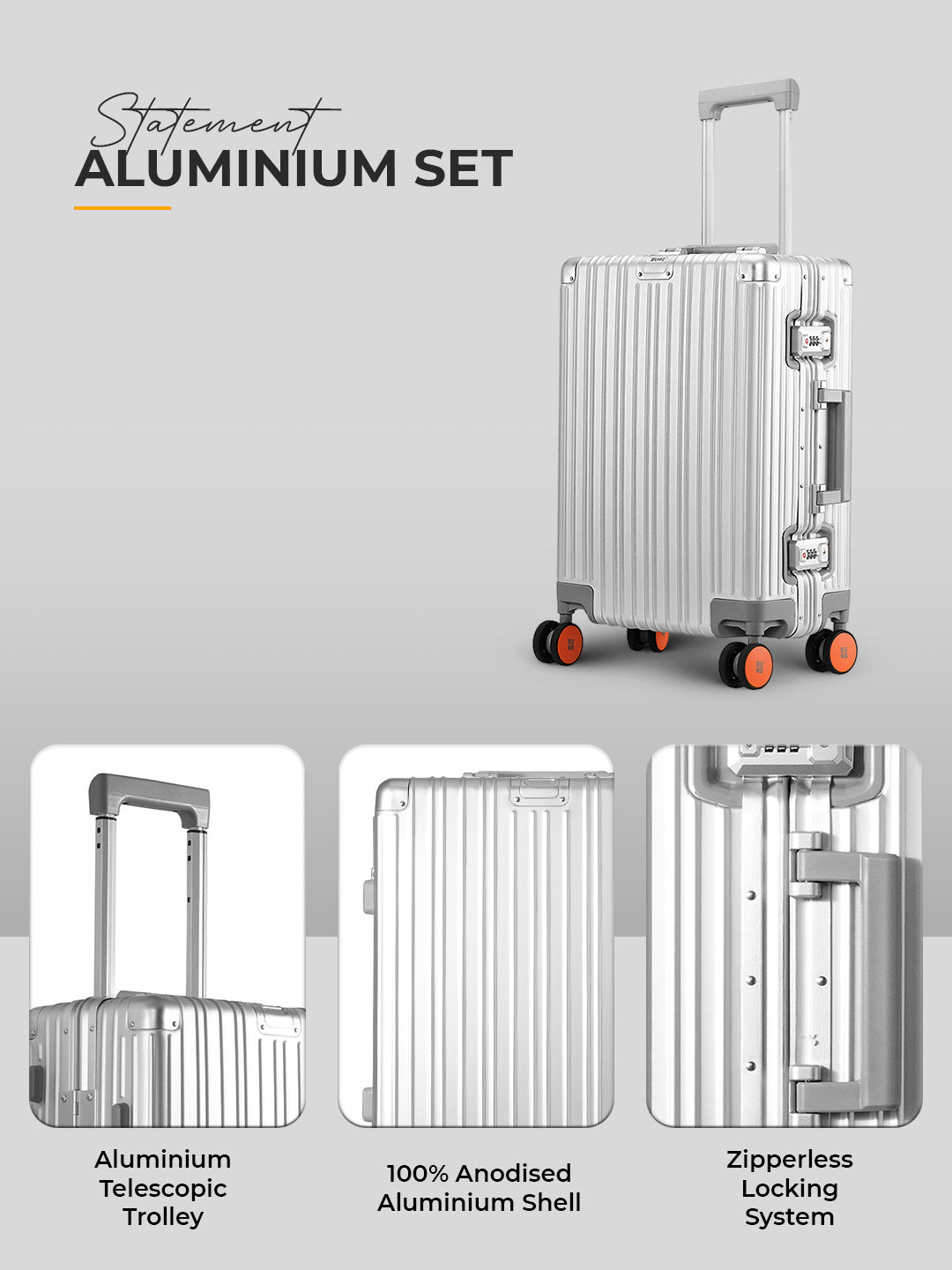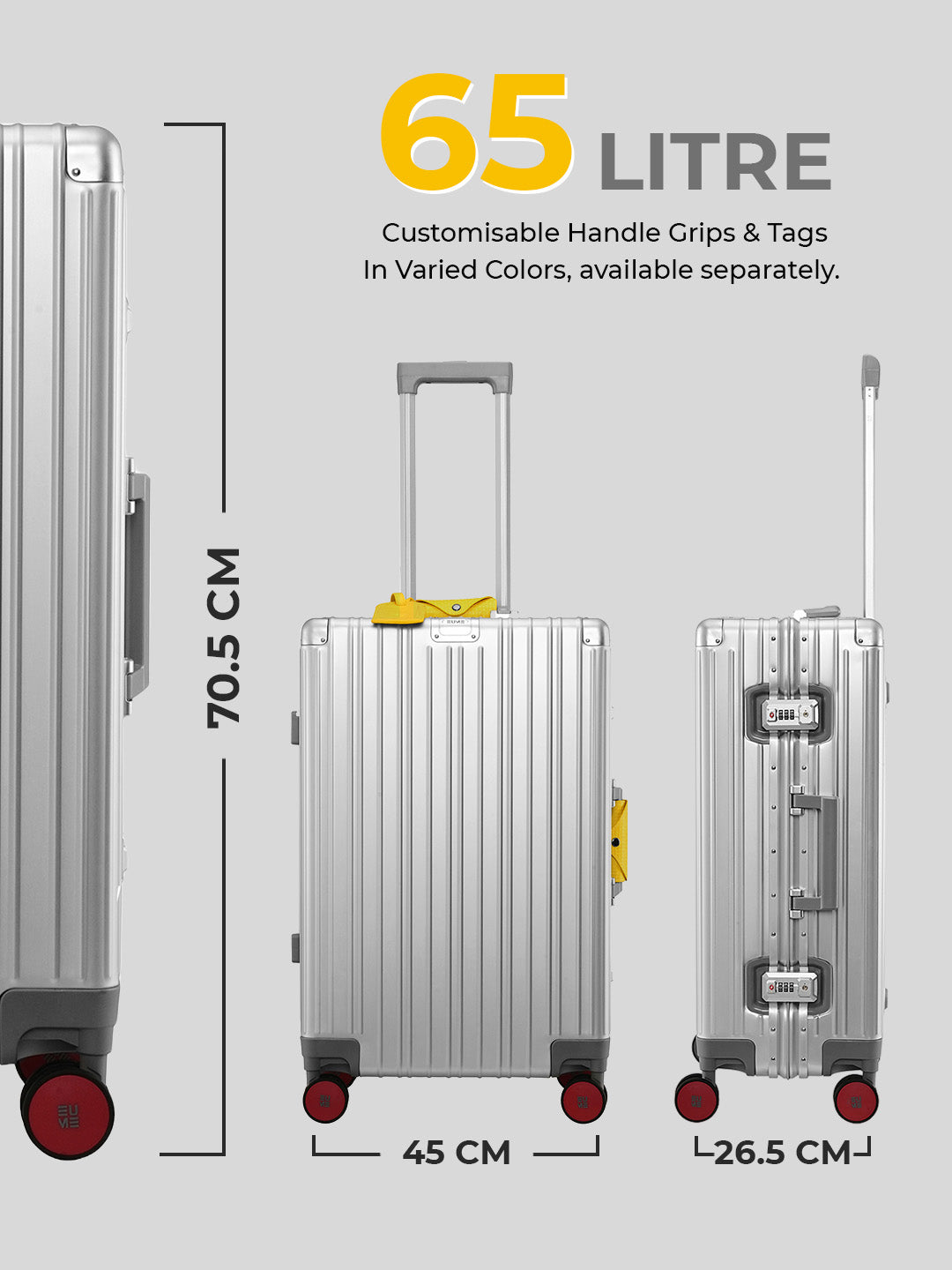 - The EUME Aluminium 20-inch cabin and 24- Inch check-in medium trolley bags for travel are meticulously crafted from 100% high-end anodized aluminium for durability and a stylish look. Equipped with 8 SilentRun 360-degree double wheels and a high-end steering system, our cabin trolley bags ensure sturdy and effortless movement. Discover the timeless elegance of Our Luggage Trolley, designed for longevity and perfect for short trips, fitting comfortably in most airline overhead compartments.