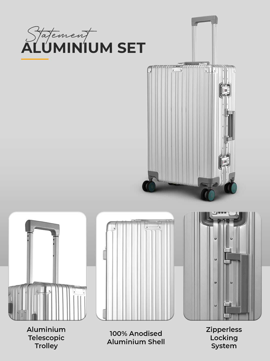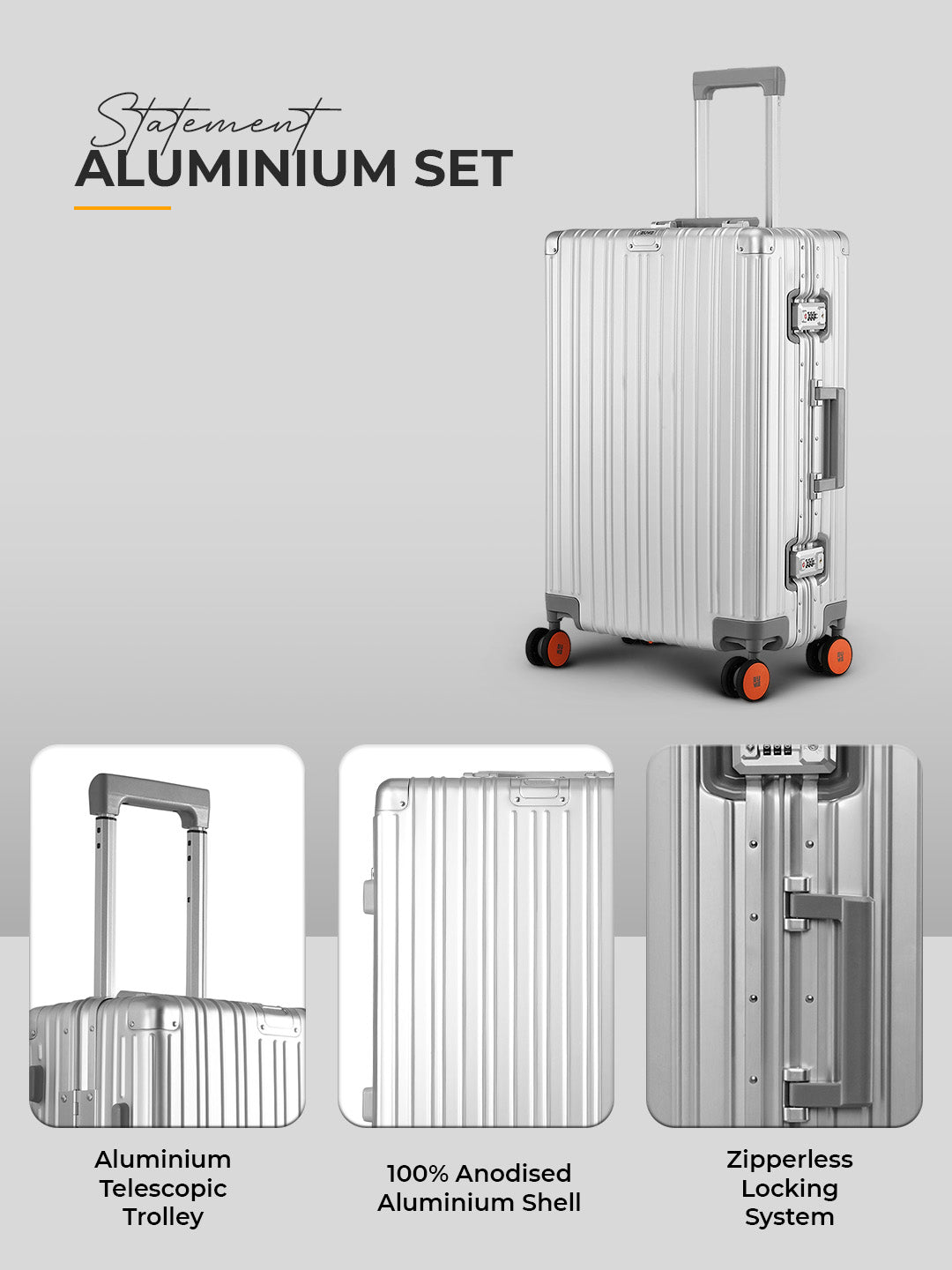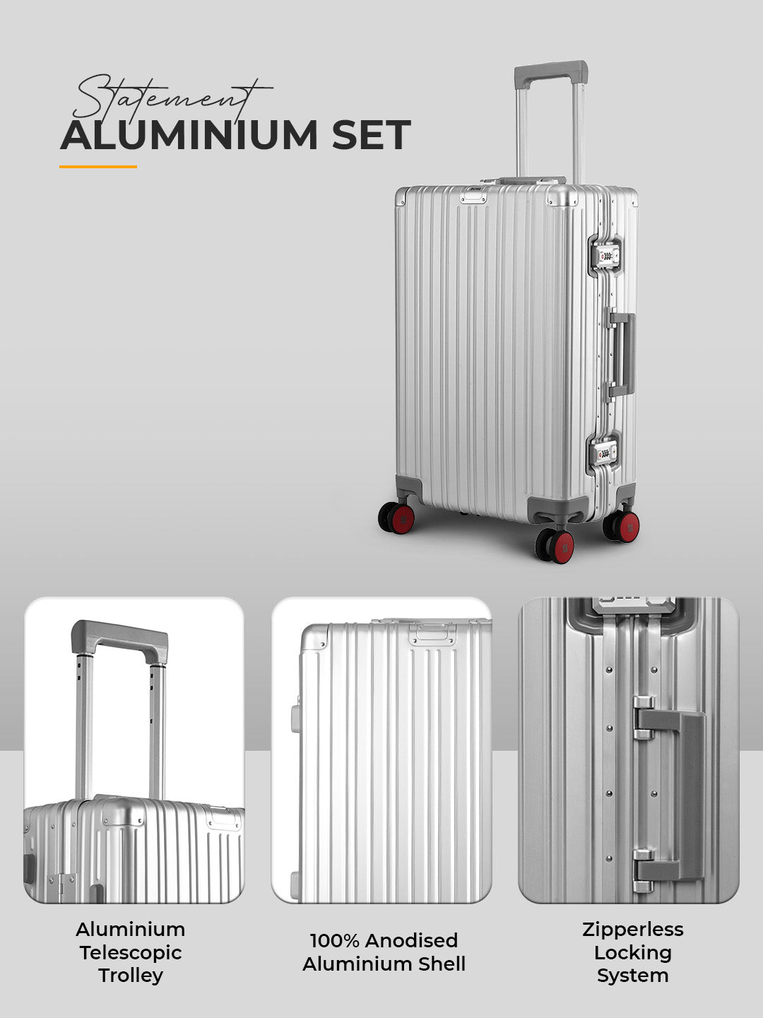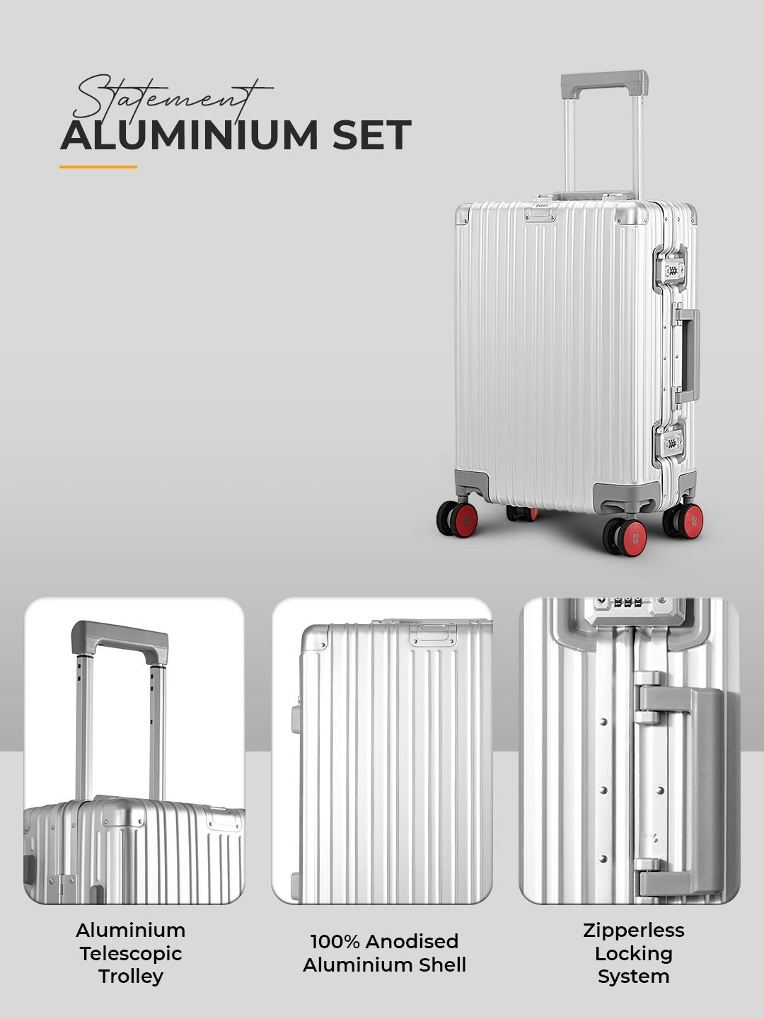 - The EUME Aluminium 20-inch cabin and 24- Inch check-in medium trolley bags for travel are meticulously crafted from 100% high-end anodized aluminium for durability and a stylish look. Equipped with 8 SilentRun 360-degree double wheels and a high-end steering system, our cabin trolley bags ensure sturdy and effortless movement. Discover the timeless elegance of Our Luggage Trolley, designed for longevity and perfect for short trips, fitting comfortably in most airline overhead compartments.