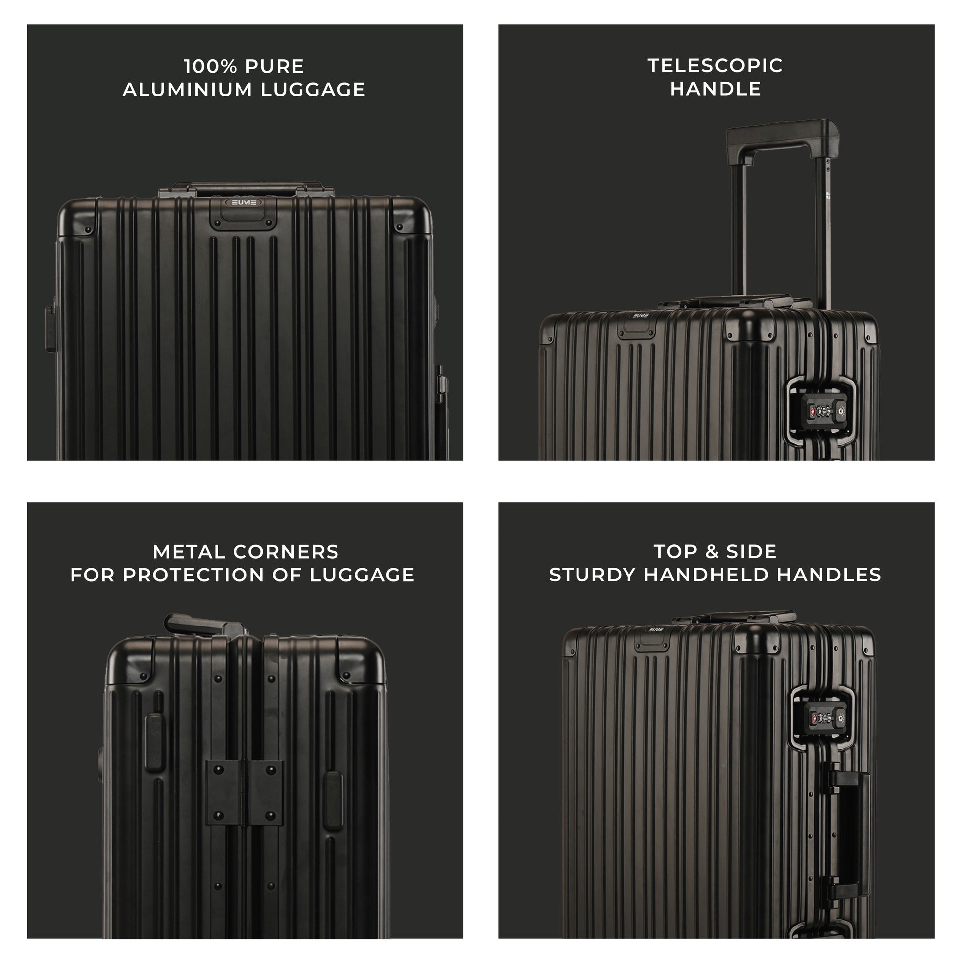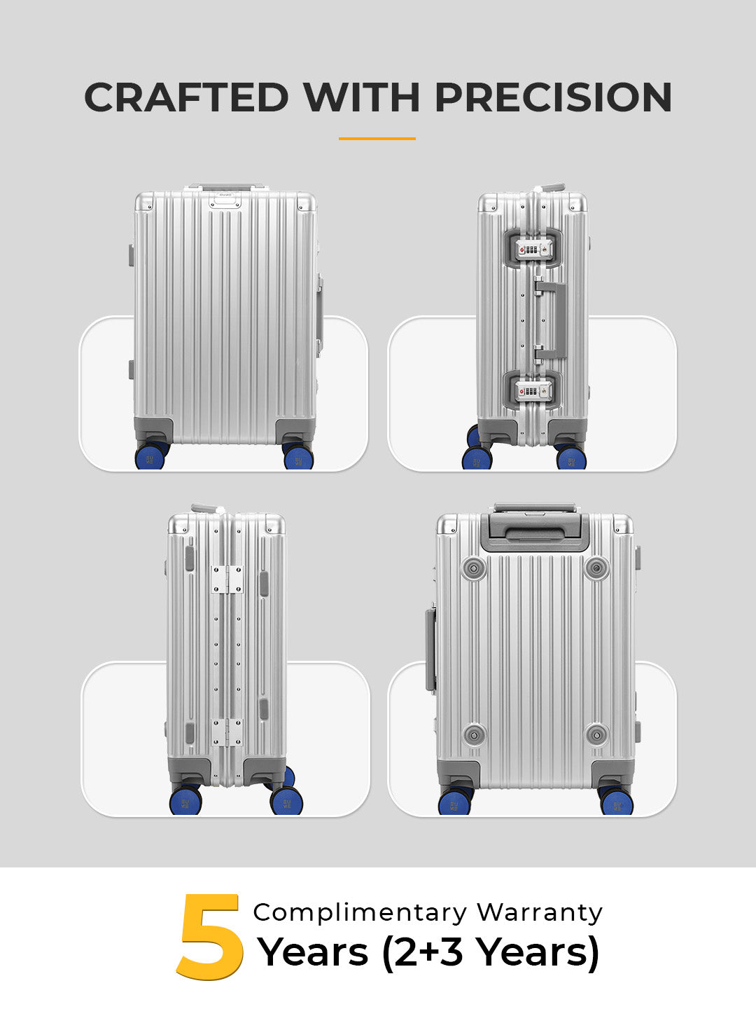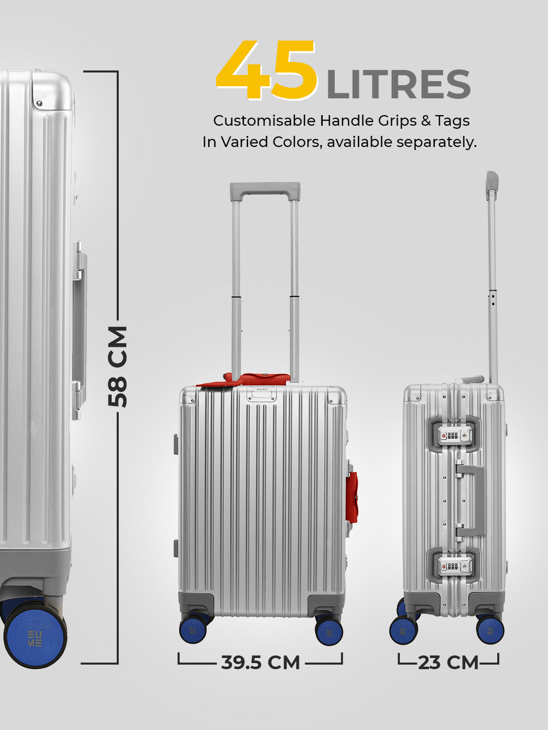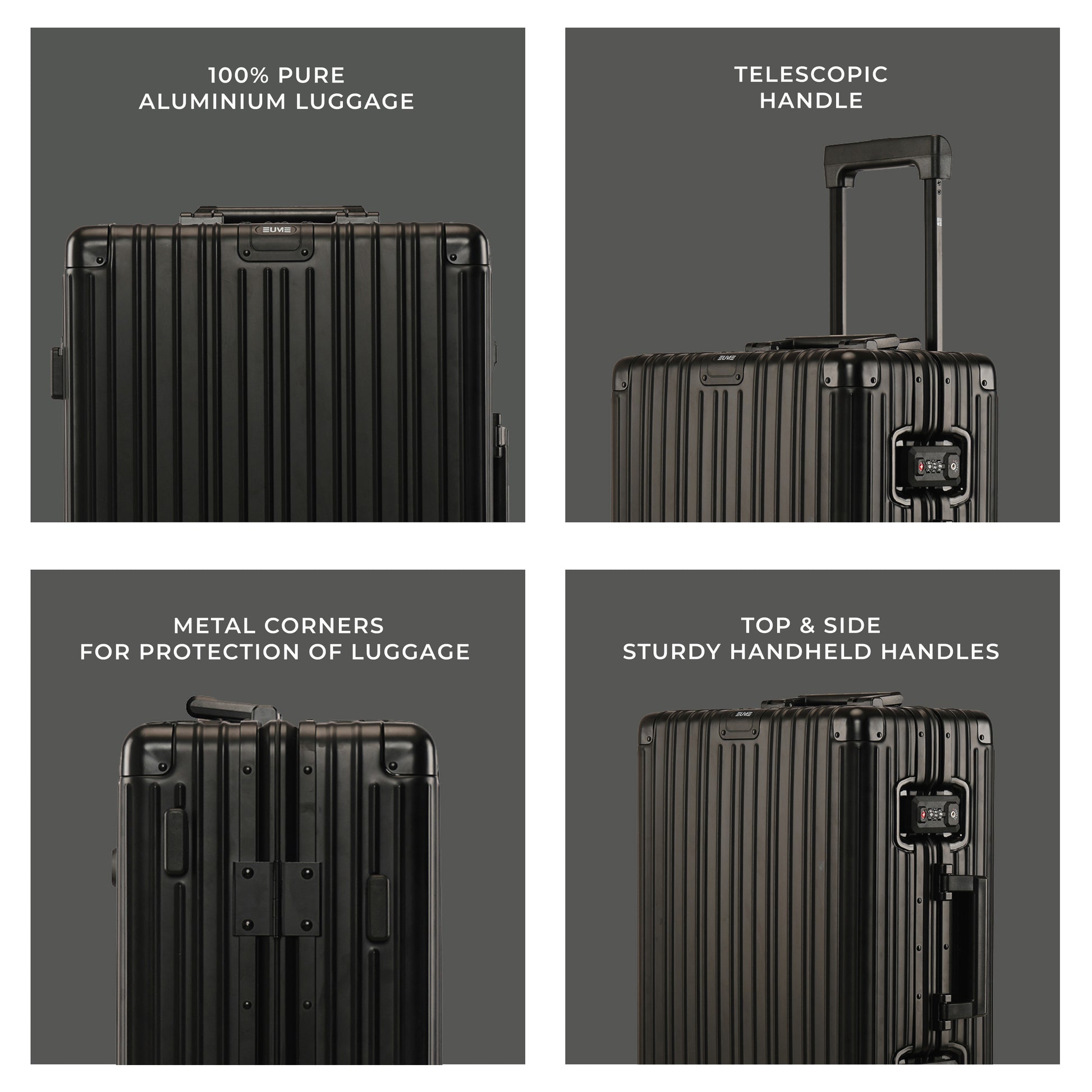 - The EUME Aluminium 20-inch cabin and 24- Inch check-in medium trolley bags for travel are meticulously crafted from 100% high-end anodized aluminium for durability and a stylish look. Equipped with 8 SilentRun 360-degree double wheels and a high-end steering system, our cabin trolley bags ensure sturdy and effortless movement. Discover the timeless elegance of Our Luggage Trolley, designed for longevity and perfect for short trips, fitting comfortably in most airline overhead compartments.