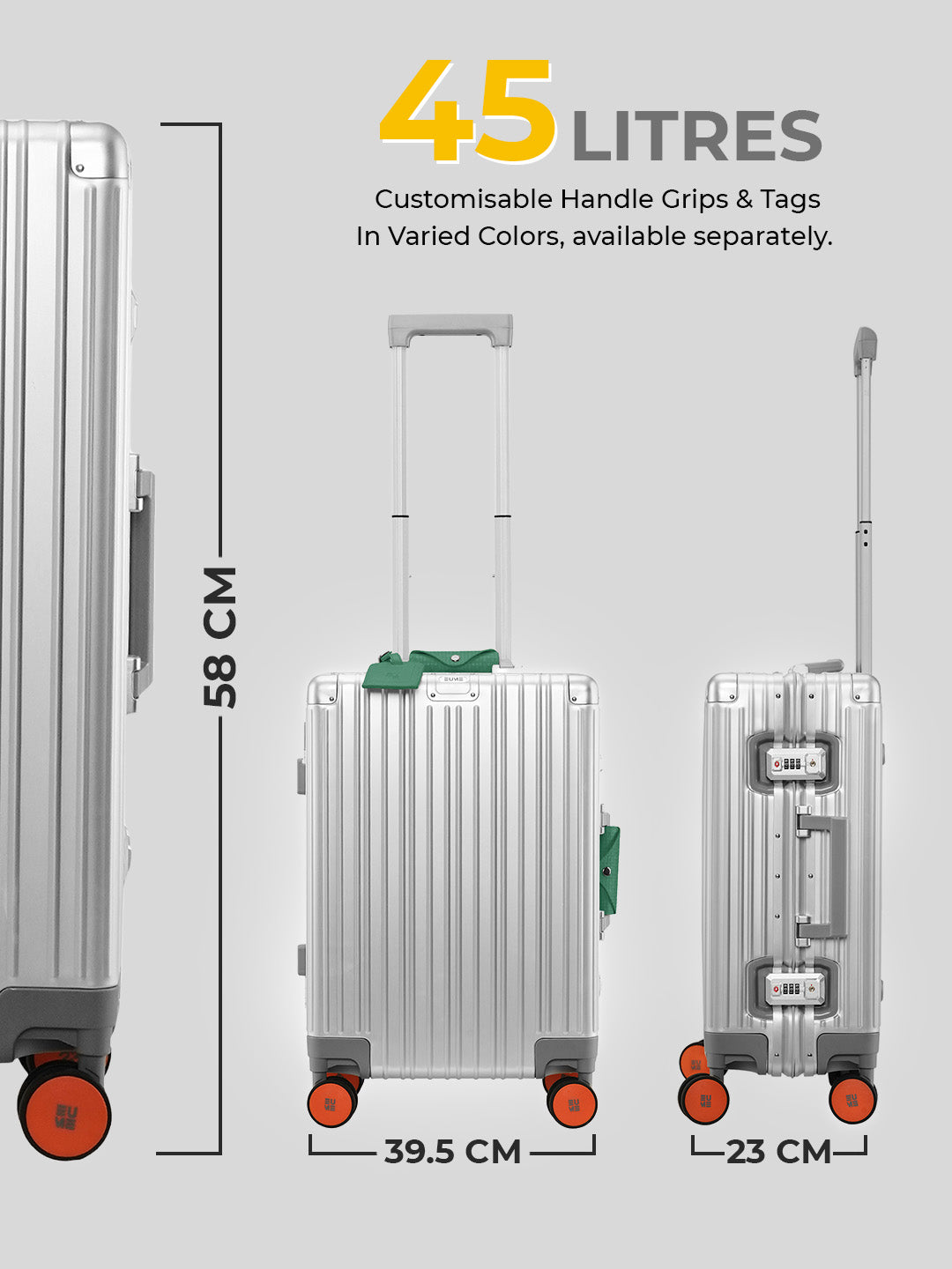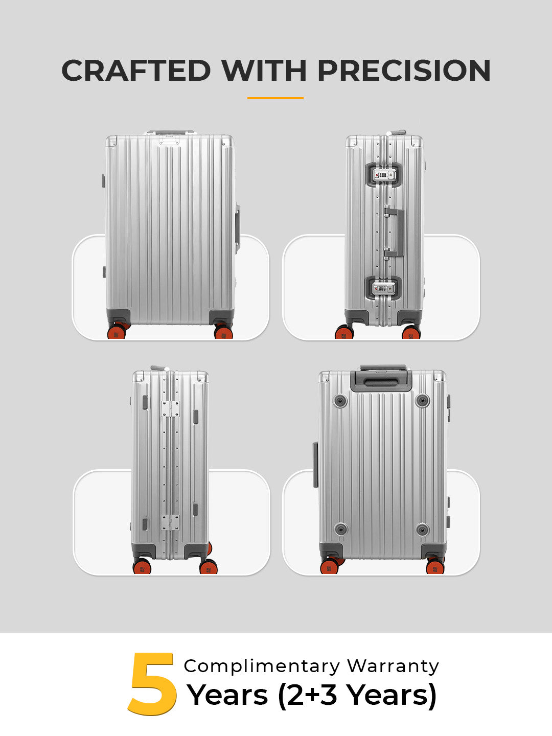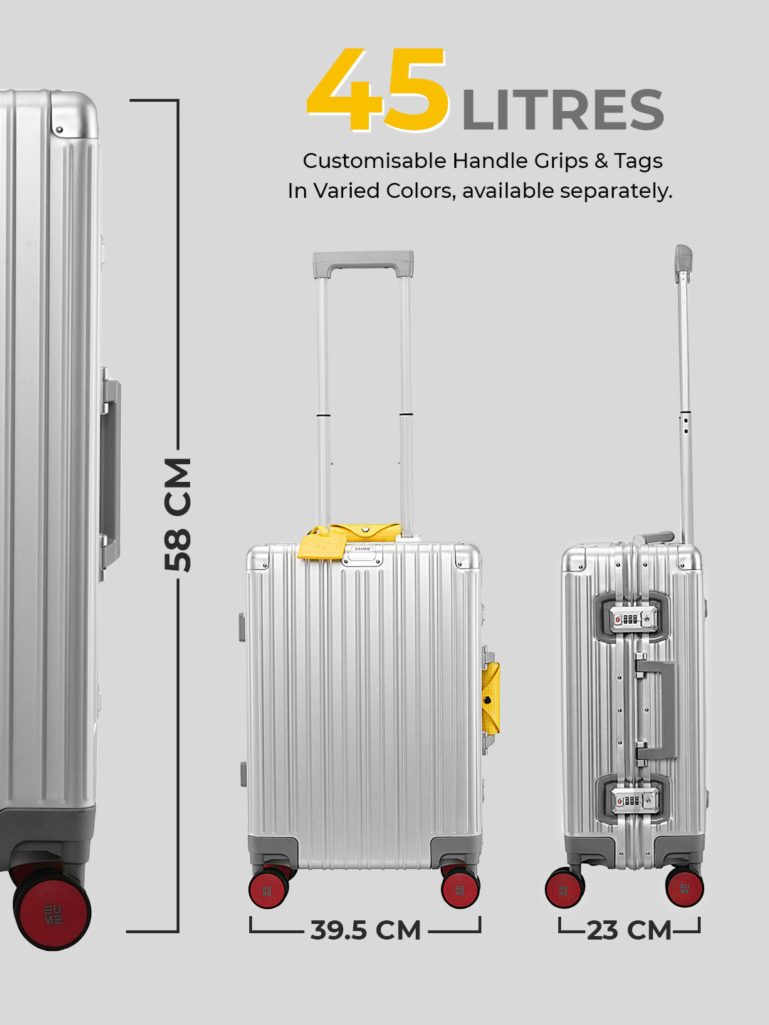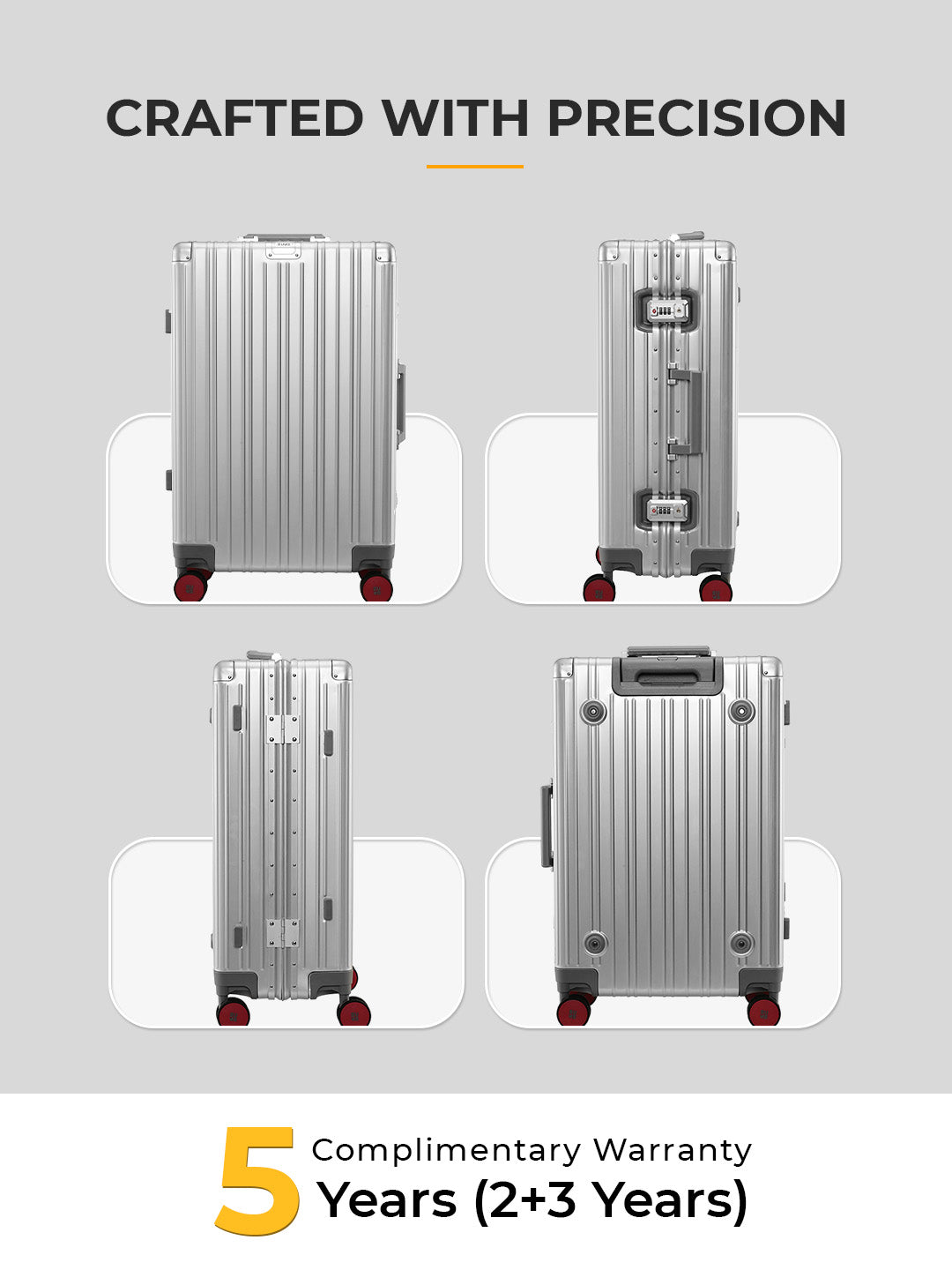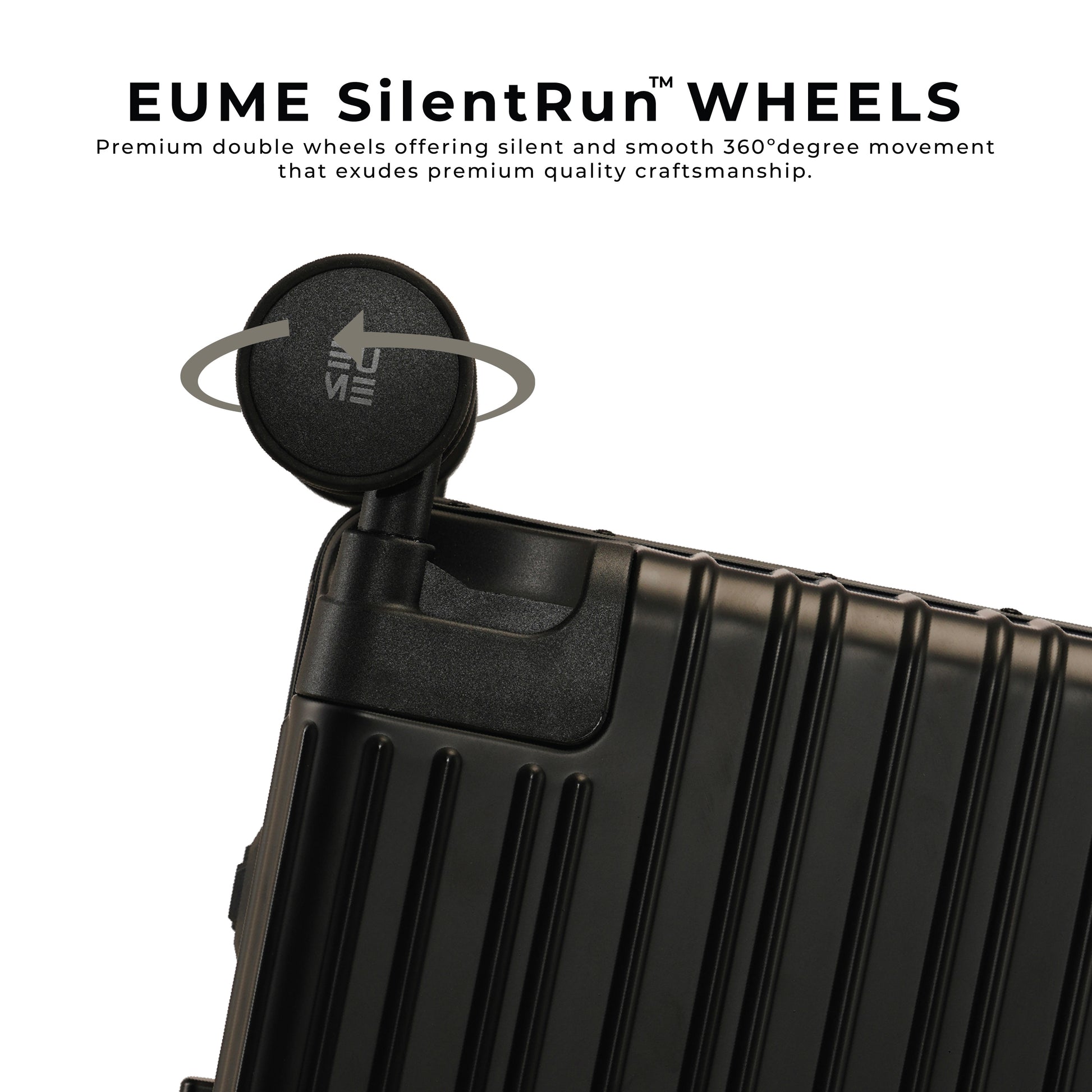 - The EUME Aluminium 20-inch cabin and 24- Inch check-in medium trolley bags for travel are meticulously crafted from 100% high-end anodized aluminium for durability and a stylish look. Equipped with 8 SilentRun 360-degree double wheels and a high-end steering system, our cabin trolley bags ensure sturdy and effortless movement. Discover the timeless elegance of Our Luggage Trolley, designed for longevity and perfect for short trips, fitting comfortably in most airline overhead compartments.