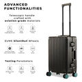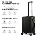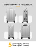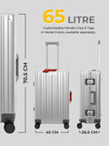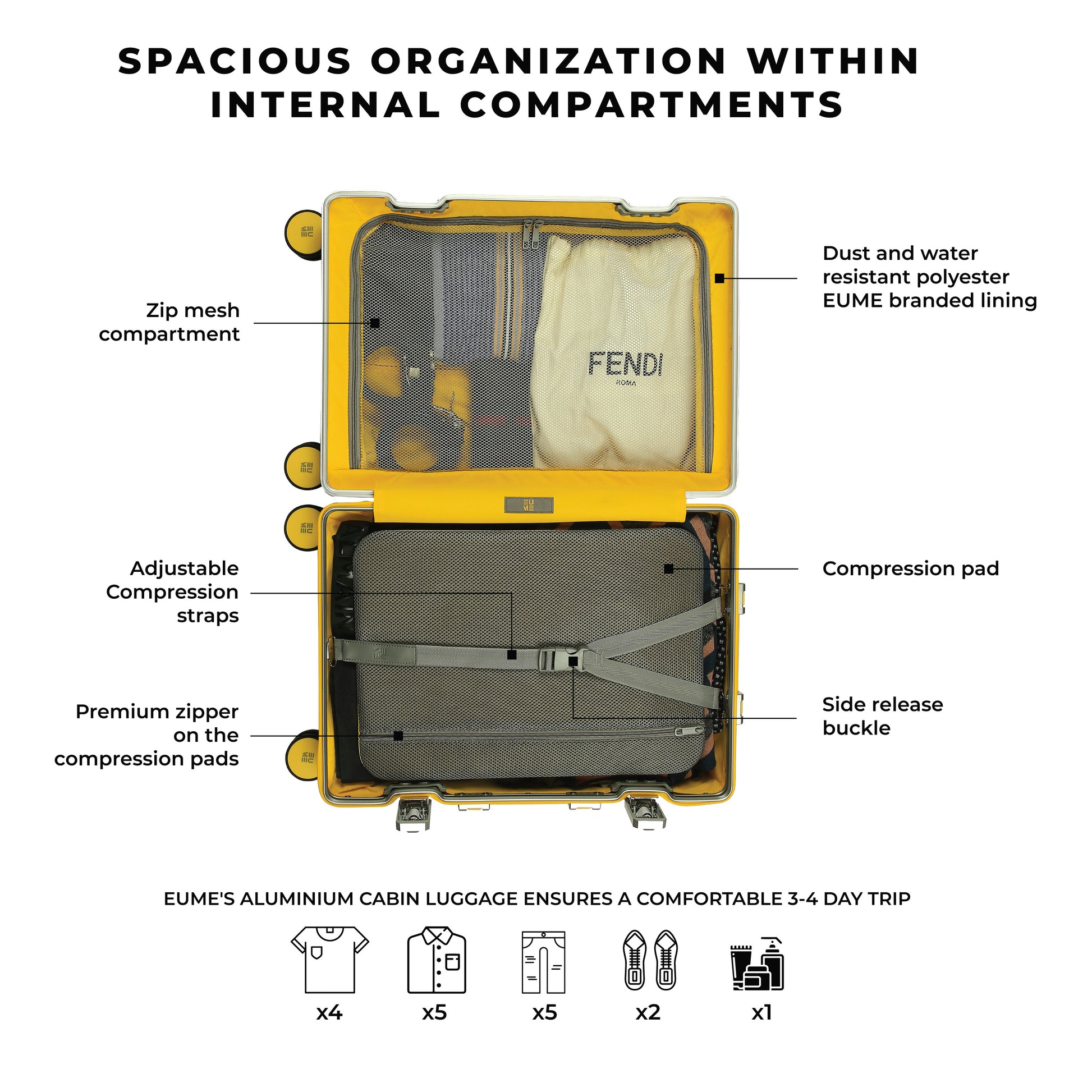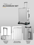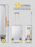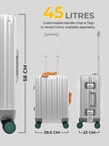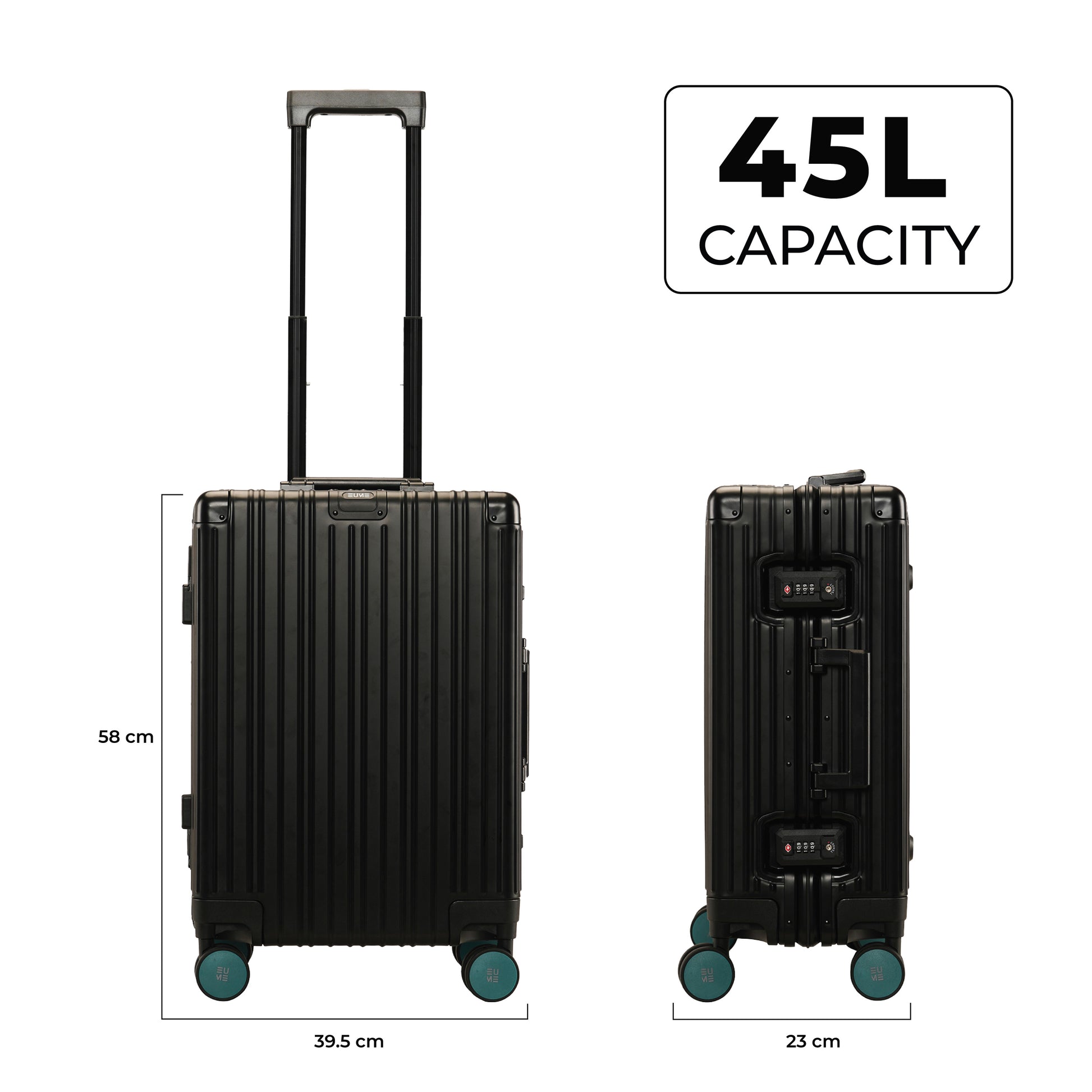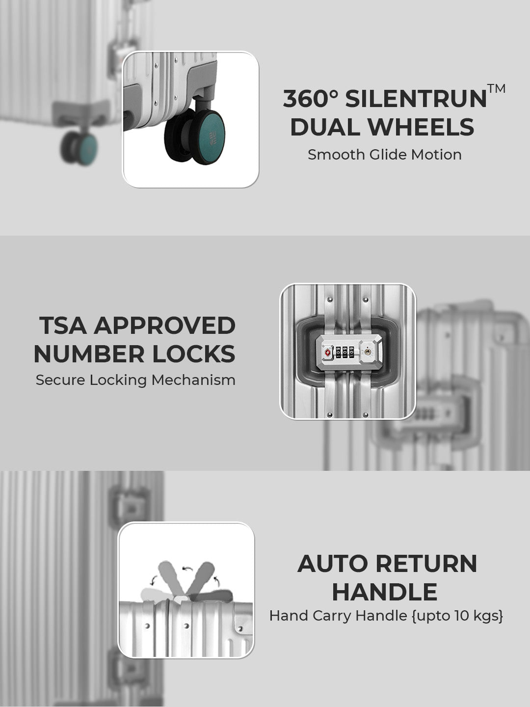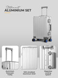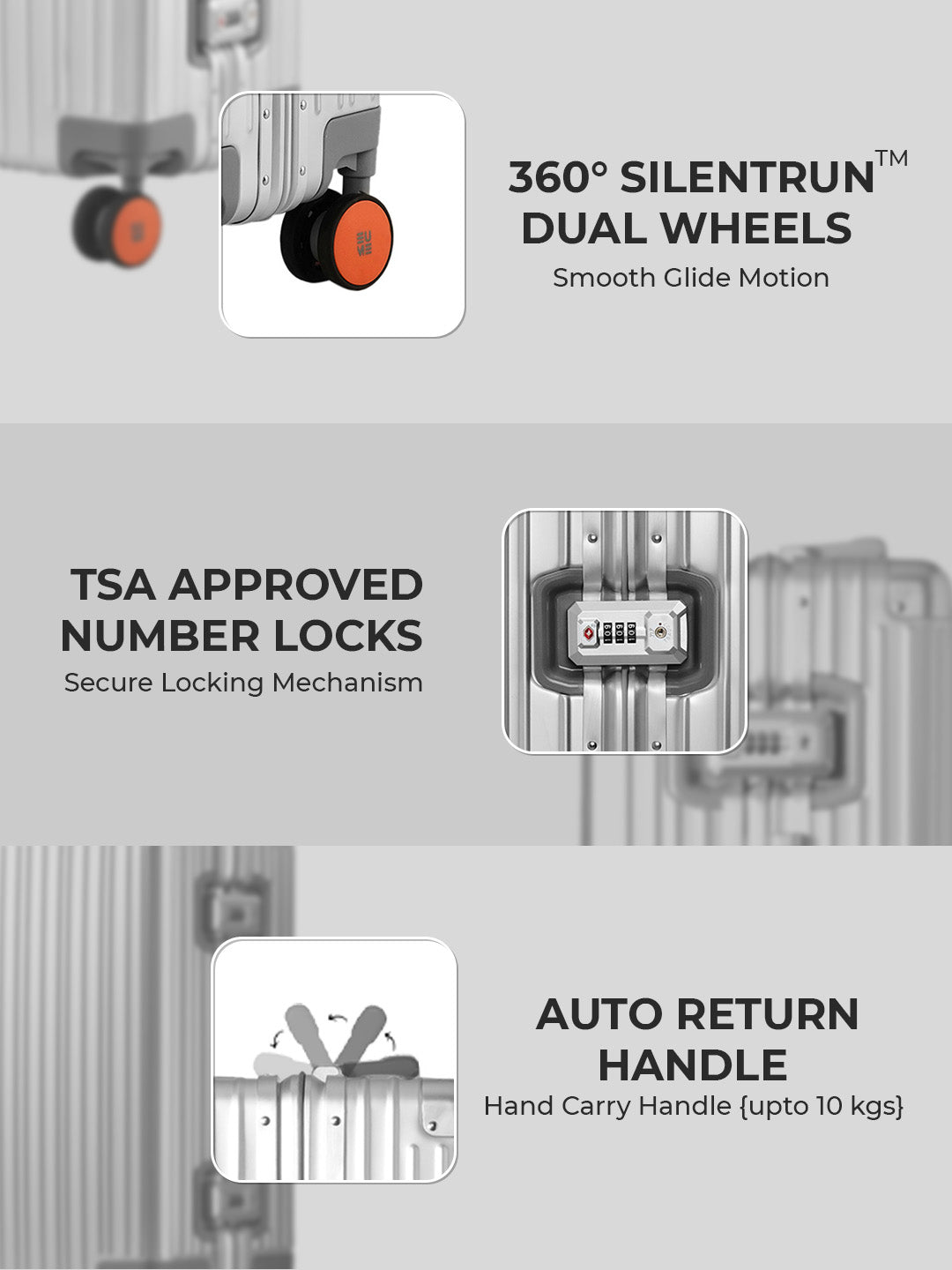 - The EUME Aluminium 20-inch cabin and 24- Inch check-in medium trolley bags for travel are meticulously crafted from 100% high-end anodized aluminium for durability and a stylish look. Equipped with 8 SilentRun 360-degree double wheels and a high-end steering system, our cabin trolley bags ensure sturdy and effortless movement. Discover the timeless elegance of Our Luggage Trolley, designed for longevity and perfect for short trips, fitting comfortably in most airline overhead compartments.