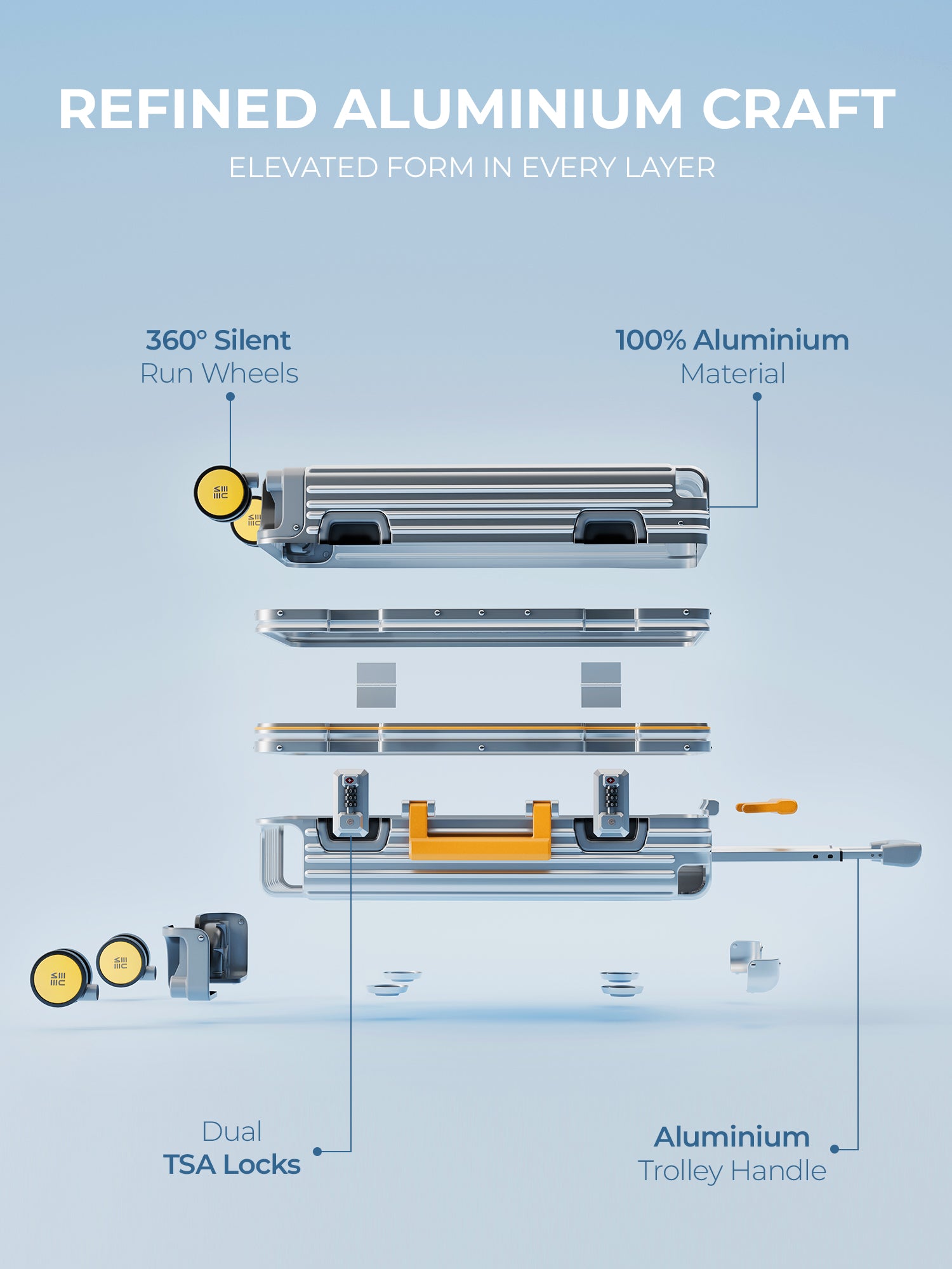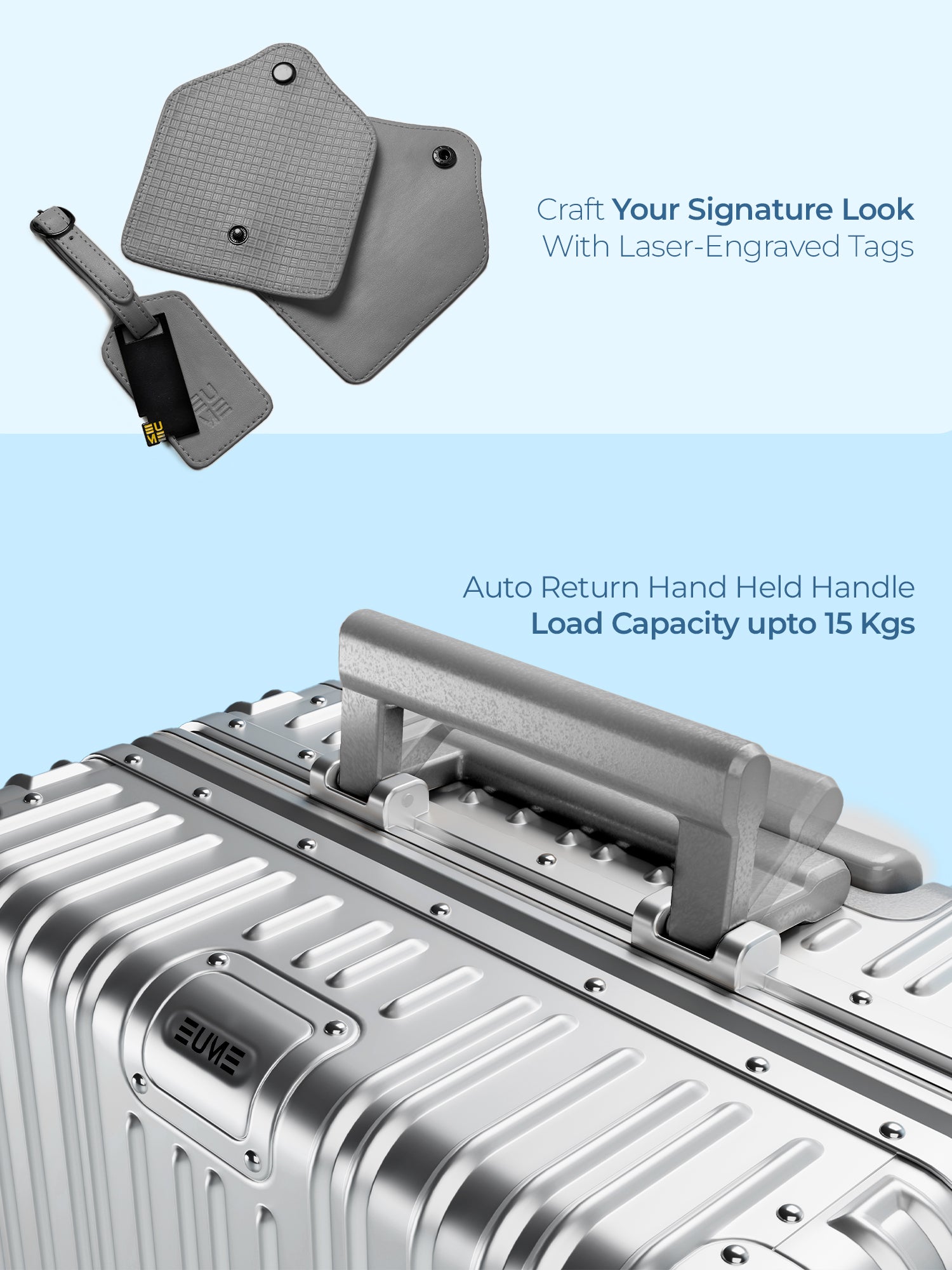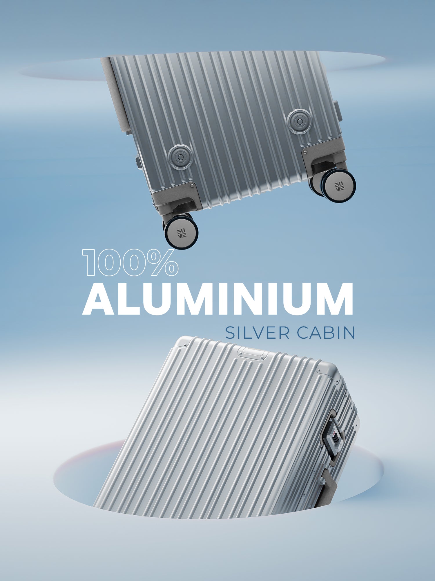 - The EUME Aluminium 20-inch cabin trolley bags for travel are meticulously crafted from 100% high-end anodized aluminium for durability and a stylish look. Equipped with 8 SilentRun 360-degree double wheels and a high-end steering system, our cabin trolley bags ensure sturdy and effortless movement. Discover the timeless elegance of Our Luggage Trolley, designed for longevity and perfect for short trips, fitting comfortably in most airline overhead compartments.