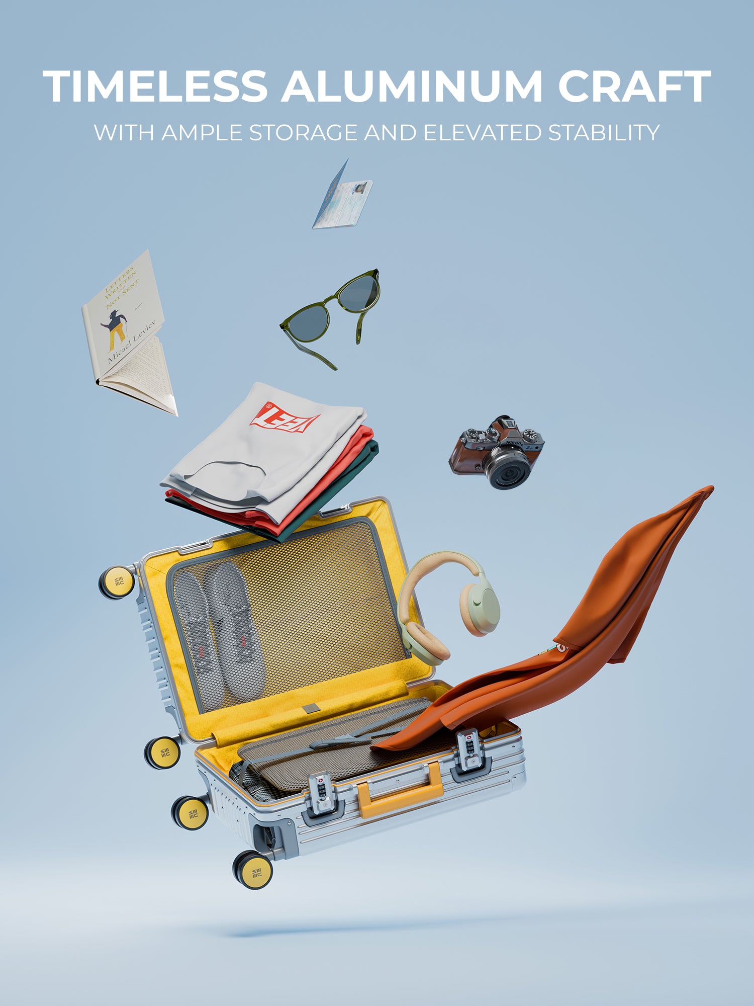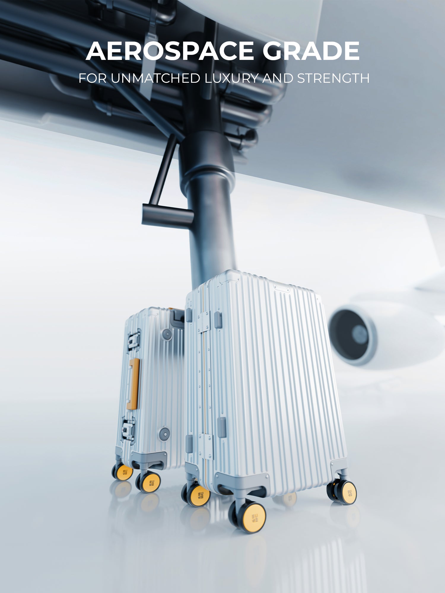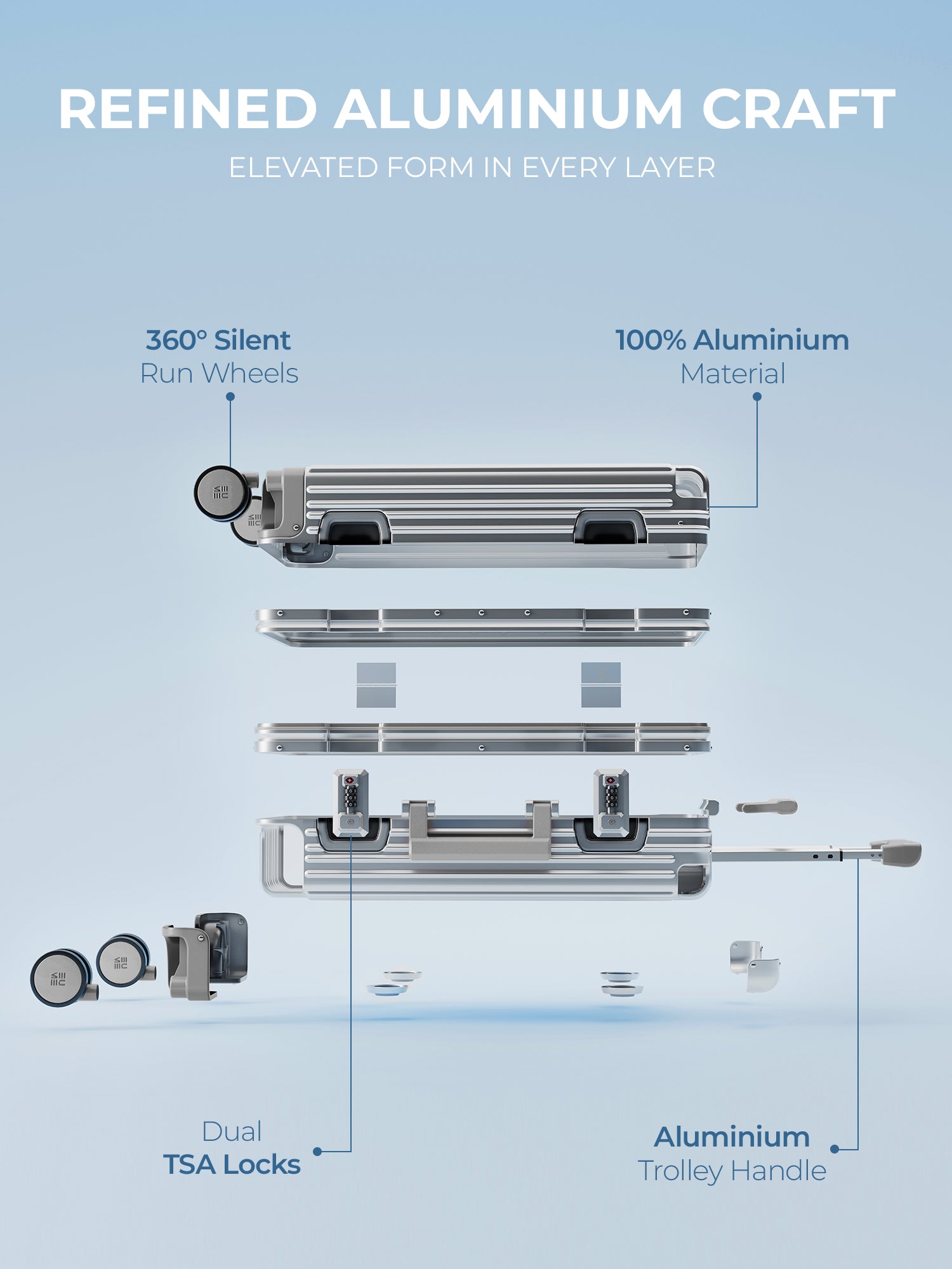 - The EUME Aluminium 20-inch cabin trolley bags for travel are meticulously crafted from 100% high-end anodized aluminium for durability and a stylish look. Equipped with 8 SilentRun 360-degree double wheels and a high-end steering system, our cabin trolley bags ensure sturdy and effortless movement. Discover the timeless elegance of Our Luggage Trolley, designed for longevity and perfect for short trips, fitting comfortably in most airline overhead compartments.