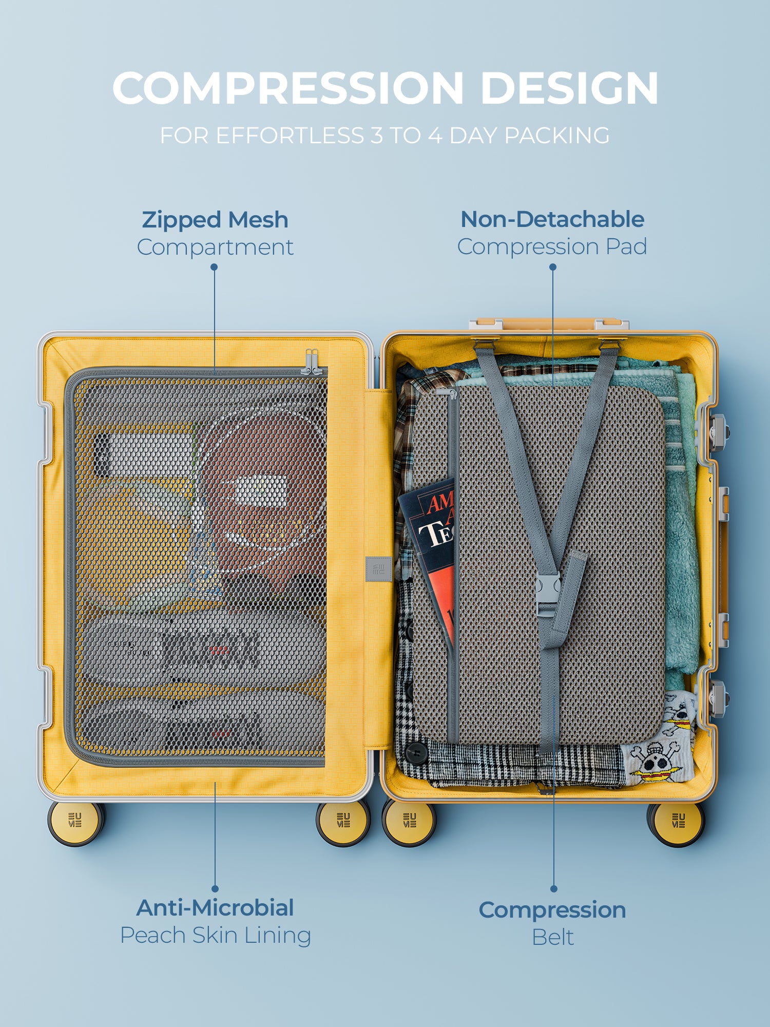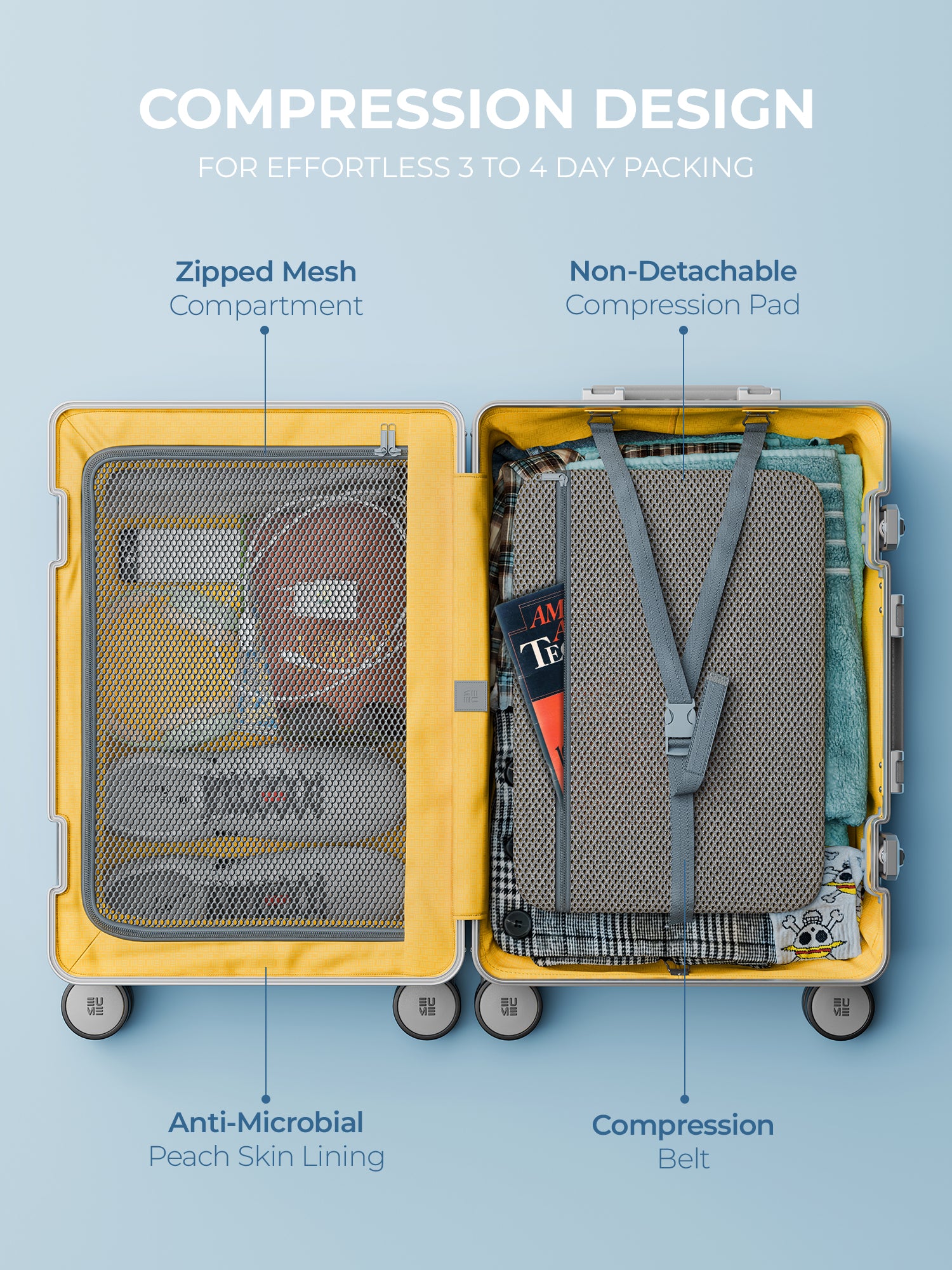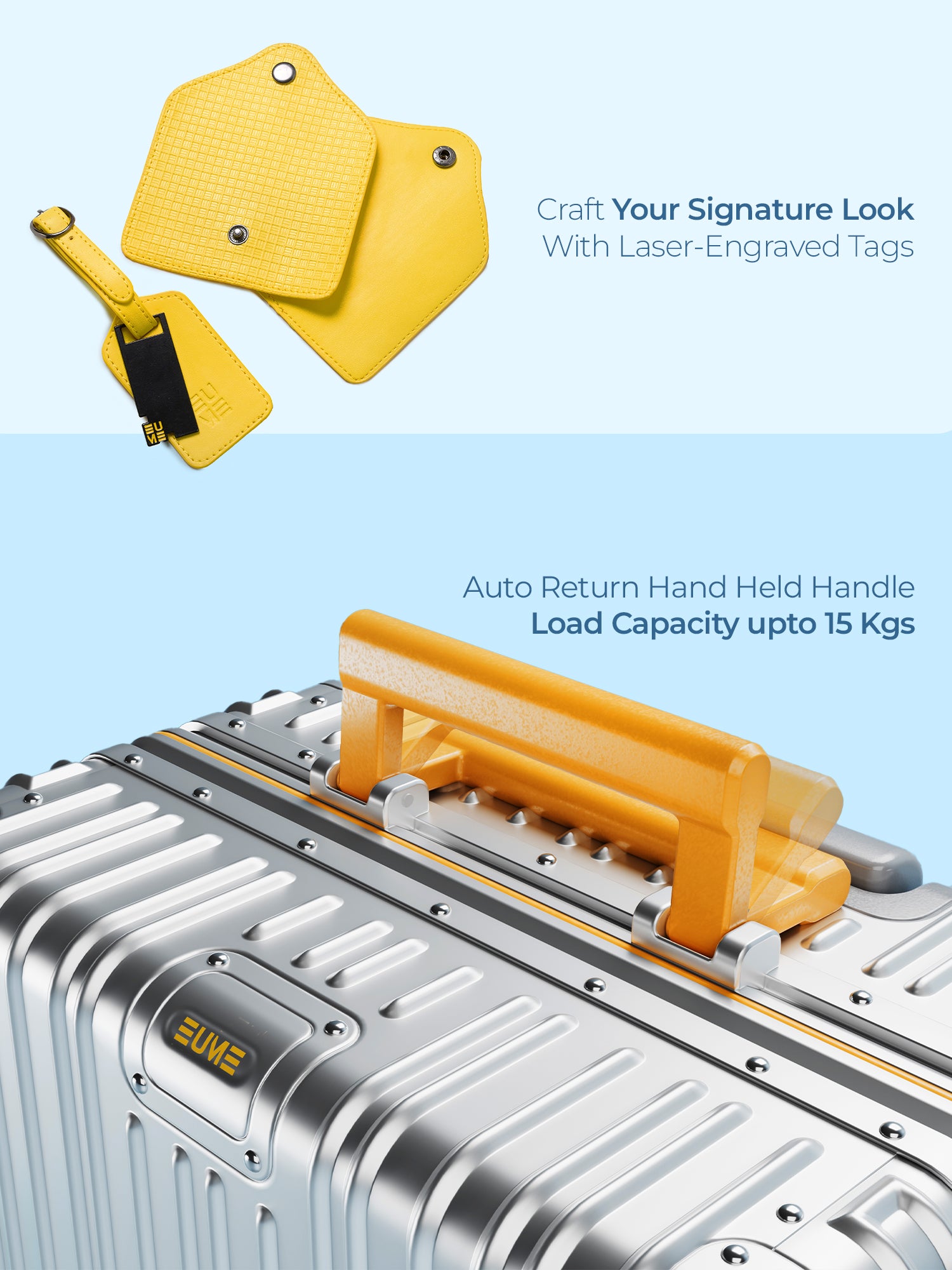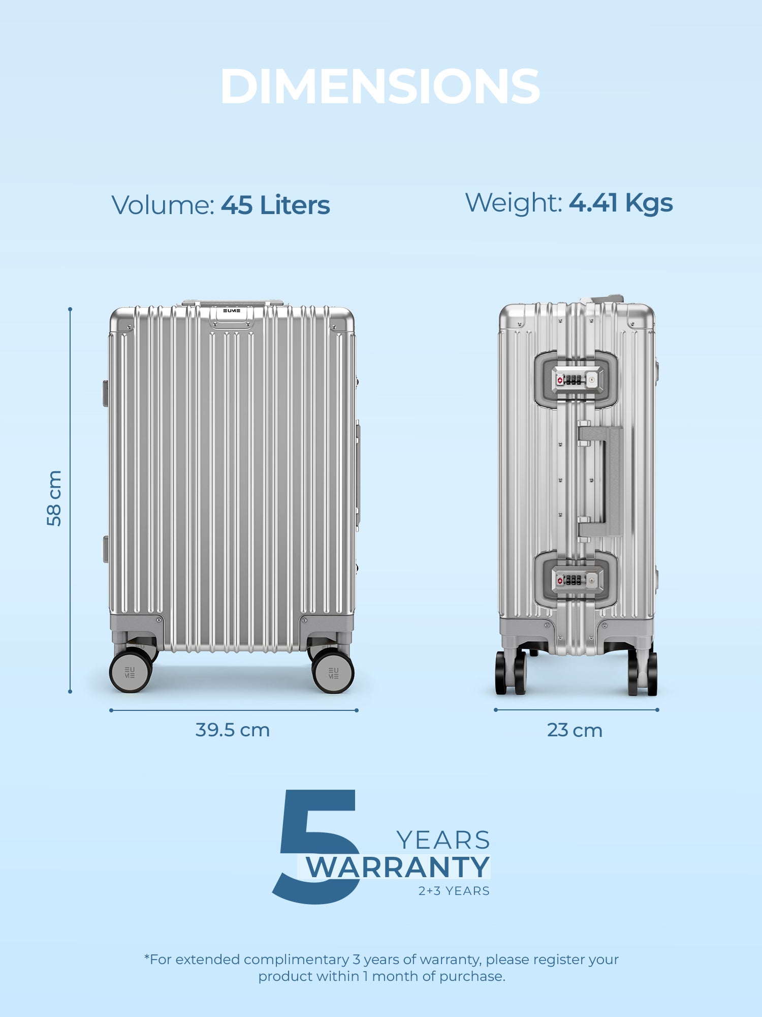- The Eume Aluminium Cabin Luggage is backed by a 5-Year Warranty by EUME against all manufacturing defects. This warranty is broken into a complimentary 2-year warranty by EUME. To enjoy an extended 3 years of warranty for free, please register your product within 1 month of purchase.