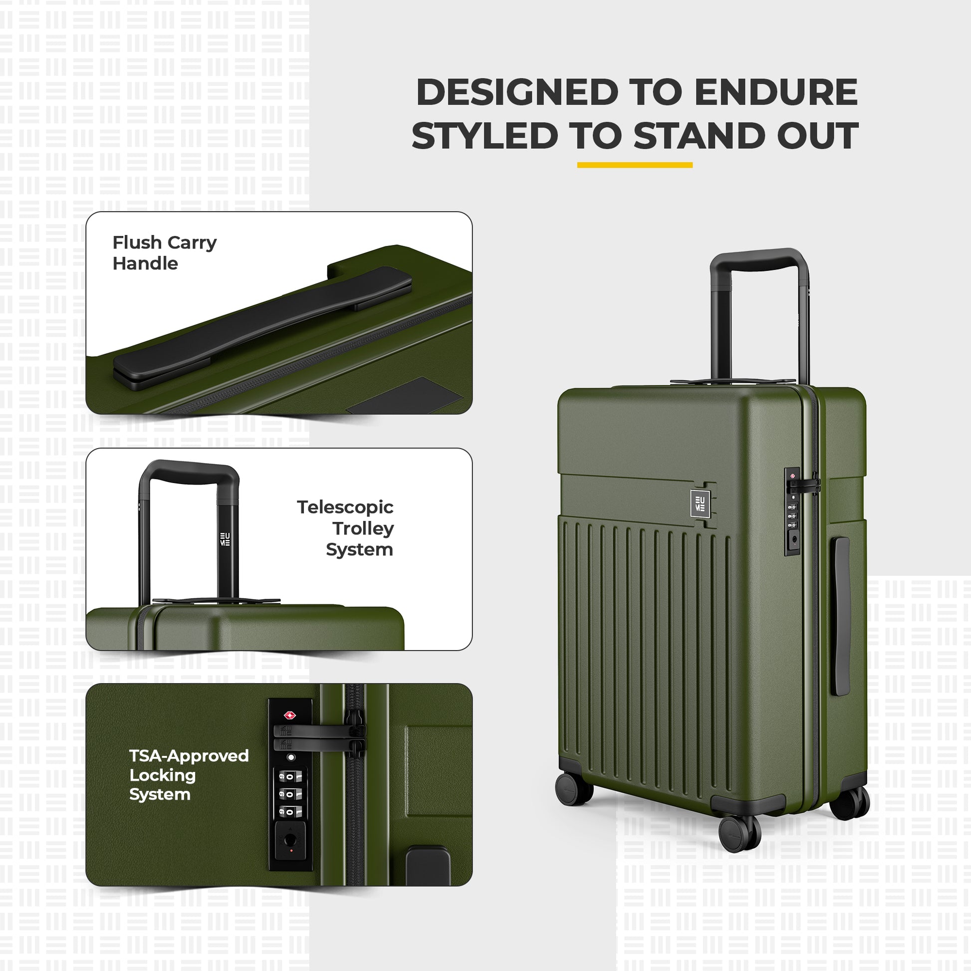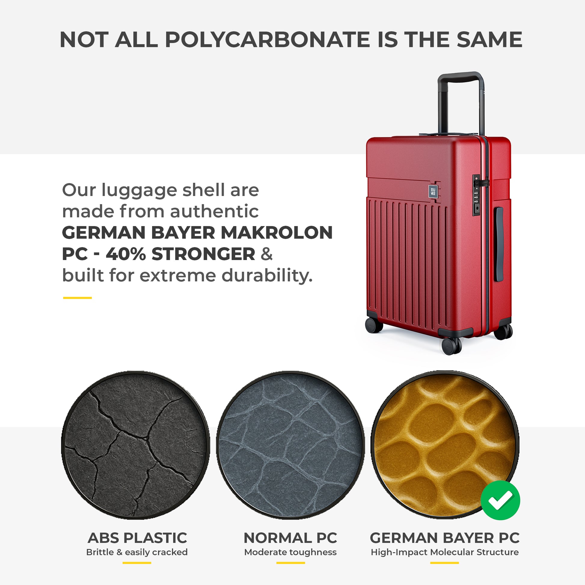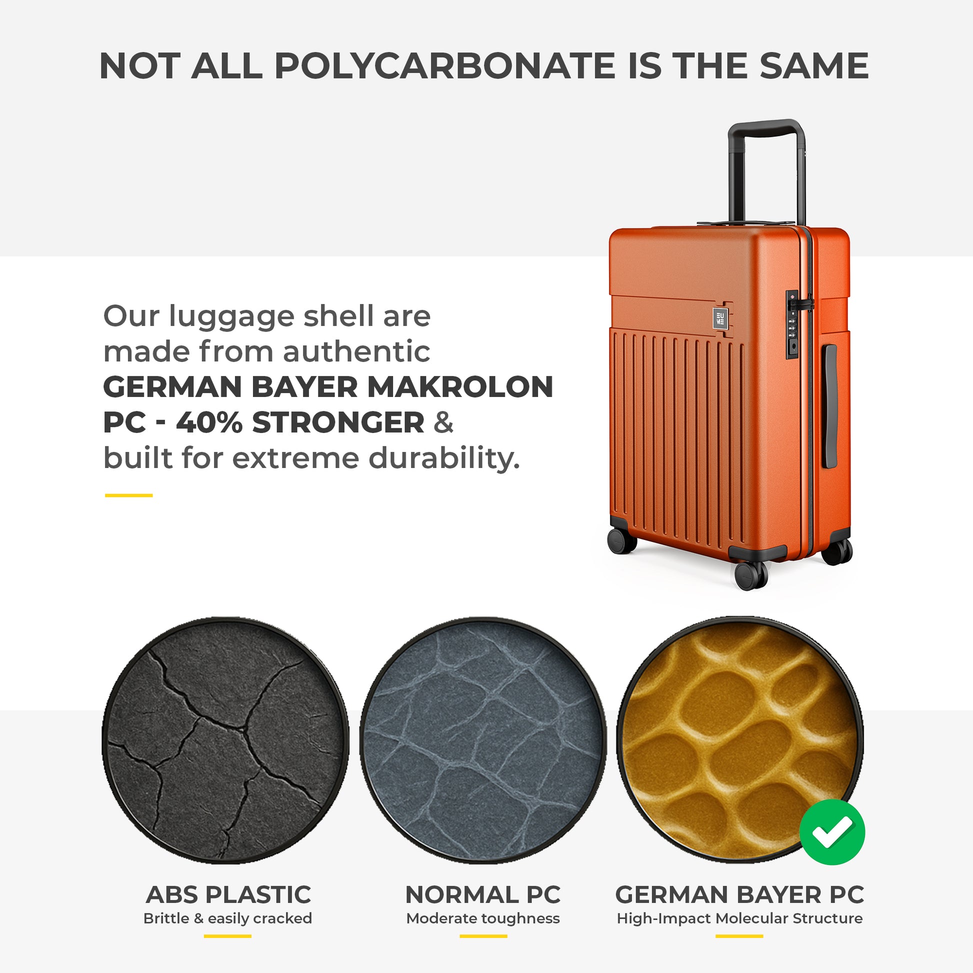 - The Eume luggage is expertly crafted from 100% german bayer recycled polycarbonate, ensuring exceptional durability and resilience. This material offers three key benefits: it is remarkably lightweight, impervious to chemical and temperature extremes, and highly resistant to cracking.