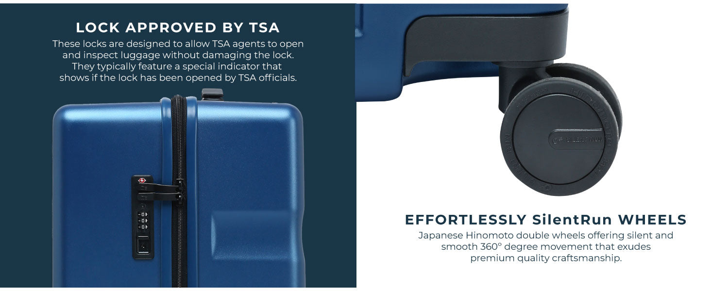 - The silent-run pro double wheels, powered by Hinomoto Japanese technology, ensure smooth and silent handling across any terrain. Security is a top priority, facilitated by TSA-approved combination locks, providing peace of mind while traveling.