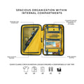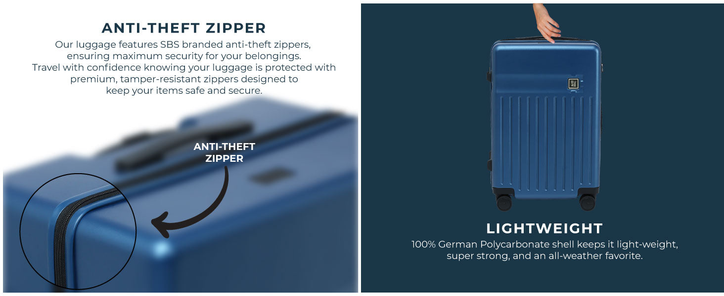 - An antitheft zipper mechanism from SBS further safeguards belongings from unauthorized access. Inside, the luggage offers superior organization with two compartments: one secured by a zipper closure with a zipper pocket on top, and the other featuring a compression pad with a spill-proof zipper pocket and a net zipper pocket for essentials and toiletries. The compression pad serves a triple purpose: it acts as storage for small essentials, keeps clothing in place, and can be hung in hotel rooms with a hook on the back, ensuring toiletries or other items remain organized and accessible only when needed.
