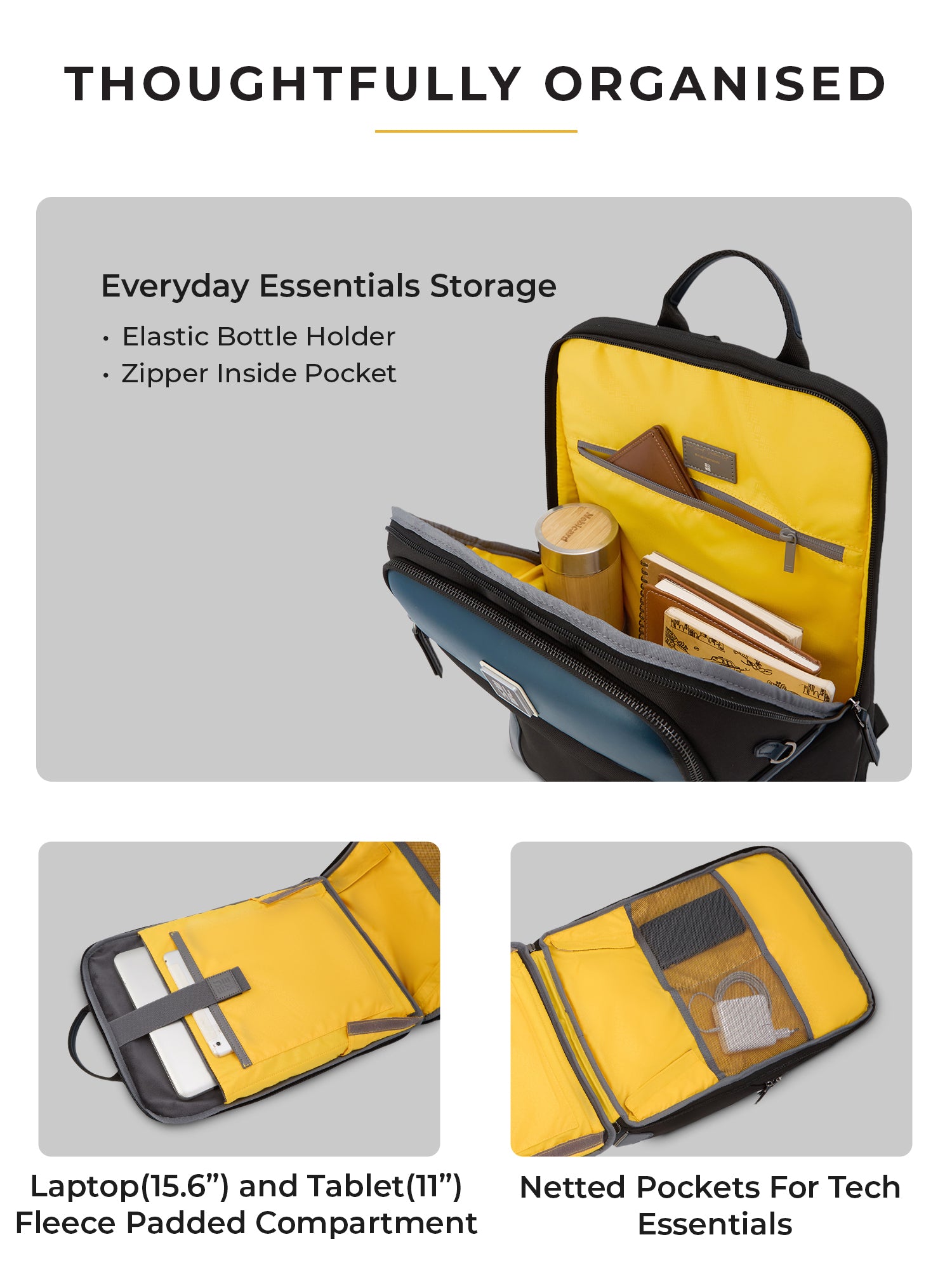 - With a 25-litre capacity, sleek professional look, and lightweight build, this backpack seamlessly transitions from work to travel, from office to airport.