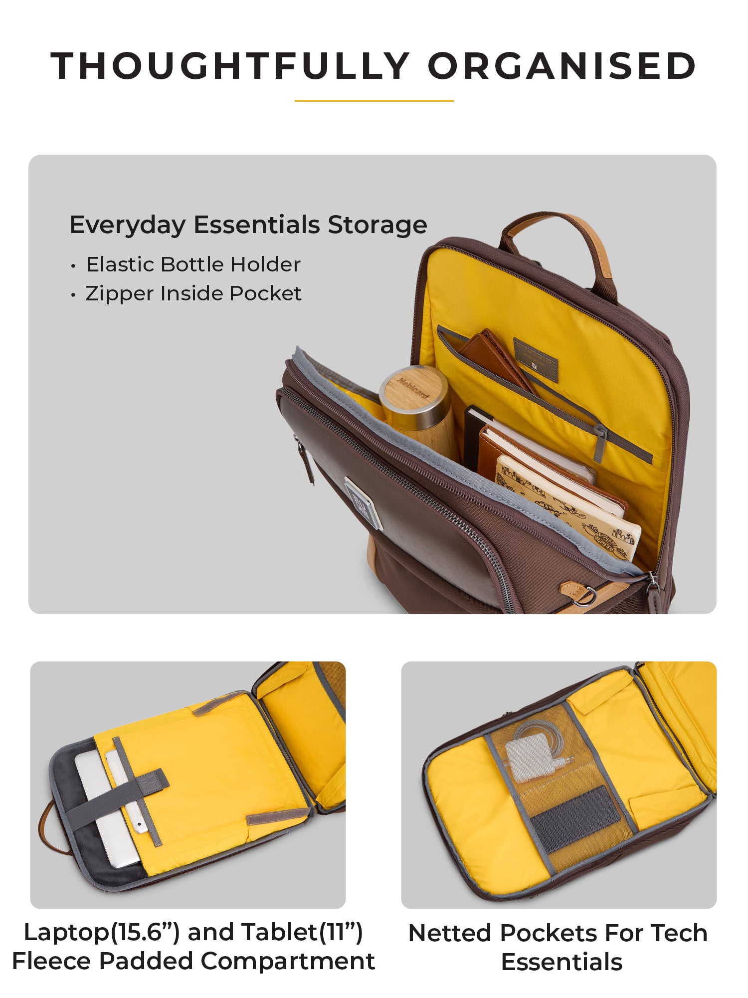 - Made from advanced bounce-back nylon fabric, this backpack retains its clean silhouette while offering excellent durability and water resistance. The thoughtfully designed interior includes a fleece-padded laptop compartment (15.6 inch), a separate tablet sleeve, and multiple tech-organising pockets to keep cables, chargers, notebooks, and essentials neatly arranged.