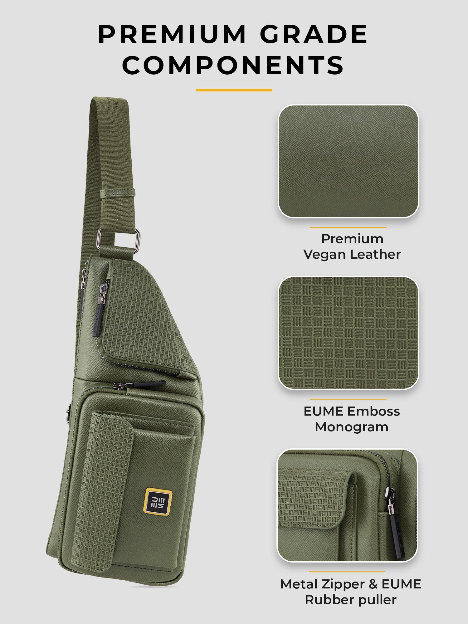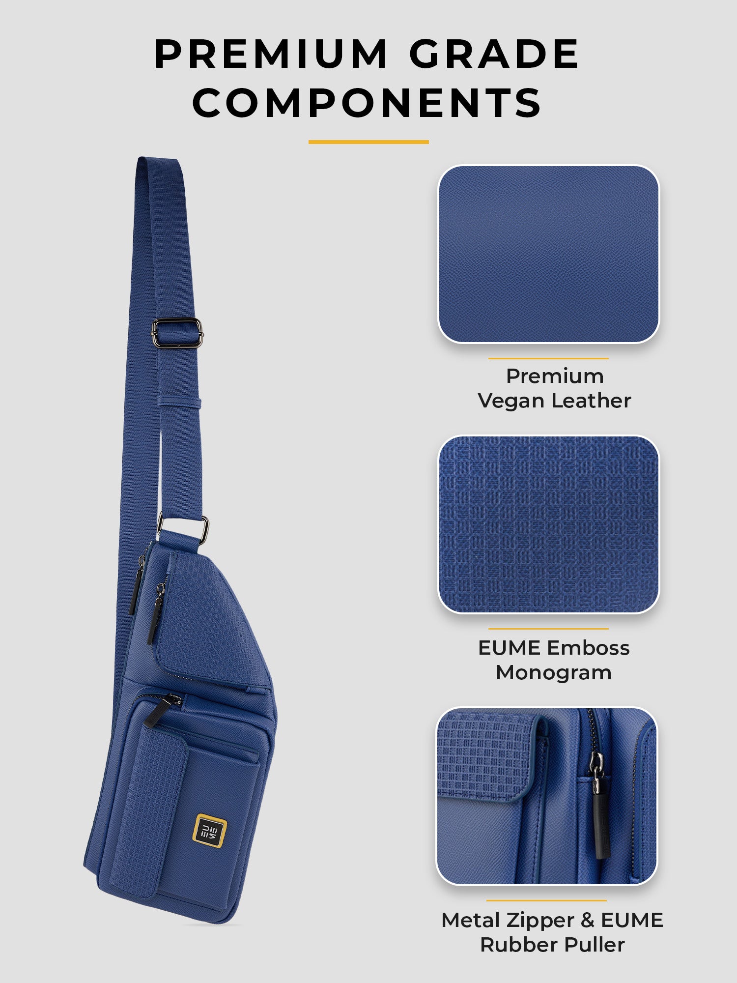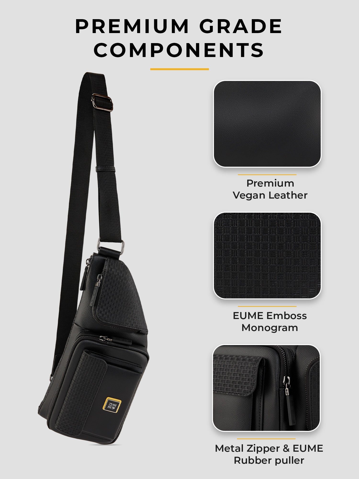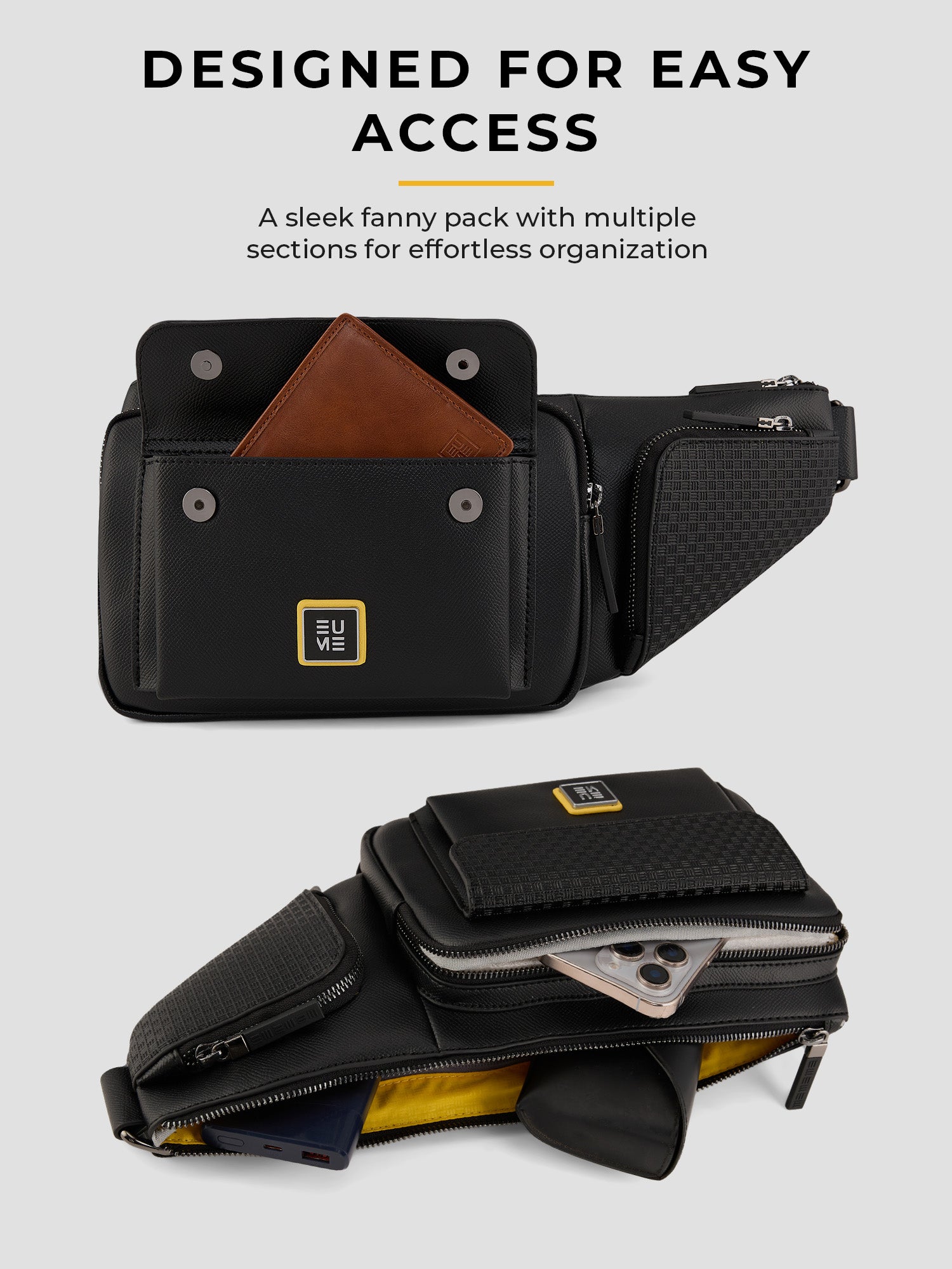 Crafted from premium vegan leather, the Kinetic fanny pack delivers a refined look with durable performance. The exterior is elevated with the signature EUME embossed monogram, paired with metal zippers and branded rubber pullers that add a subtle yet premium finish. Every detail is thoughtfully designed to balance aesthetics with functionality.