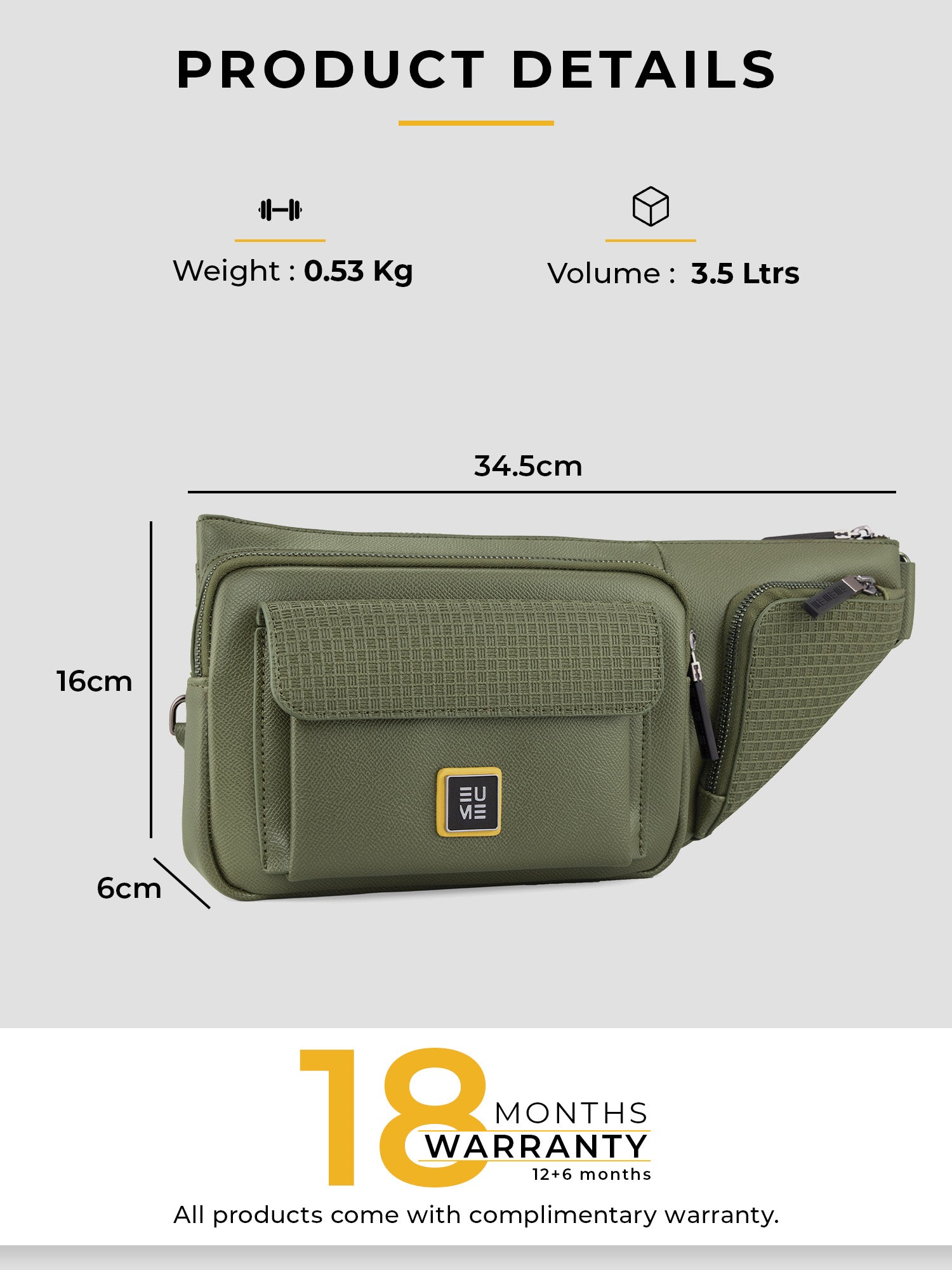 - The Eume Kinetic Fanny Sling Bag is backed by a 18 Months Warranty against all manufacturing defects. This warranty is broken into a complimentary 1-year warranty. To enjoy an extended 6 Months of warranty for free, please register your product within 1 month of purchase.
