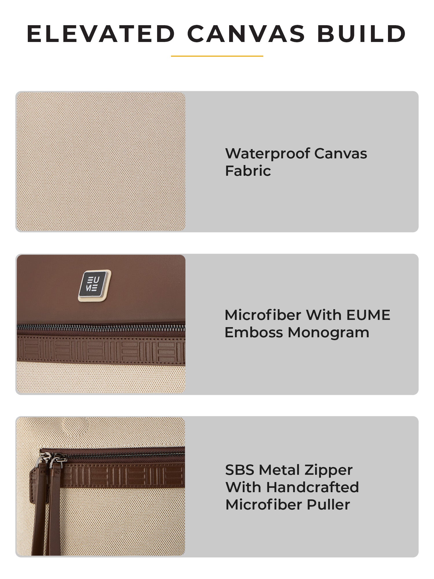 - With a sleek silhouette, lightweight build, and premium hardware, the EUME Canvas Backpack transitions seamlessly from office to travel, meetings to everyday use.