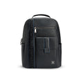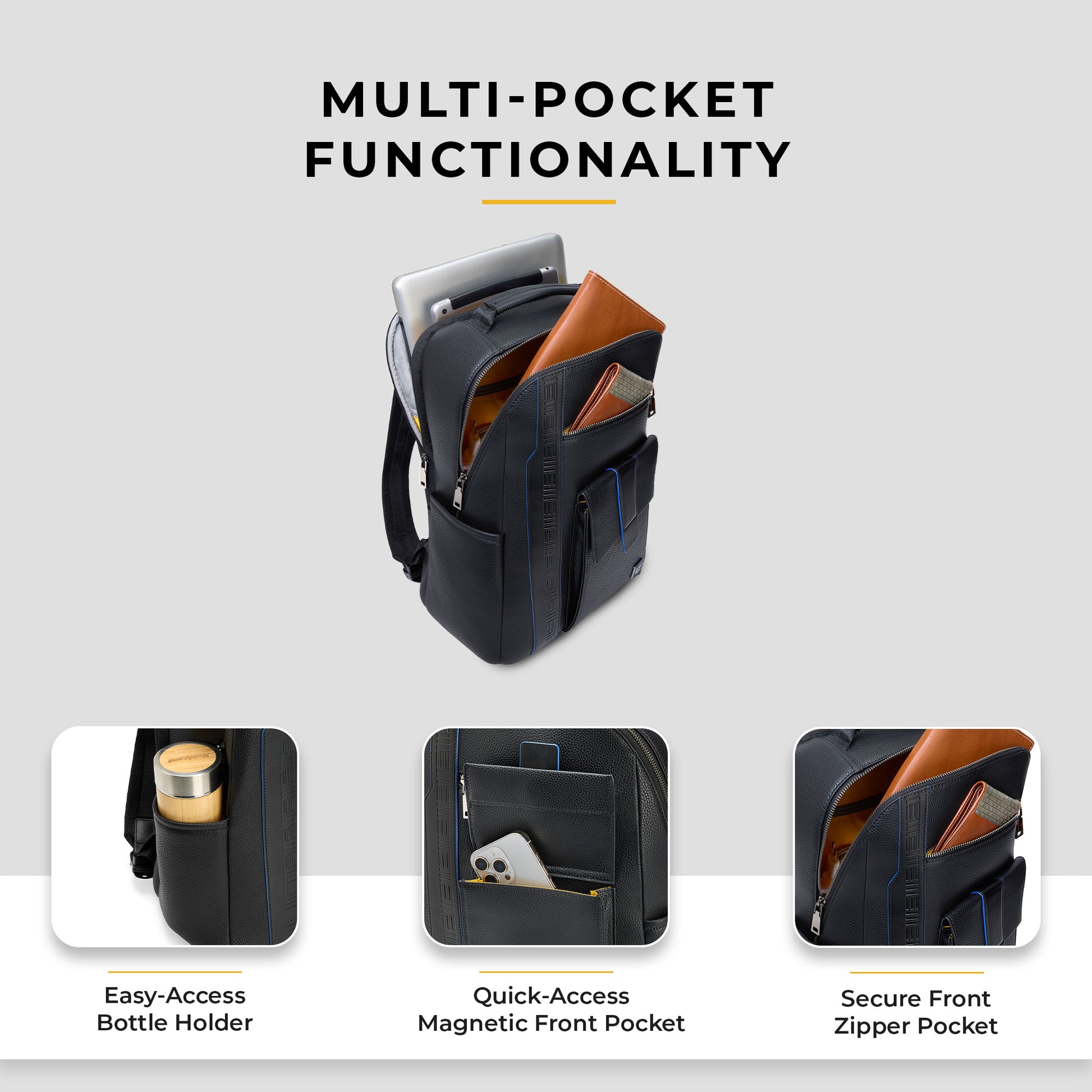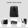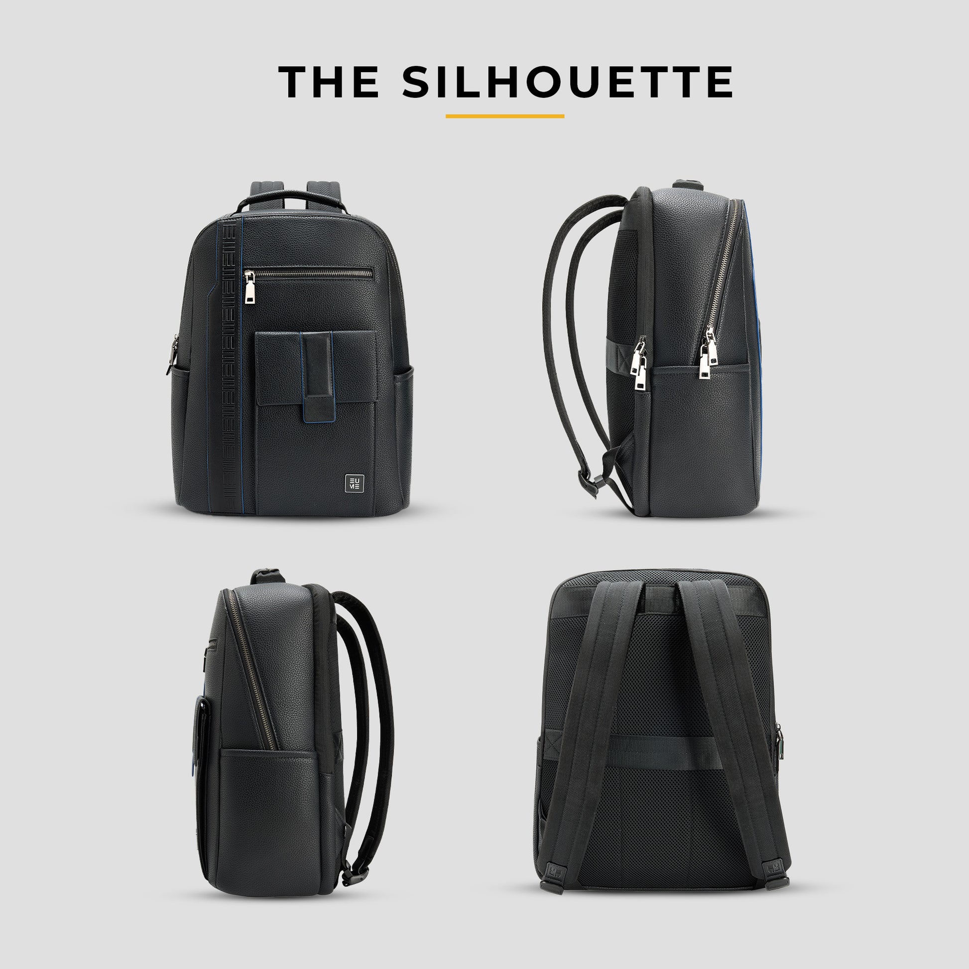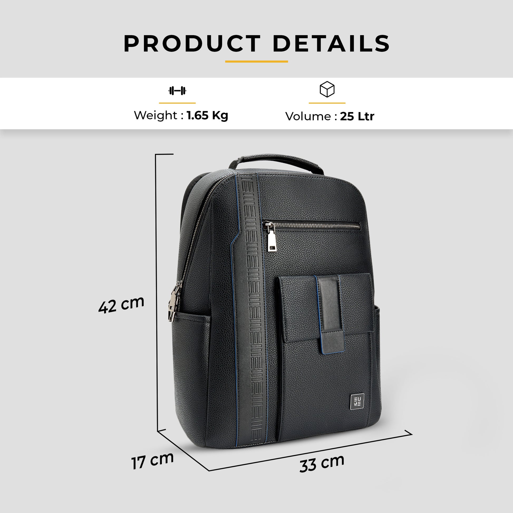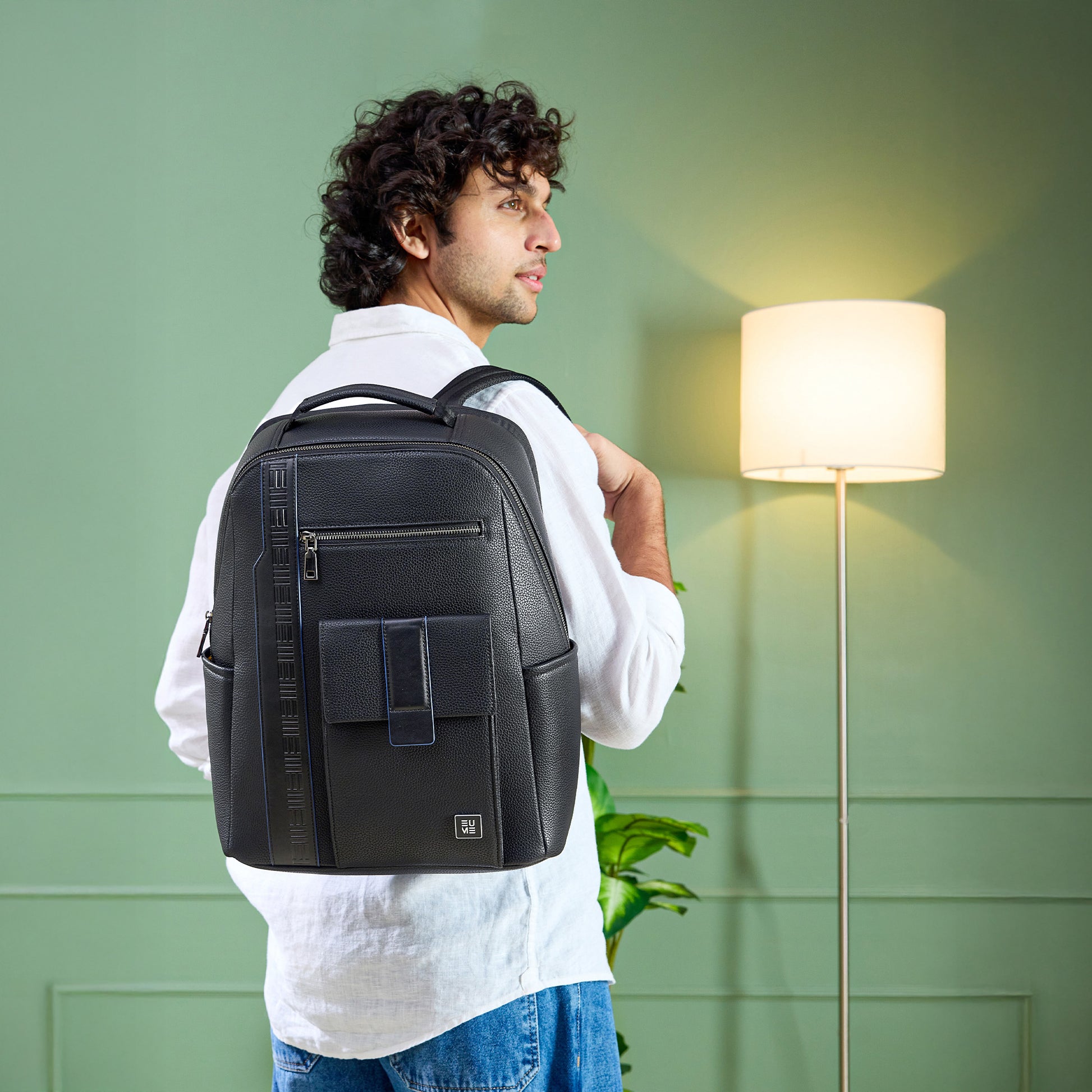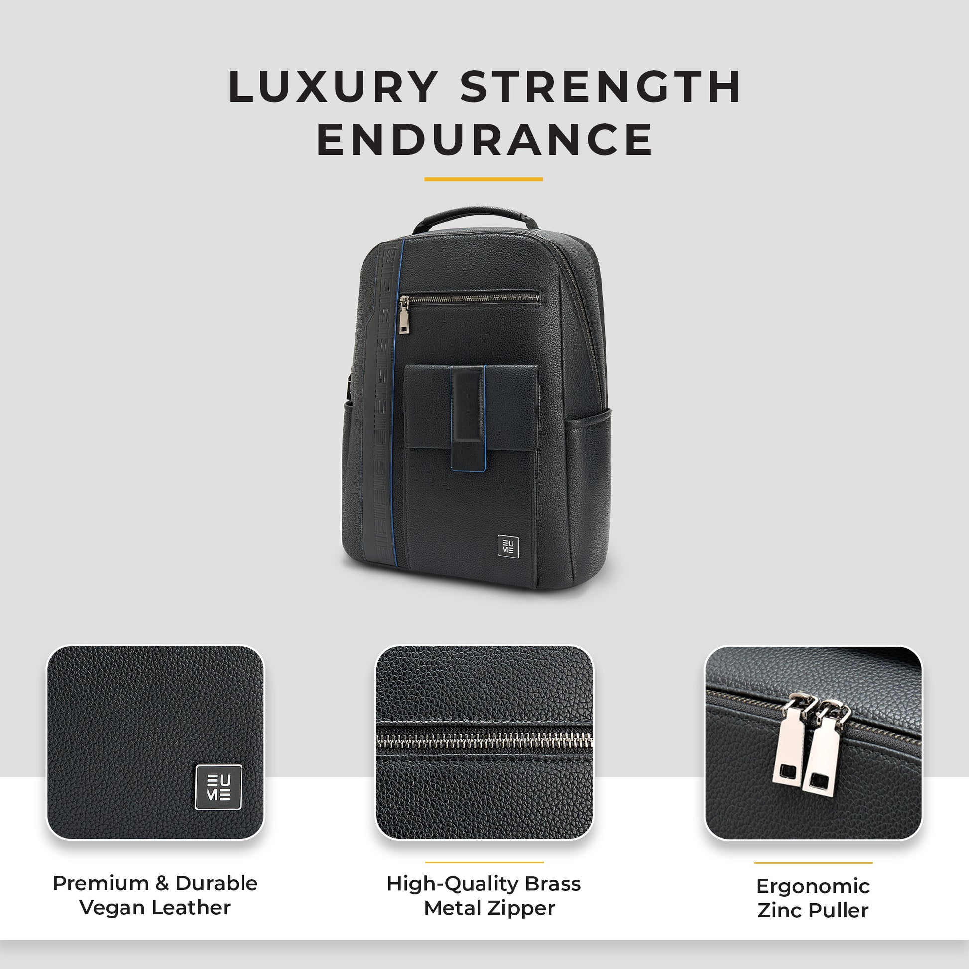 The EUME Nexa Laptop Backpack is a stylish and functional companion designed for the modern professional. Crafted from premium vegan leather, it boasts a polished look and exceptional durability. The front of the bag highlights the brand's meticulous craftsmanship with detailed stitching and a subtle EUME emboss. For convenience, it features two front pockets: a secure zippered pocket for valuables and a magnetic flap pocket for quick access. There's also a handy side pocket, perfect for a water bottle or umbrella.