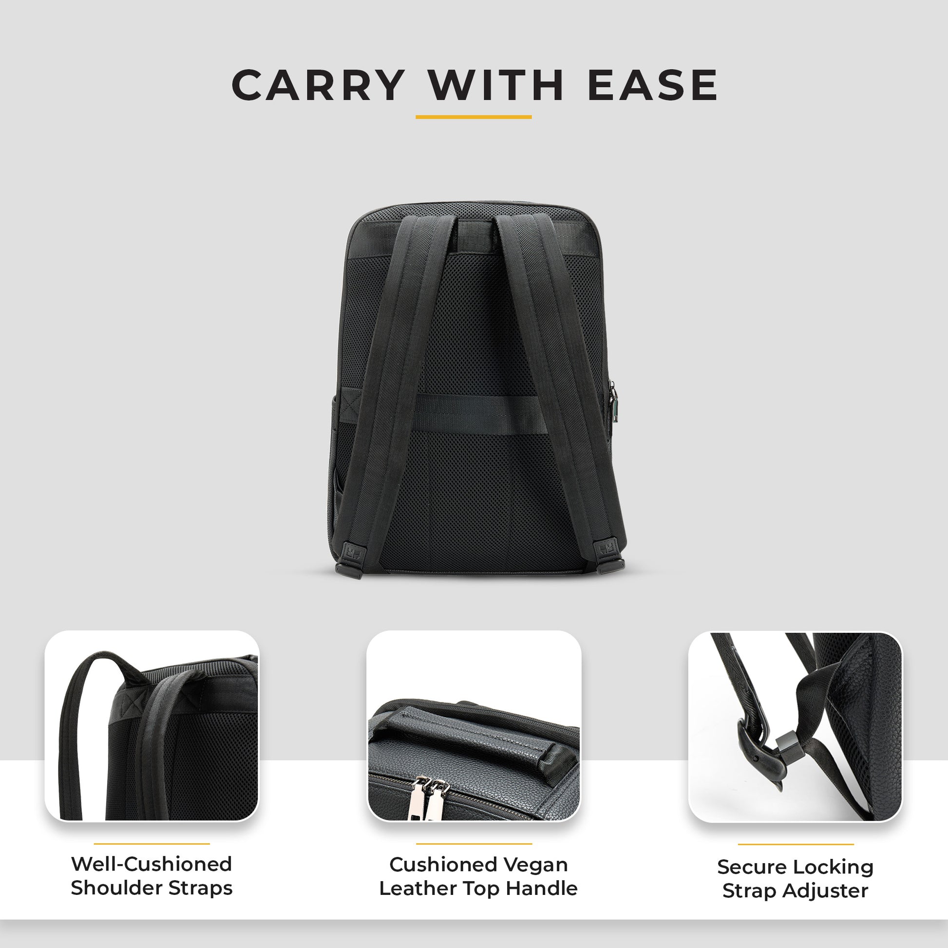 For maximum comfort, the backpack features a soft, breathable mesh back panel and well-cushioned, adjustable shoulder straps, making it easy to wear all day. A convenient trolley strap on the back allows you to slide the backpack onto your luggage handle, making it a perfect companion for business trips and travel.