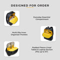 The backpack's interior is lined with EUME’s distinctive yellow waterproof fabric, ensuring your belongings stay protected. The main compartment offers ample space for files and daily essentials and is equipped with three slip pockets, a secure zipper pocket for valuables, and an elastic loop for holding circular items like containers or umbrellas. The second compartment is specifically designed for your electronics, featuring a soft, padded fleece lining to securely hold a laptop up to 15.6 inches along with a tablet.