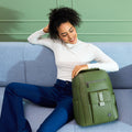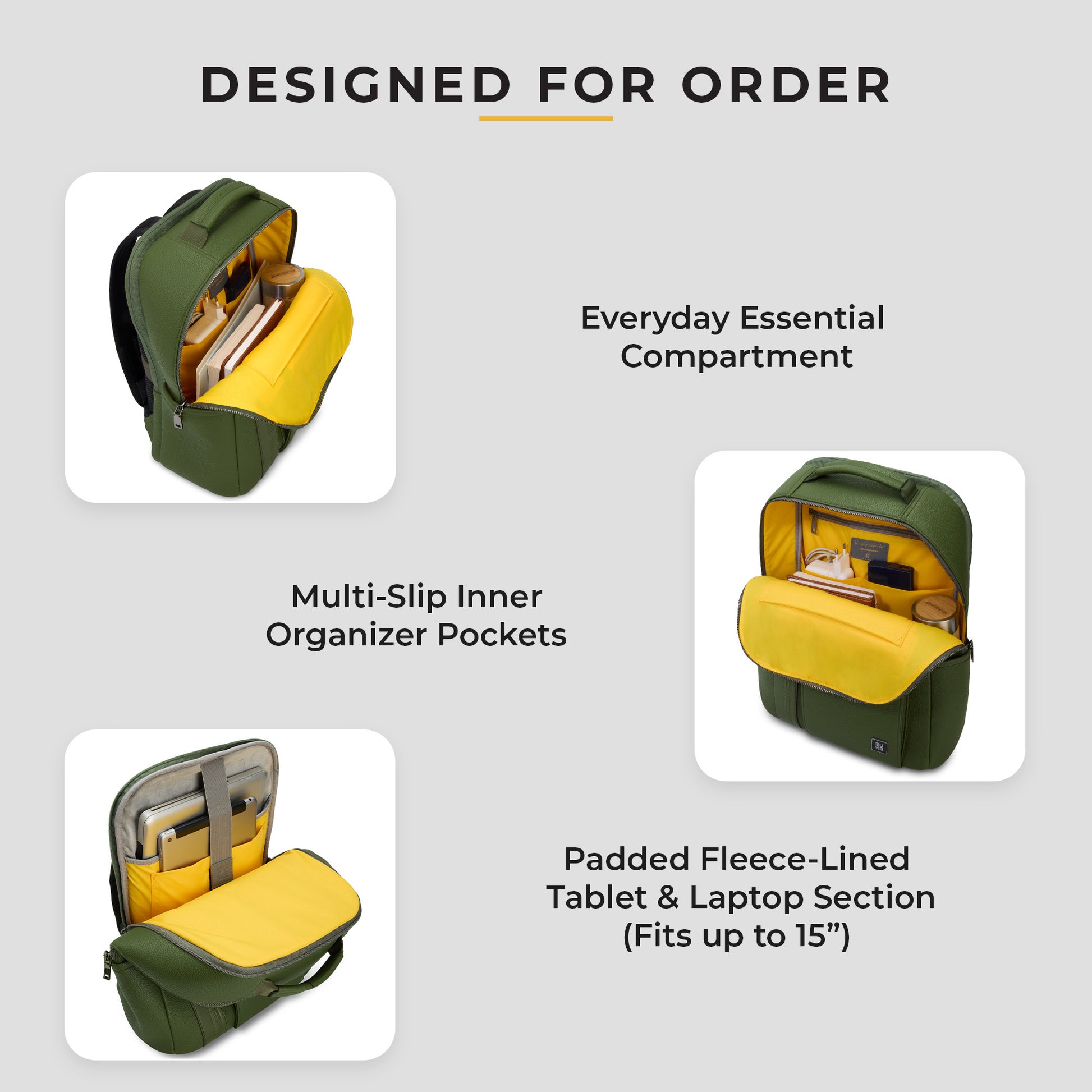 The backpack's interior is lined with EUME’s distinctive yellow waterproof fabric, ensuring your belongings stay protected. The main compartment offers ample space for files and daily essentials and is equipped with three slip pockets, a secure zipper pocket for valuables, and an elastic loop for holding circular items like containers or umbrellas. The second compartment is specifically designed for your electronics, featuring a soft, padded fleece lining to securely hold a laptop up to 15.6 inches along with a tablet.
