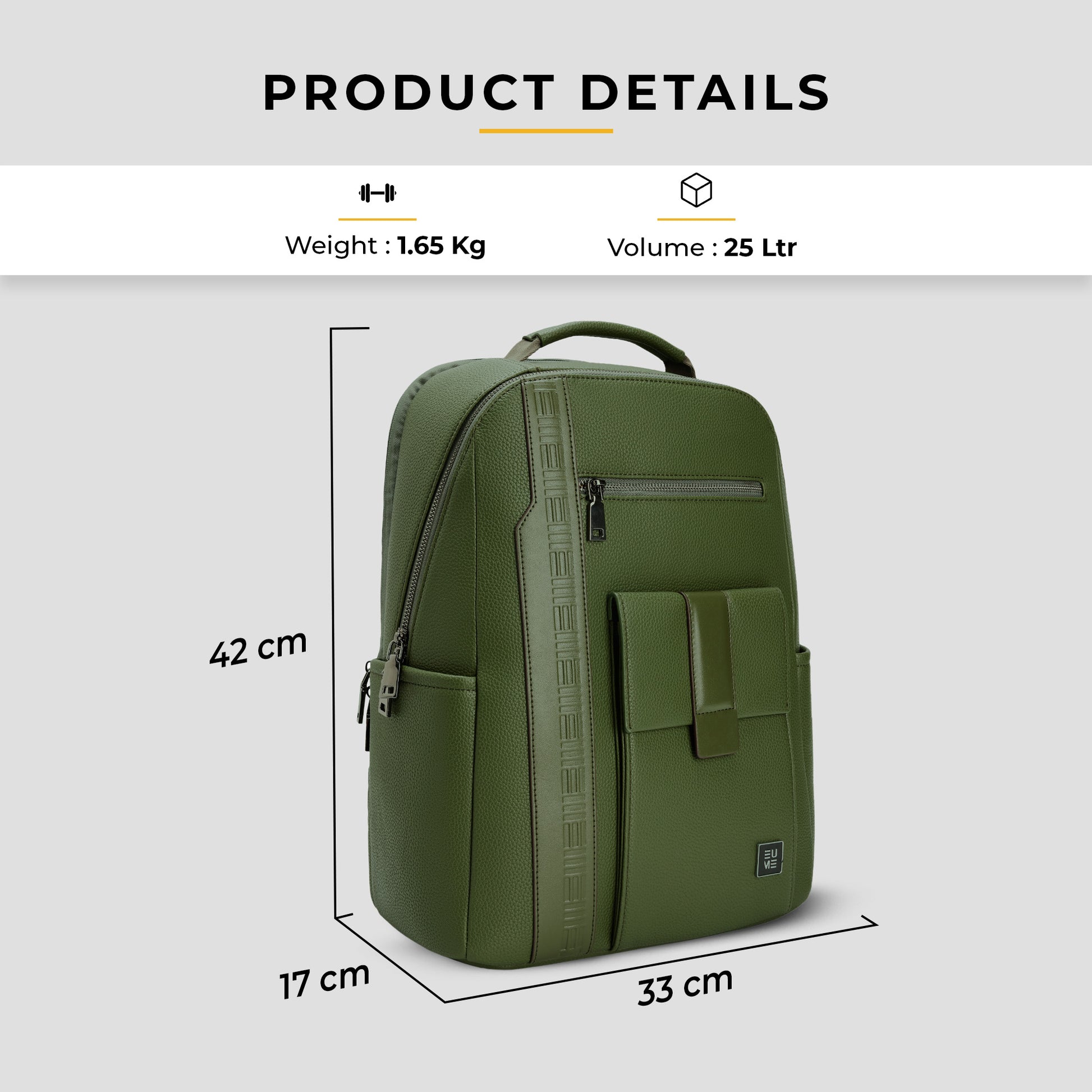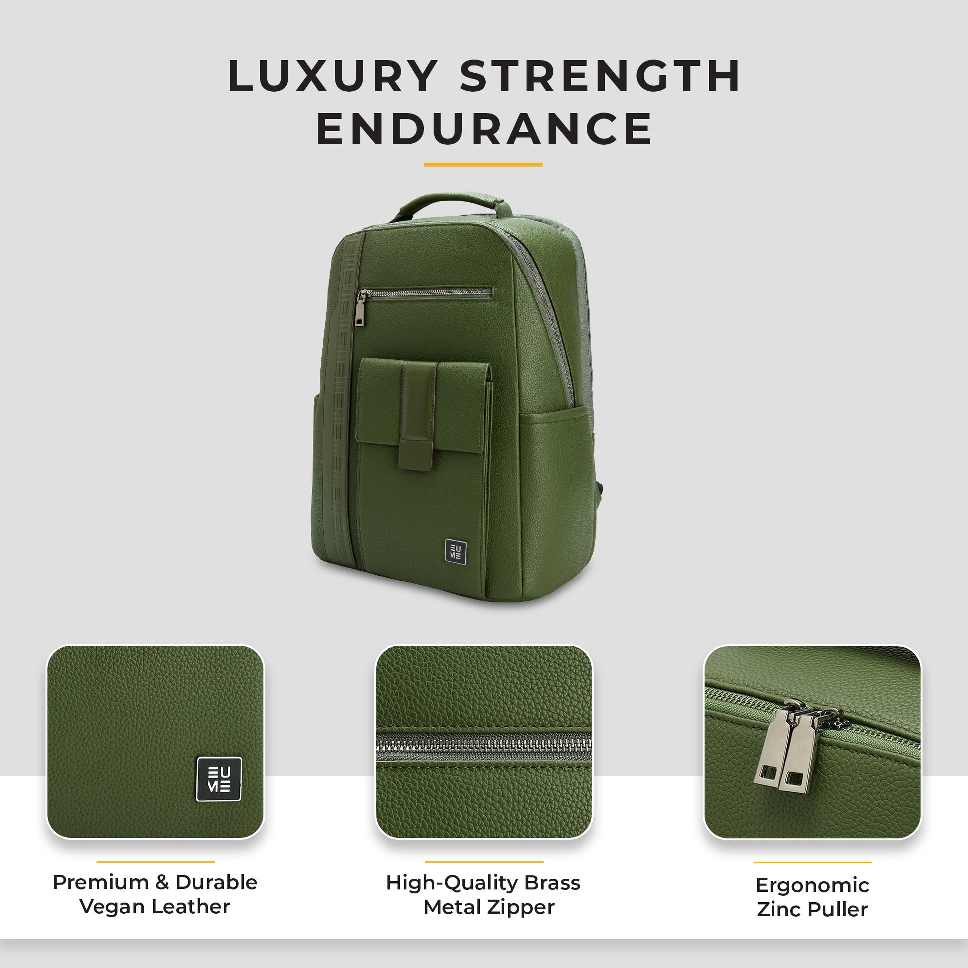 The EUME Nexa Laptop Backpack is a stylish and functional companion designed for the modern professional. Crafted from premium vegan leather, it boasts a polished look and exceptional durability. The front of the bag highlights the brand's meticulous craftsmanship with detailed stitching and a subtle EUME emboss. For convenience, it features two front pockets: a secure zippered pocket for valuables and a magnetic flap pocket for quick access. There's also a handy side pocket, perfect for a water bottle or umbrella.
