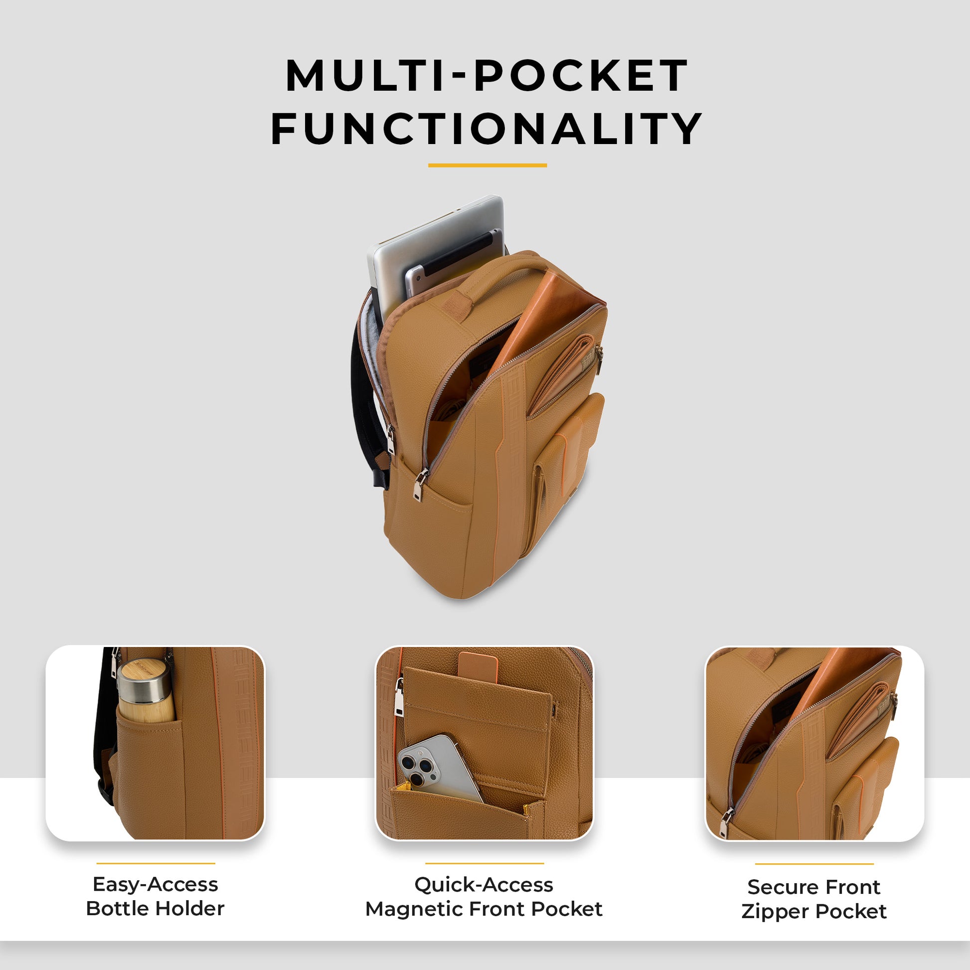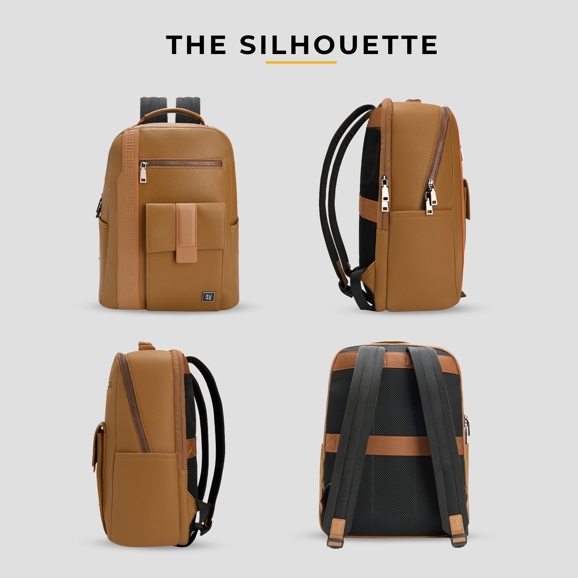 The EUME Nexa Laptop Backpack is a stylish and functional companion designed for the modern professional. Crafted from premium vegan leather, it boasts a polished look and exceptional durability. The front of the bag highlights the brand's meticulous craftsmanship with detailed stitching and a subtle EUME emboss. For convenience, it features two front pockets: a secure zippered pocket for valuables and a magnetic flap pocket for quick access. There's also a handy side pocket, perfect for a water bottle or umbrella.