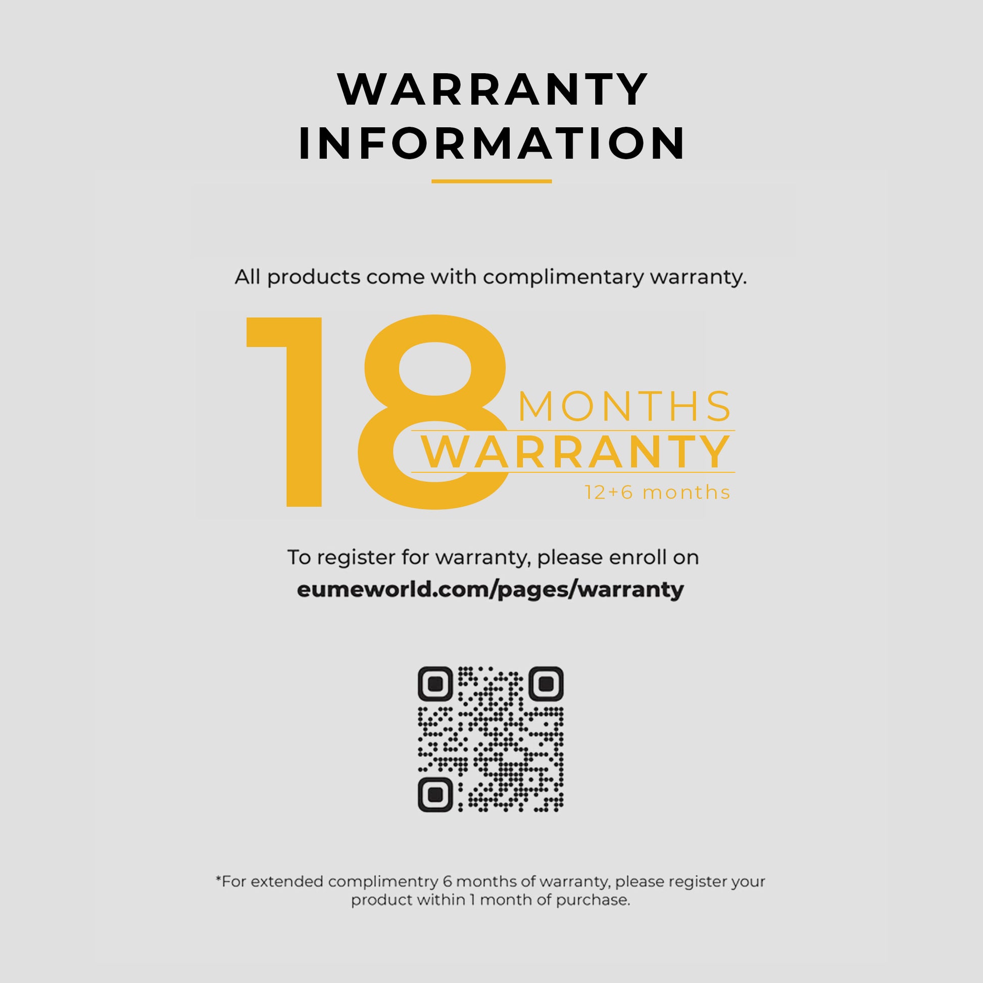 All other products: Including backpacks, handbags, and accessories, come with a 1.5-year extended warranty, with the first year complimentary and an additional 6 months upon registration on our warranty page via https://eumeworld.com/pages/warranty.