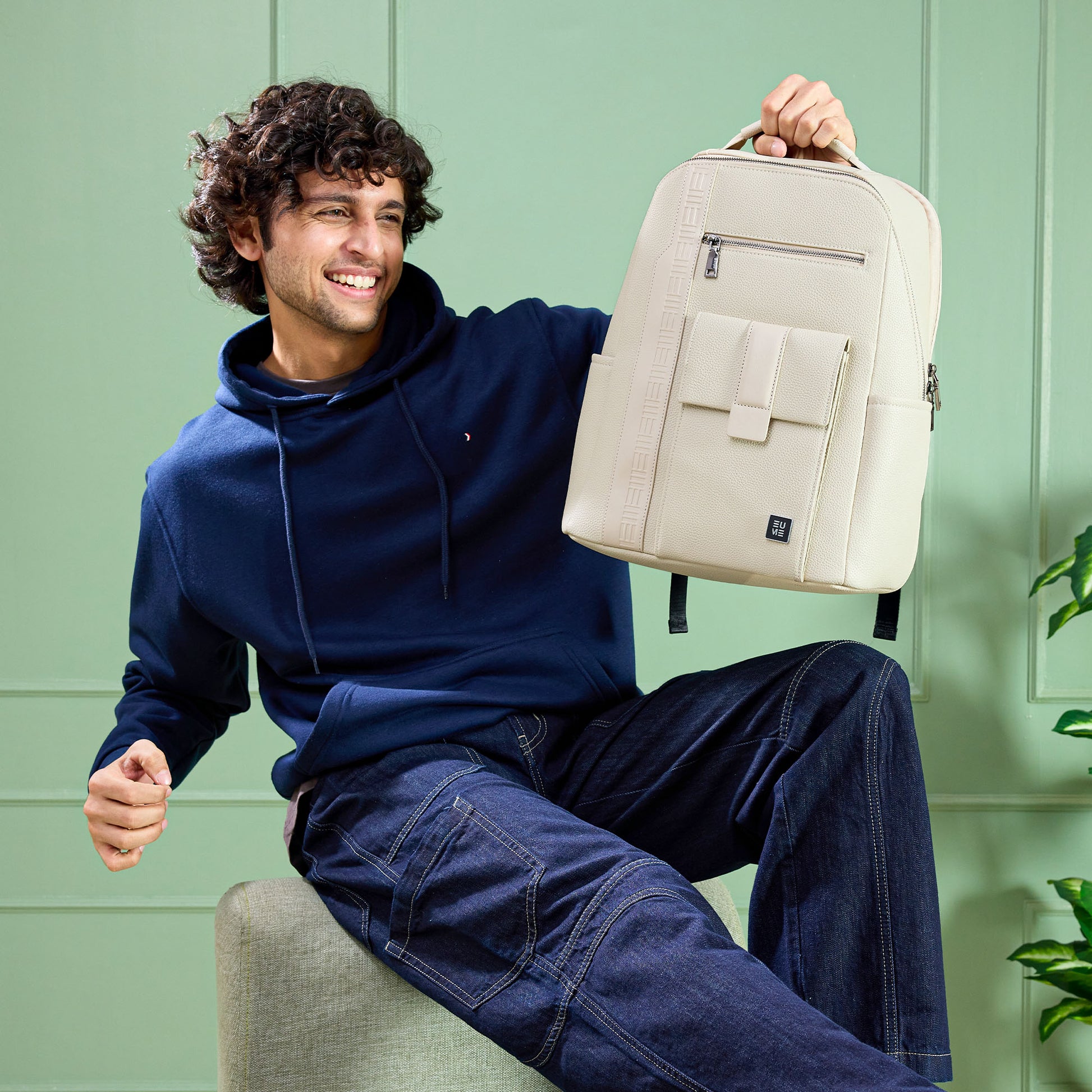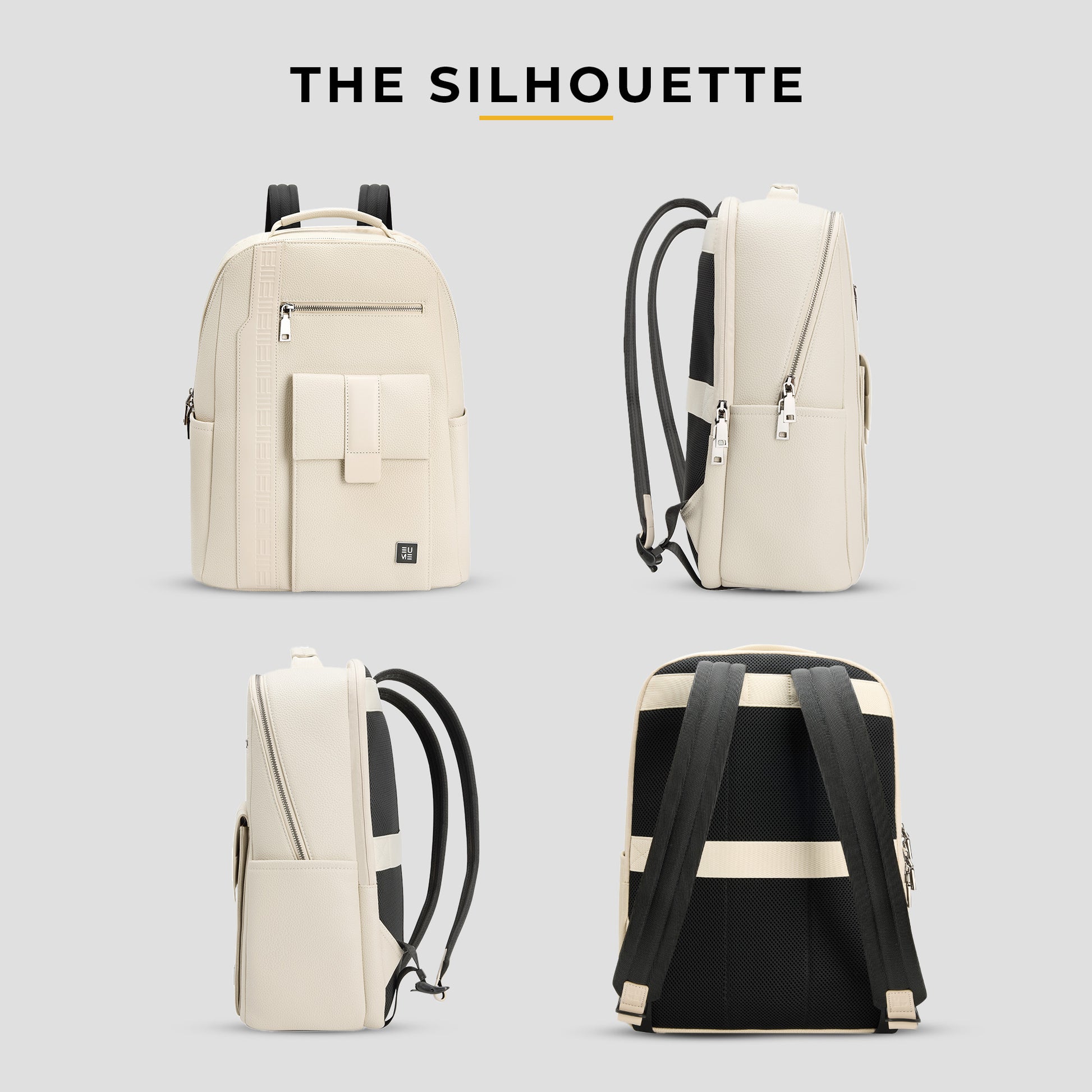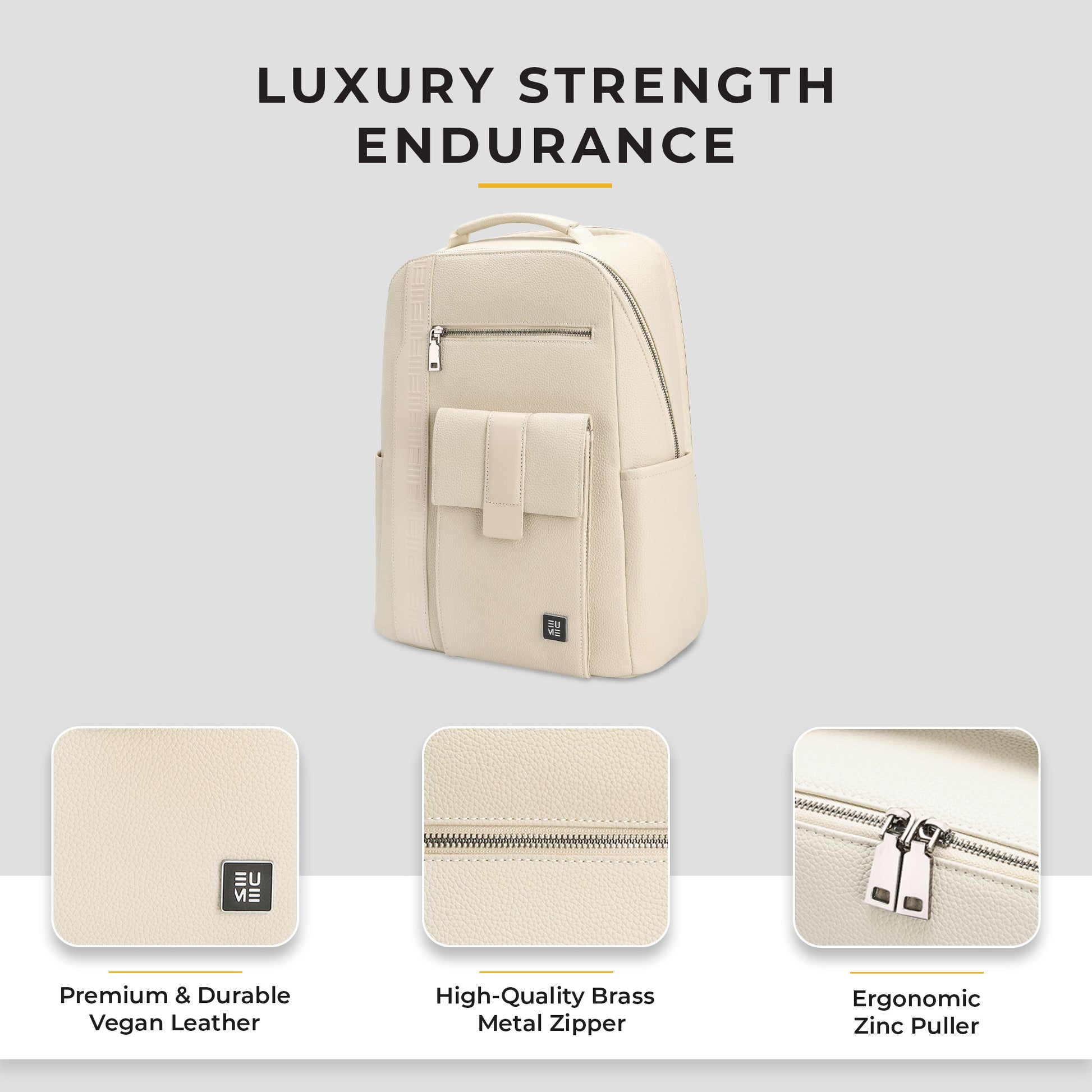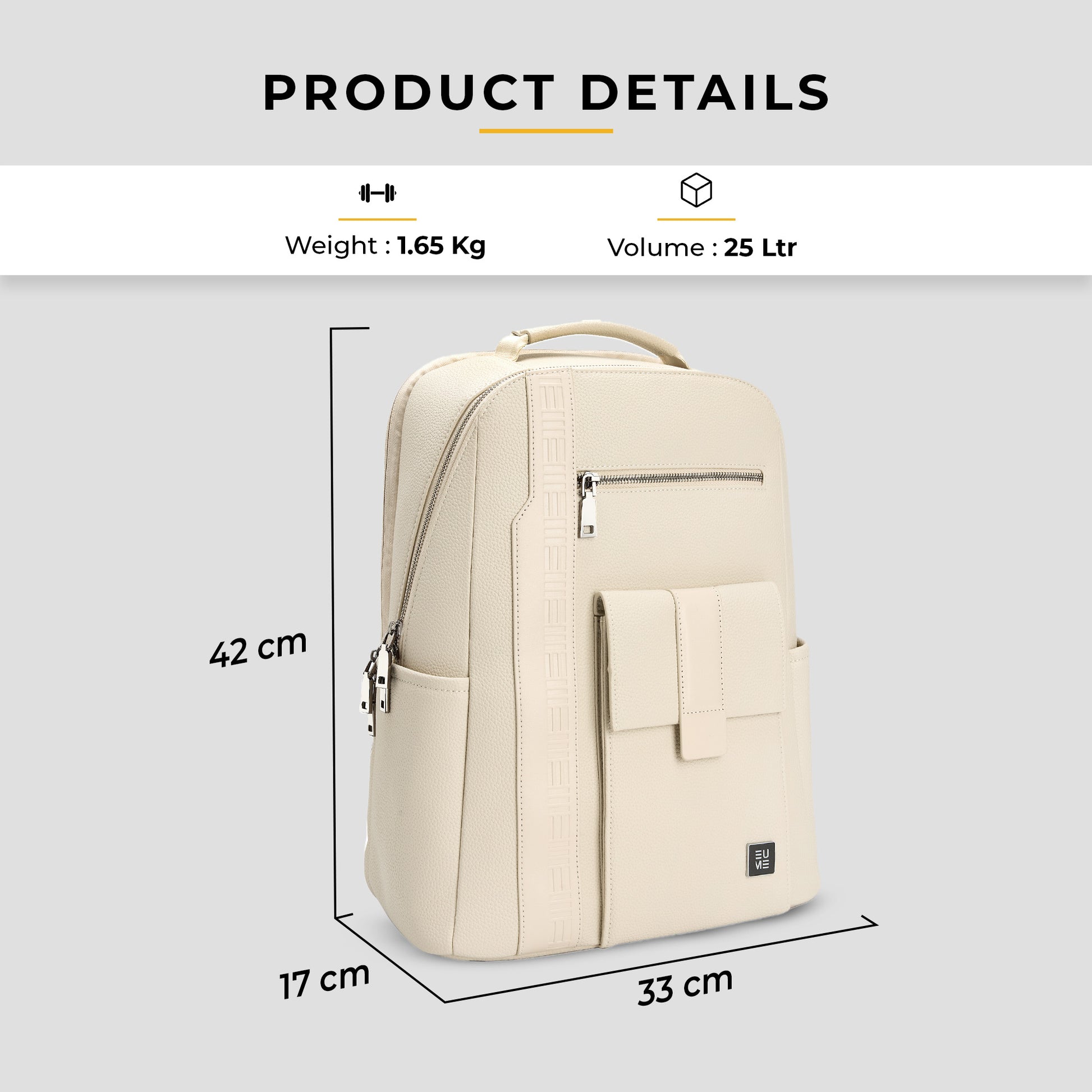 The EUME Nexa Laptop Backpack is a stylish and functional companion designed for the modern professional. Crafted from premium vegan leather, it boasts a polished look and exceptional durability. The front of the bag highlights the brand's meticulous craftsmanship with detailed stitching and a subtle EUME emboss. For convenience, it features two front pockets: a secure zippered pocket for valuables and a magnetic flap pocket for quick access. There's also a handy side pocket, perfect for a water bottle or umbrella.
