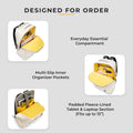 The backpack's interior is lined with EUME’s distinctive yellow waterproof fabric, ensuring your belongings stay protected. The main compartment offers ample space for files and daily essentials and is equipped with three slip pockets, a secure zipper pocket for valuables, and an elastic loop for holding circular items like containers or umbrellas. The second compartment is specifically designed for your electronics, featuring a soft, padded fleece lining to securely hold a laptop up to 15.6 inches along with a tablet.