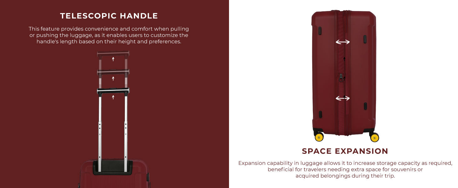 - Designed to meet diverse packing needs, the luggage can expand by up to 5cm, effortlessly accommodating extra items. Its functionality is highlighted by a telescopic trolley handle with a three-stage opening and closure mechanism, along with retractable hand carry handles on each side. These handles can support weights of up to 10 kgs for cabin-sized 20 inch luggage, ensuring ease of transport.