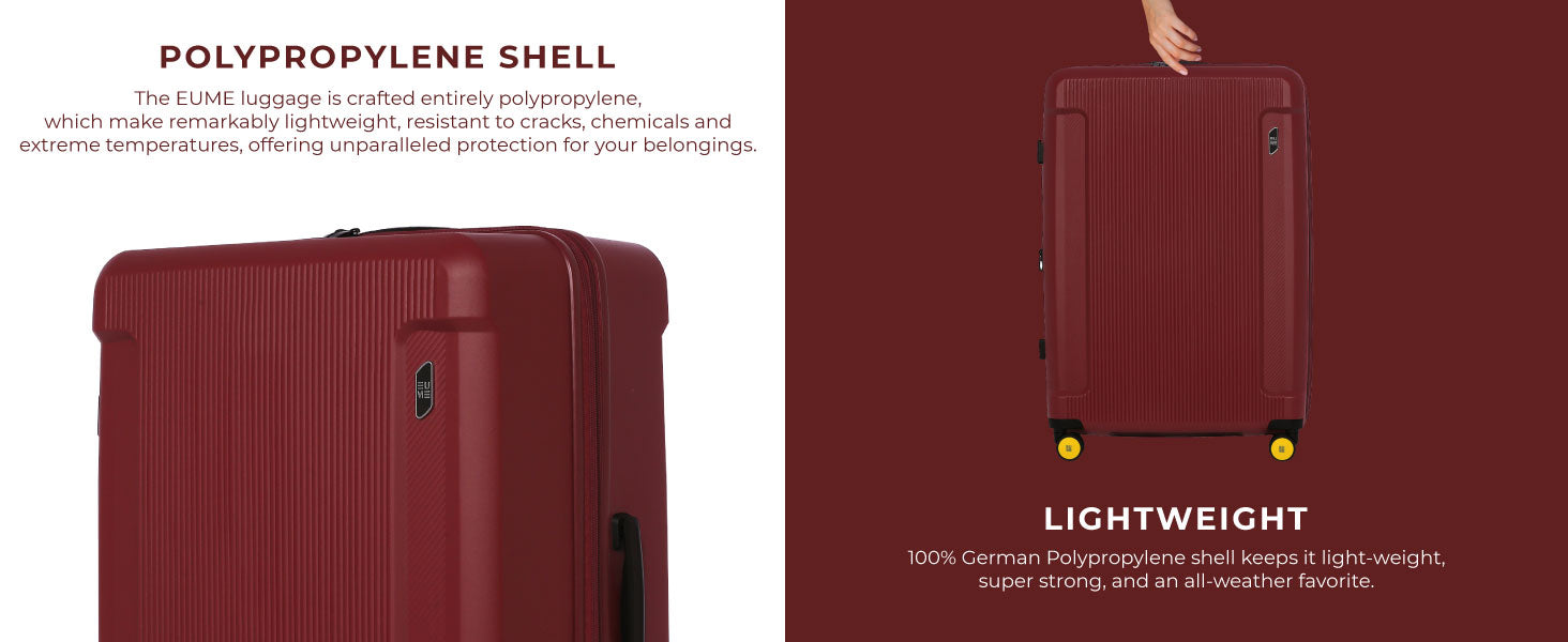 - The Eume Nomad luggage is crafted entirely from polypropylene, ensuring unmatched durability and resilience. This material is not only remarkably lightweight but also resistant to cracks, chemicals, and extreme temperatures, offering unparalleled protection for your belongings.
