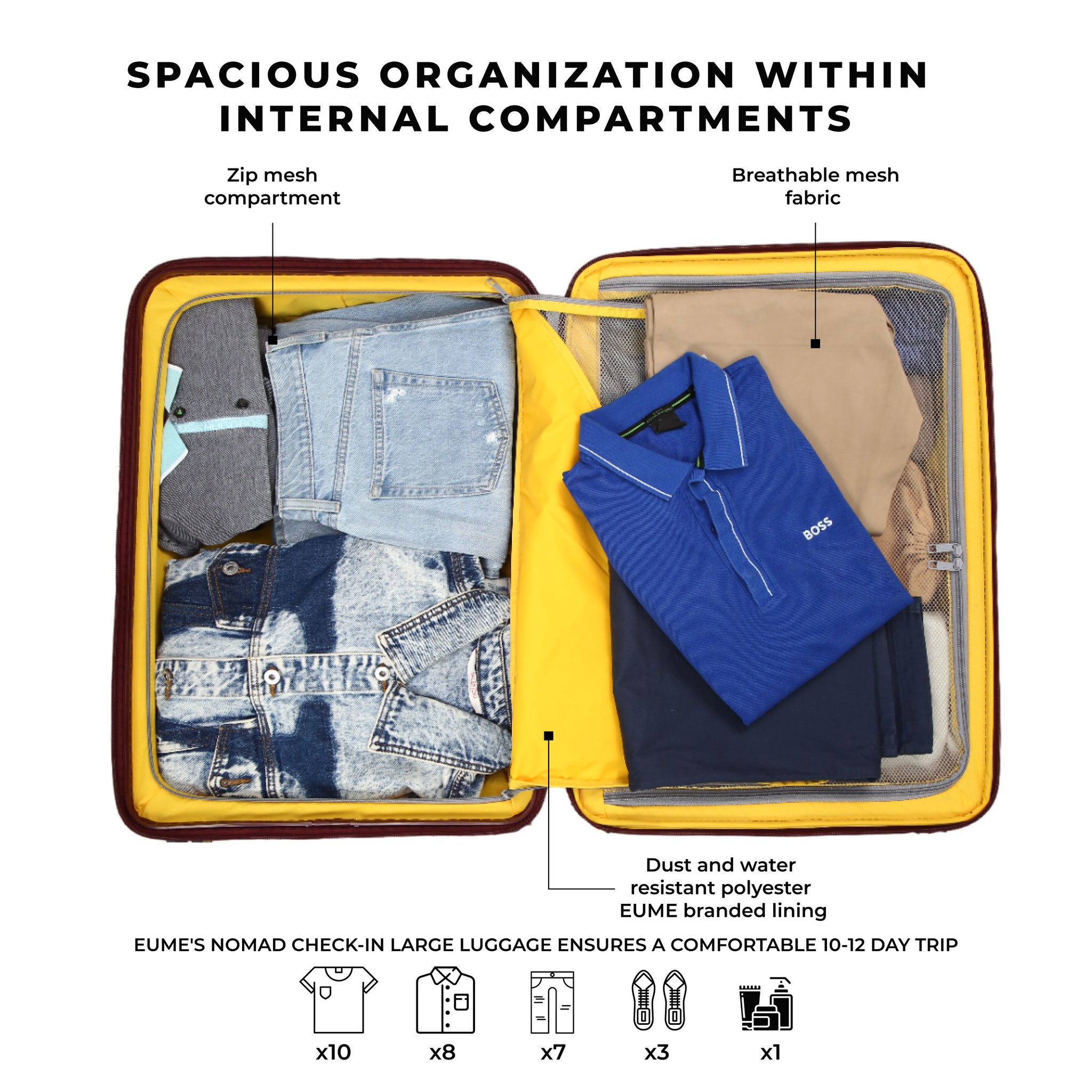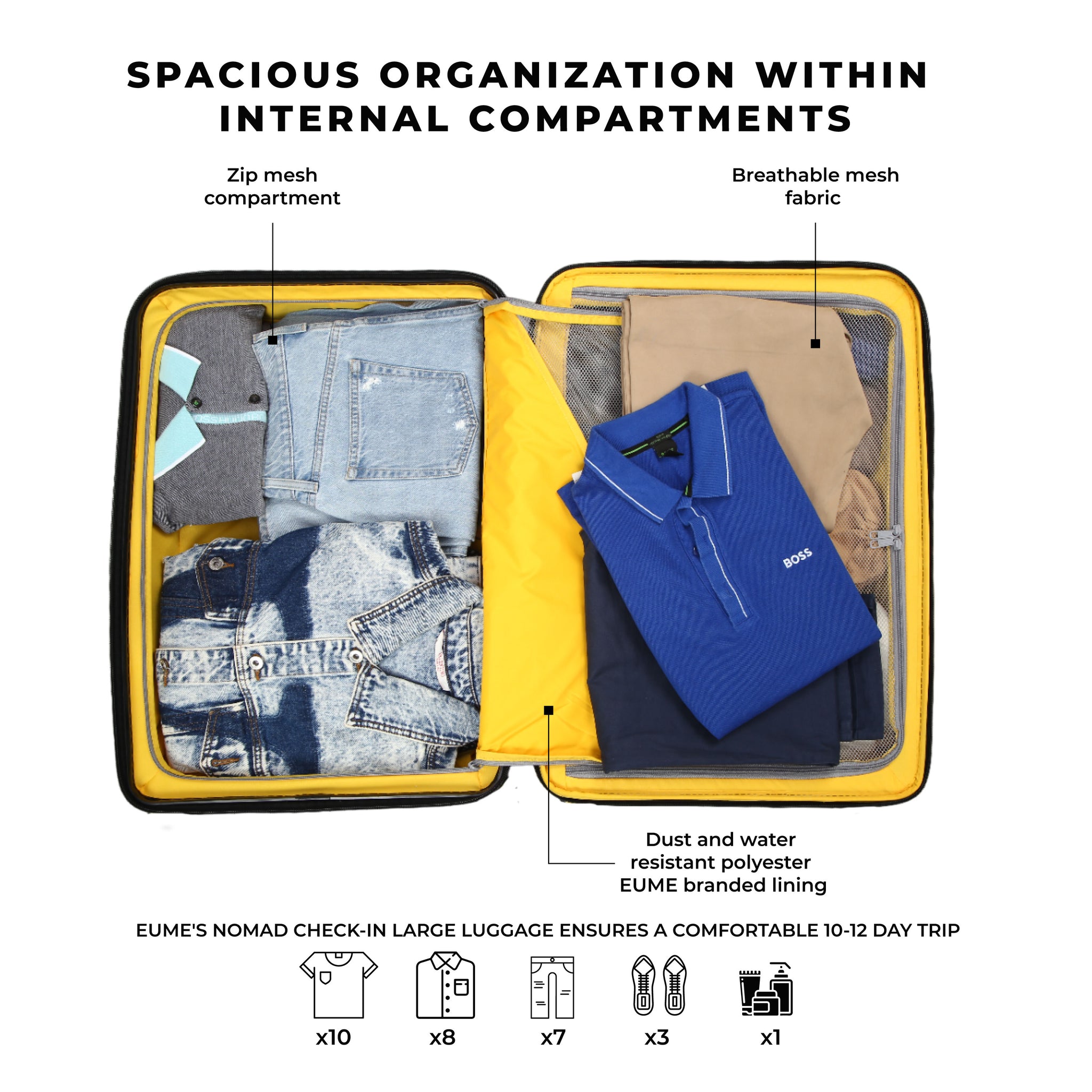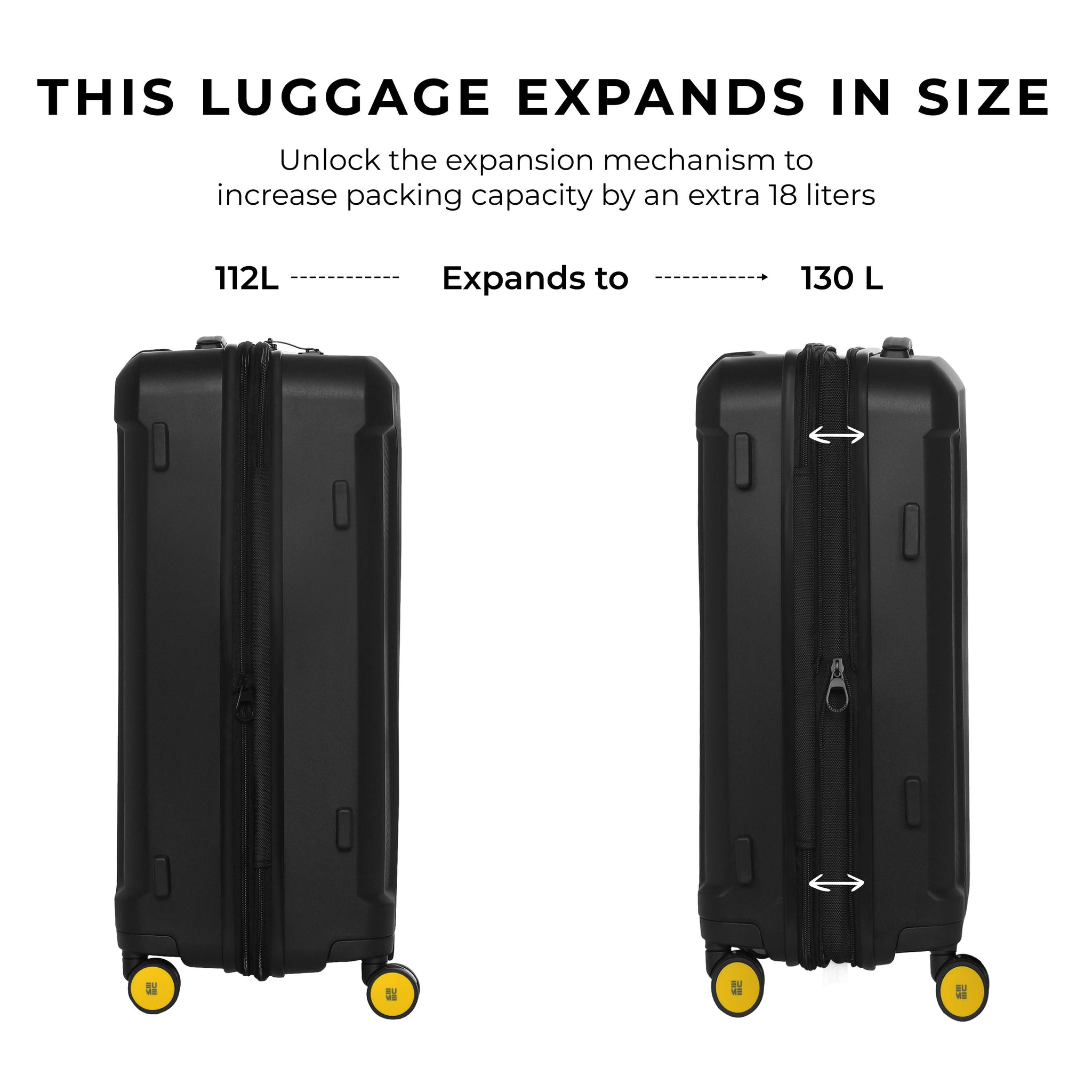 - The Eume Nomad luggage is crafted entirely from polypropylene, ensuring unmatched durability and resilience. This material is not only remarkably lightweight but also resistant to cracks, chemicals, and extreme temperatures, offering unparalleled protection for your belongings.