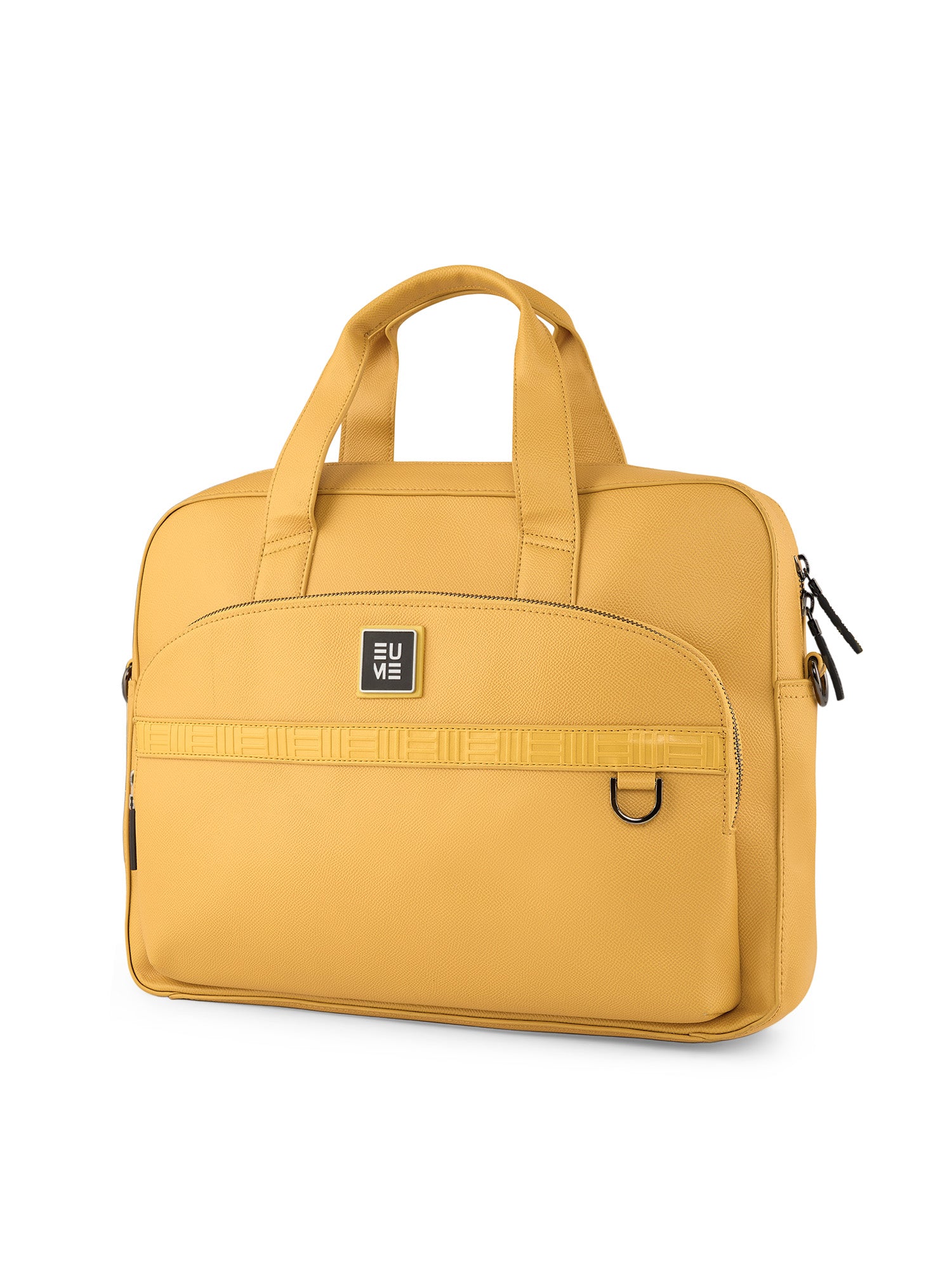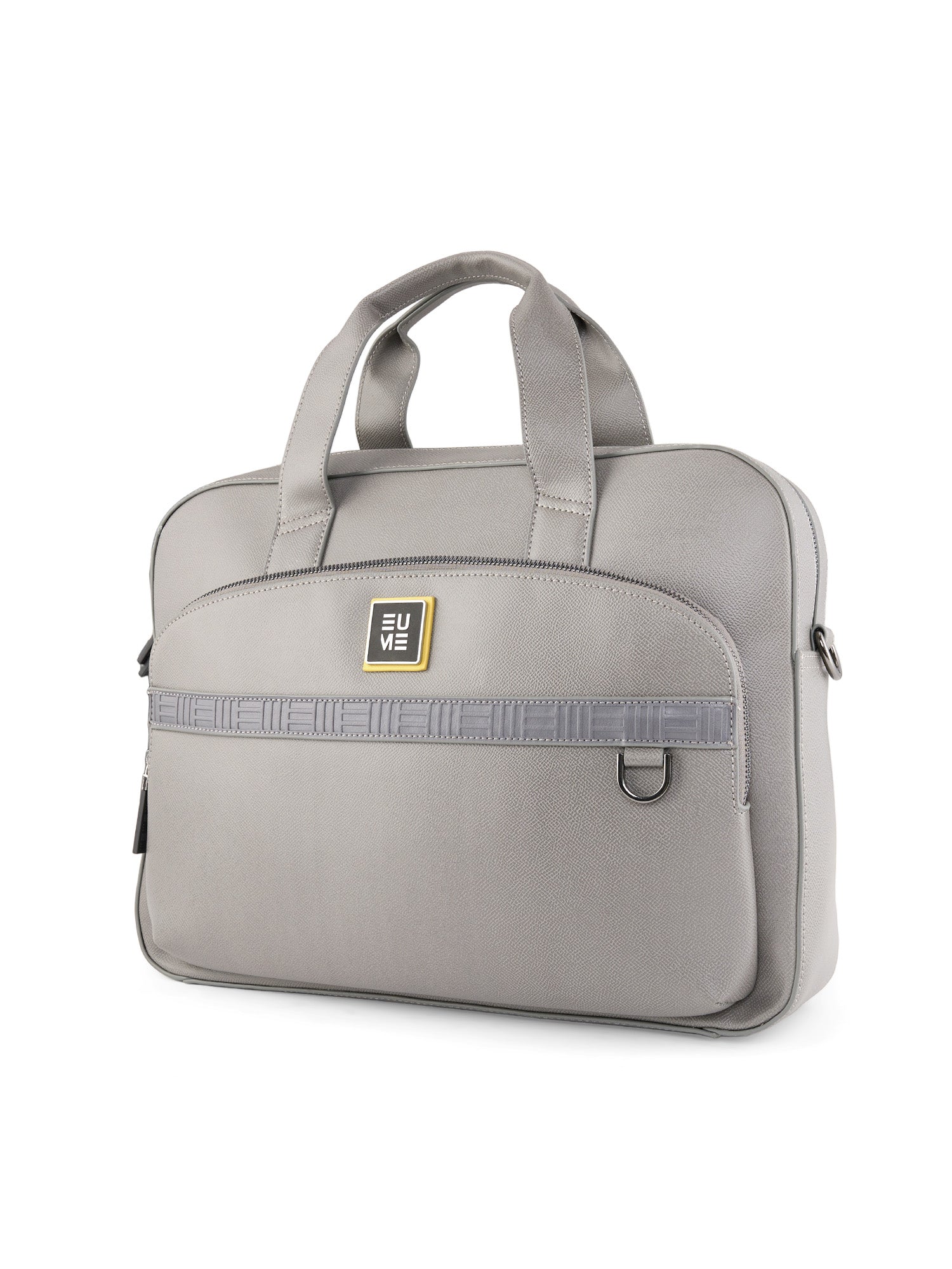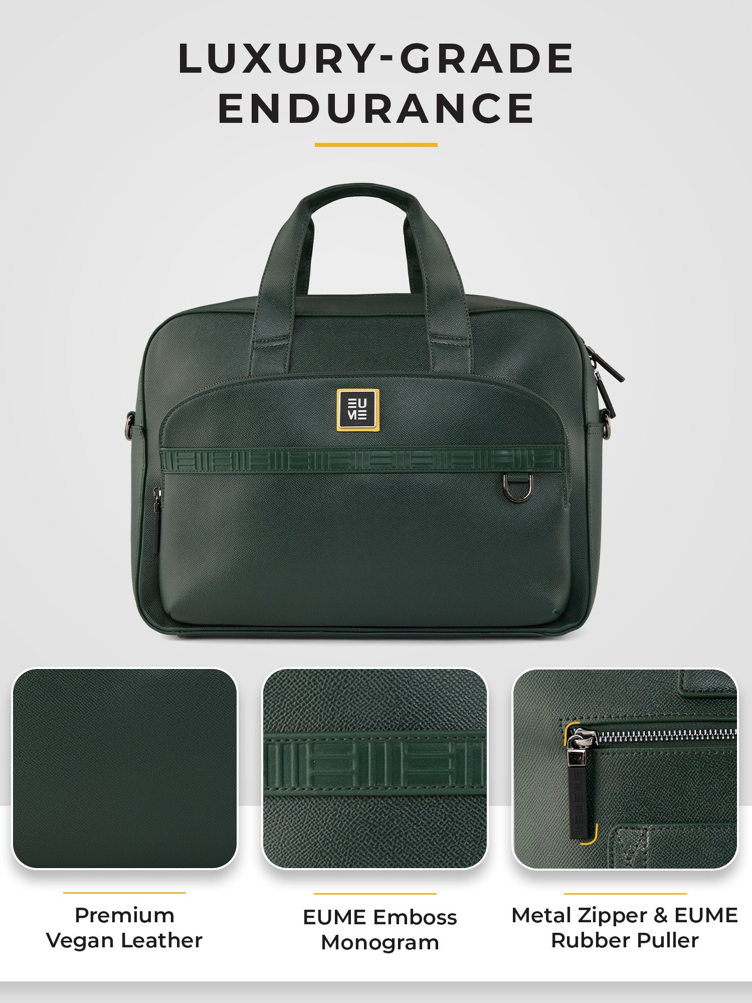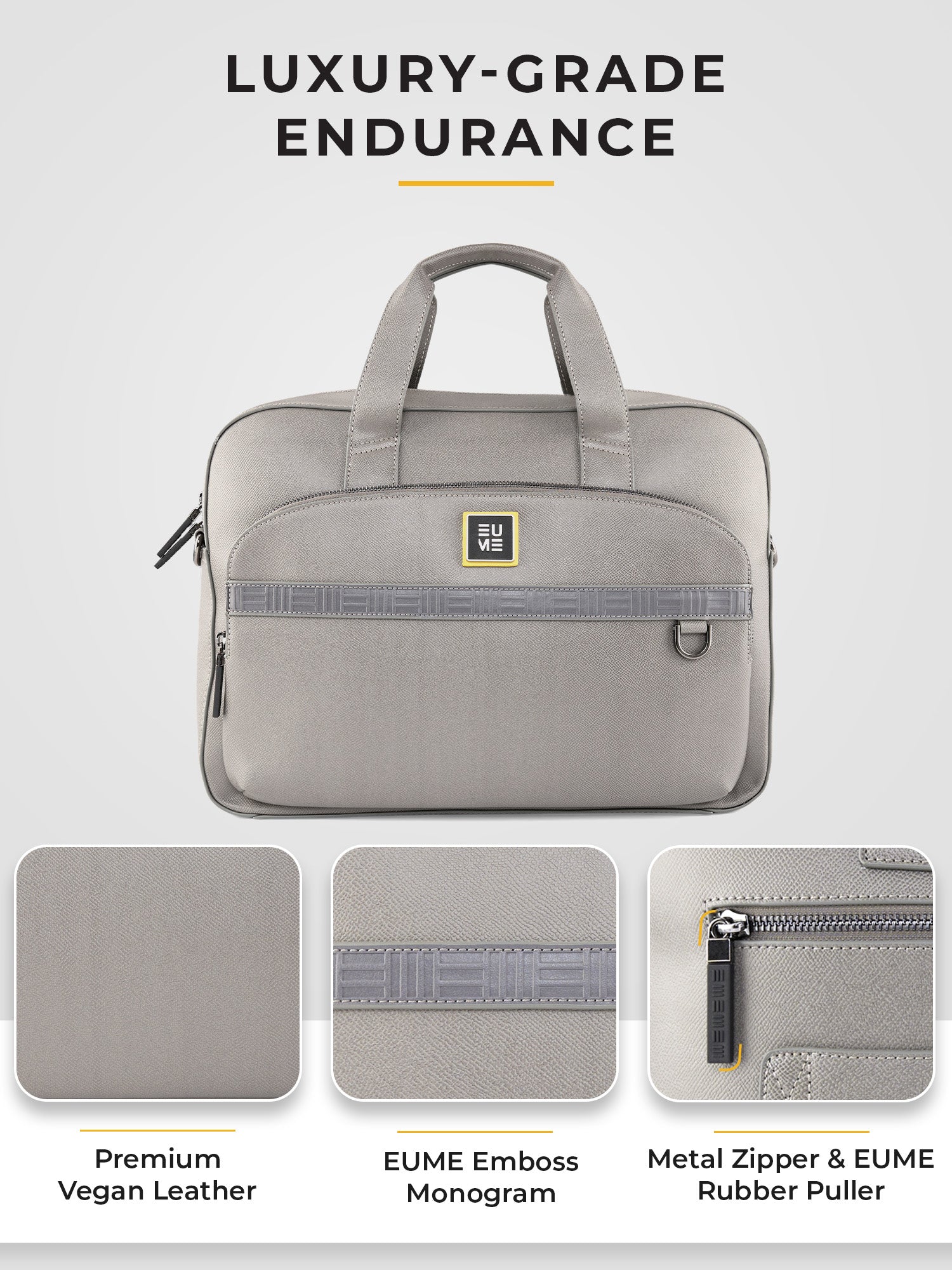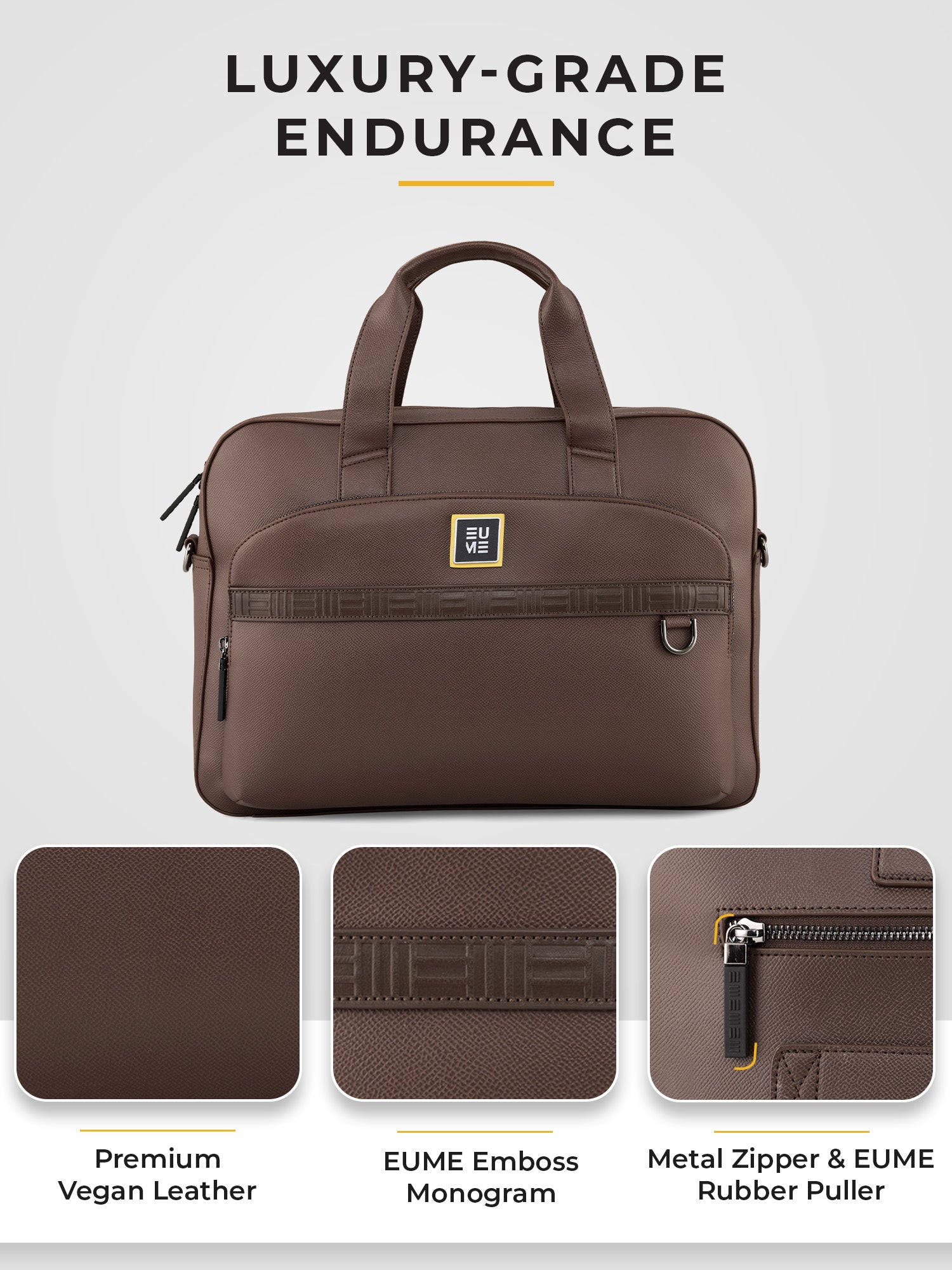 Made from premium vegan leather, the bag offers luxury-grade endurance with a consciously cruelty-free approach. The exterior is elevated with the signature EUME embossed monogram, complemented by precision metal zippers and branded rubber pullers that add a polished, contemporary finish.