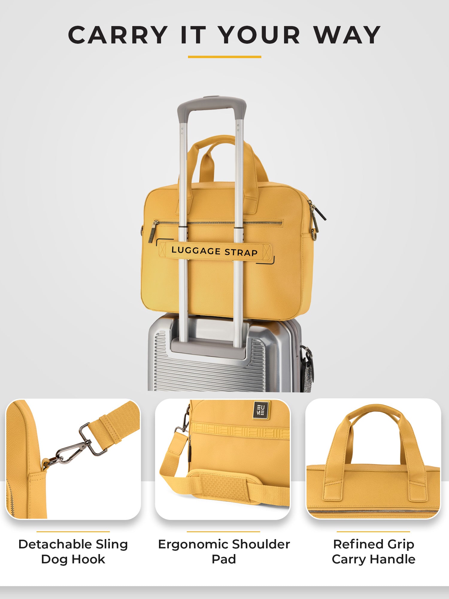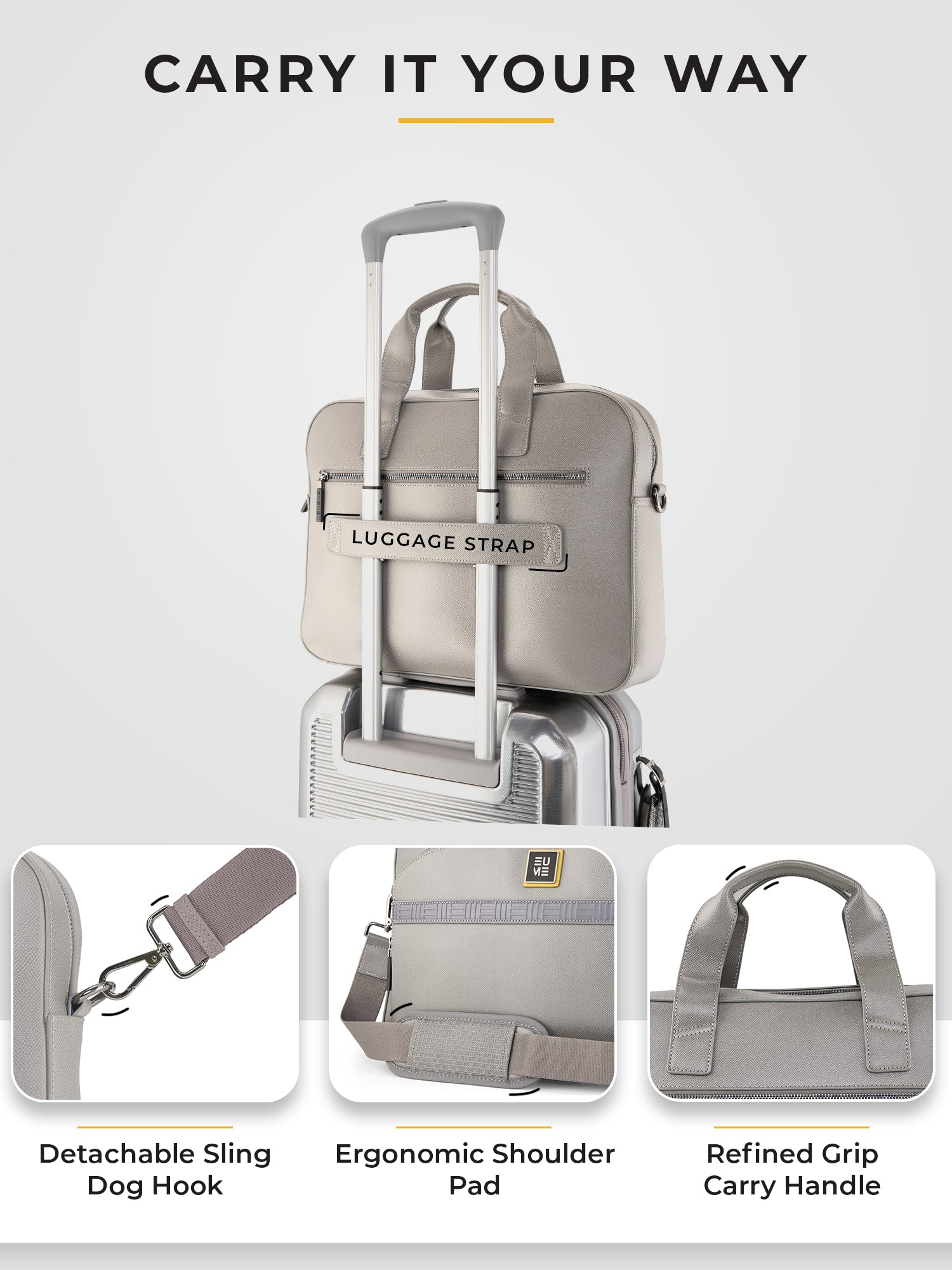 Versatility lies at the heart of Optimo’s design. Carry it comfortably by the refined grip handles, wear it crossbody with the detachable sling strap, or enjoy all-day comfort with the ergonomic shoulder pad. For travel days, the rear luggage strap allows the bag to slide effortlessly over your suitcase handle, making movement smooth and stress-free. Front and back zippered easy-access pockets provide quick storage for items you reach for most.