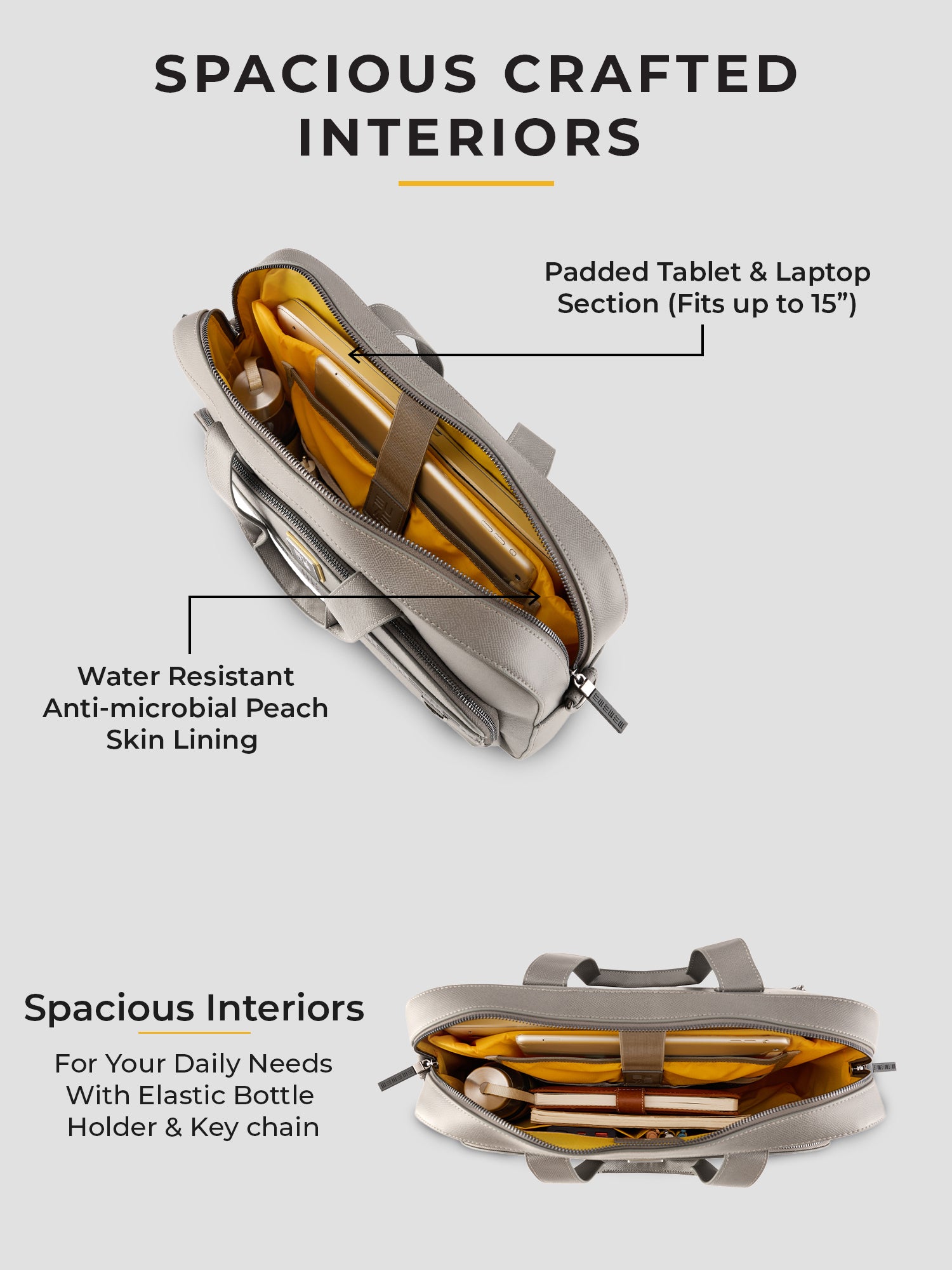 Inside, Optimo opens into a thoughtfully designed and generously spacious interior. A padded laptop and tablet compartment securely fits devices up to 15 inches, while the water-resistant, anti-microbial peach-skin lining ensures durability, protection, and a premium touch. Smart organisational details such as an elastic bottle holder and an integrated key chain keep essentials neatly in place and always within reach.